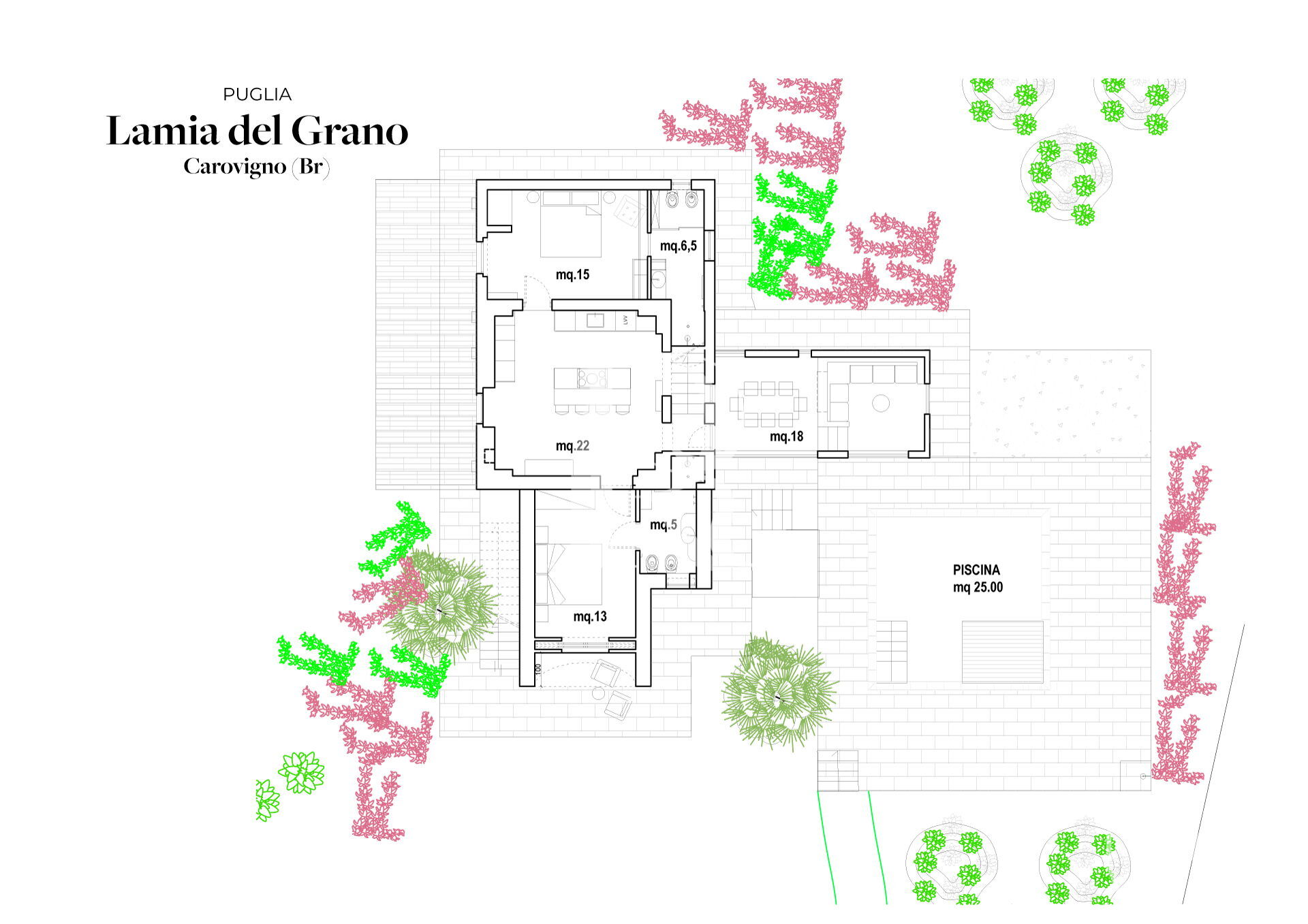 Gli interni della villa sono caratterizzati da un'eleganza raffinata che si fonde armoniosamente con l'atmosfera rustica della Puglia.I vostri momenti all'aperto saranno arricchiti da un ampio terreno circondato da alberi da frutto, creando il contesto perfetto per la piscina esclusiva a vostra disposizione, completa di un soleggiato solarium. La posizione centrale di Lamia del Grano nella regione della Puglia vi offre la possibilità di esplorare comodamente le numerose attrazioni naturalistiche e storiche della zona.