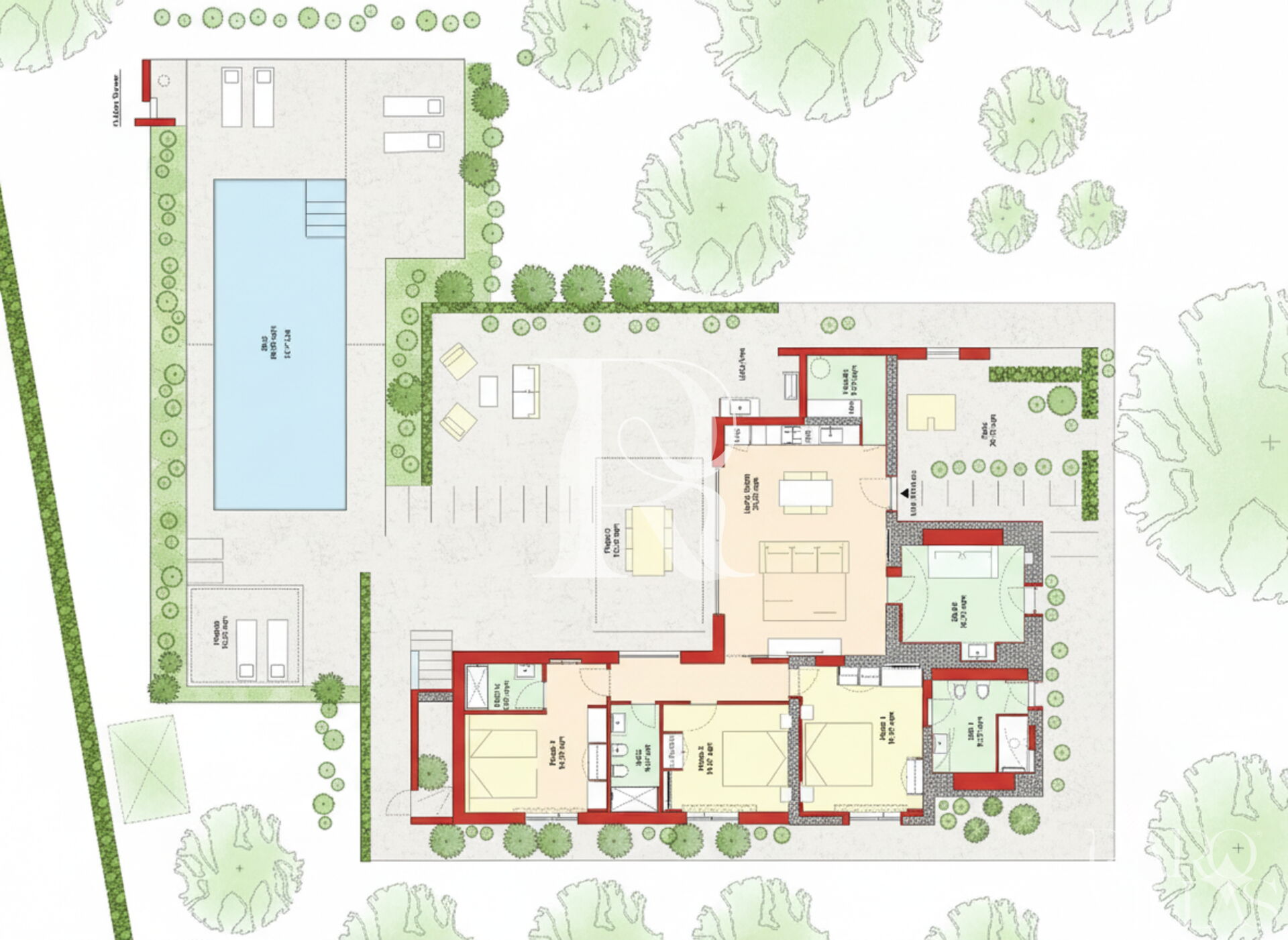 La villa è pensata per garantire il massimo comfort e privacy:- Camera da Letto con Bagno Ensuite 1 (25 m²): Un lussuoso letto matrimoniale King Size (1,8m x 2m), con uscita diretta sul giardino. Il bagno privato include bidet e doccia.