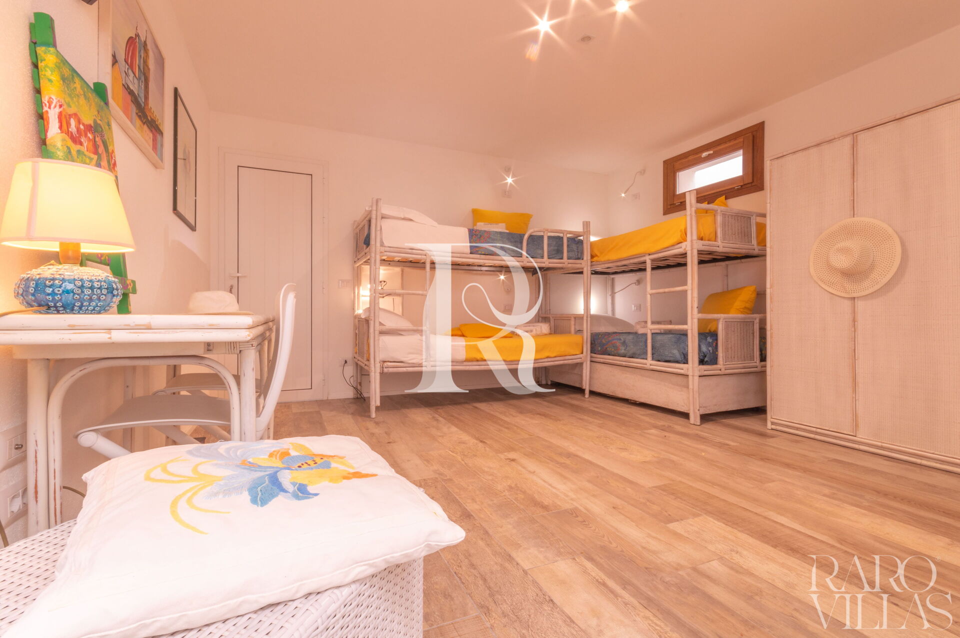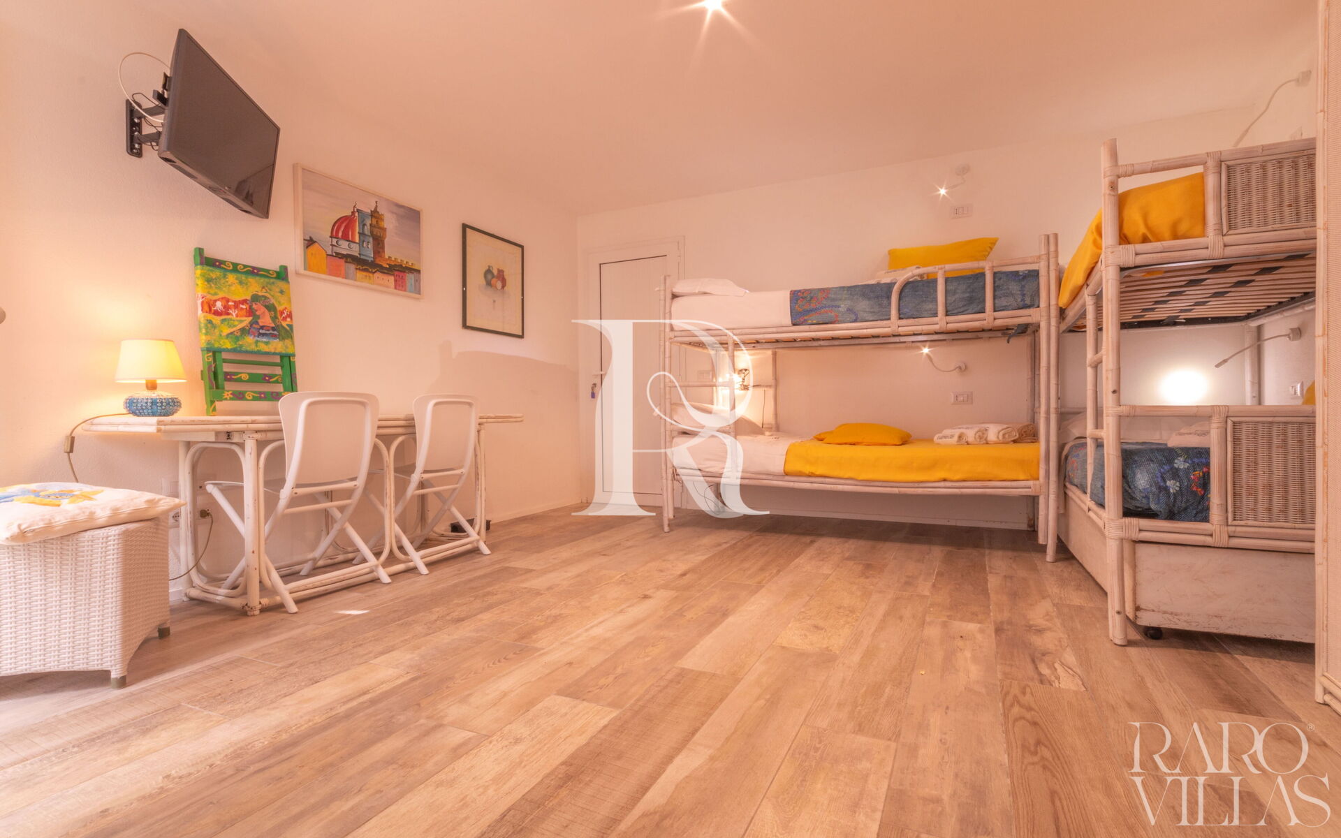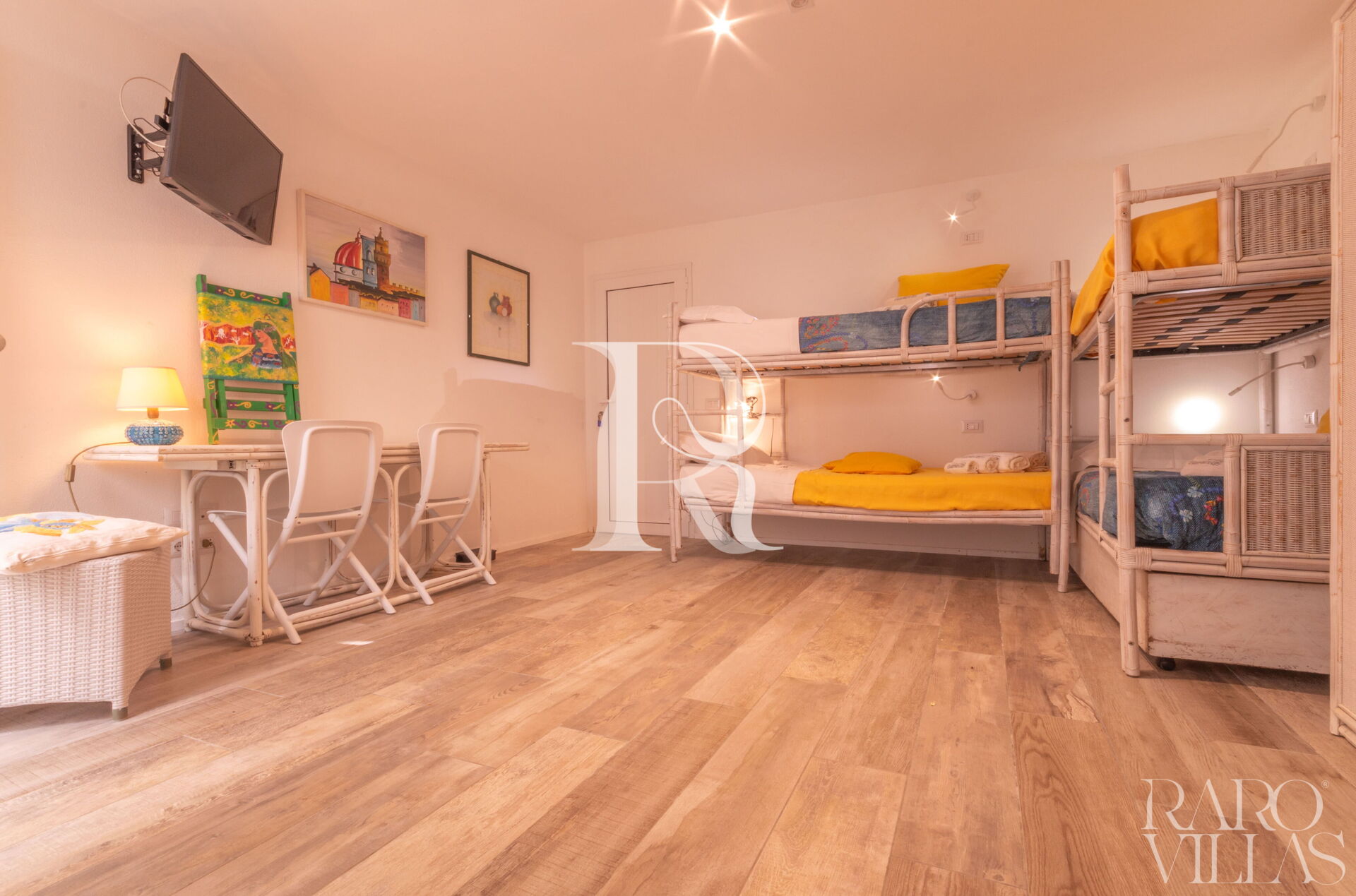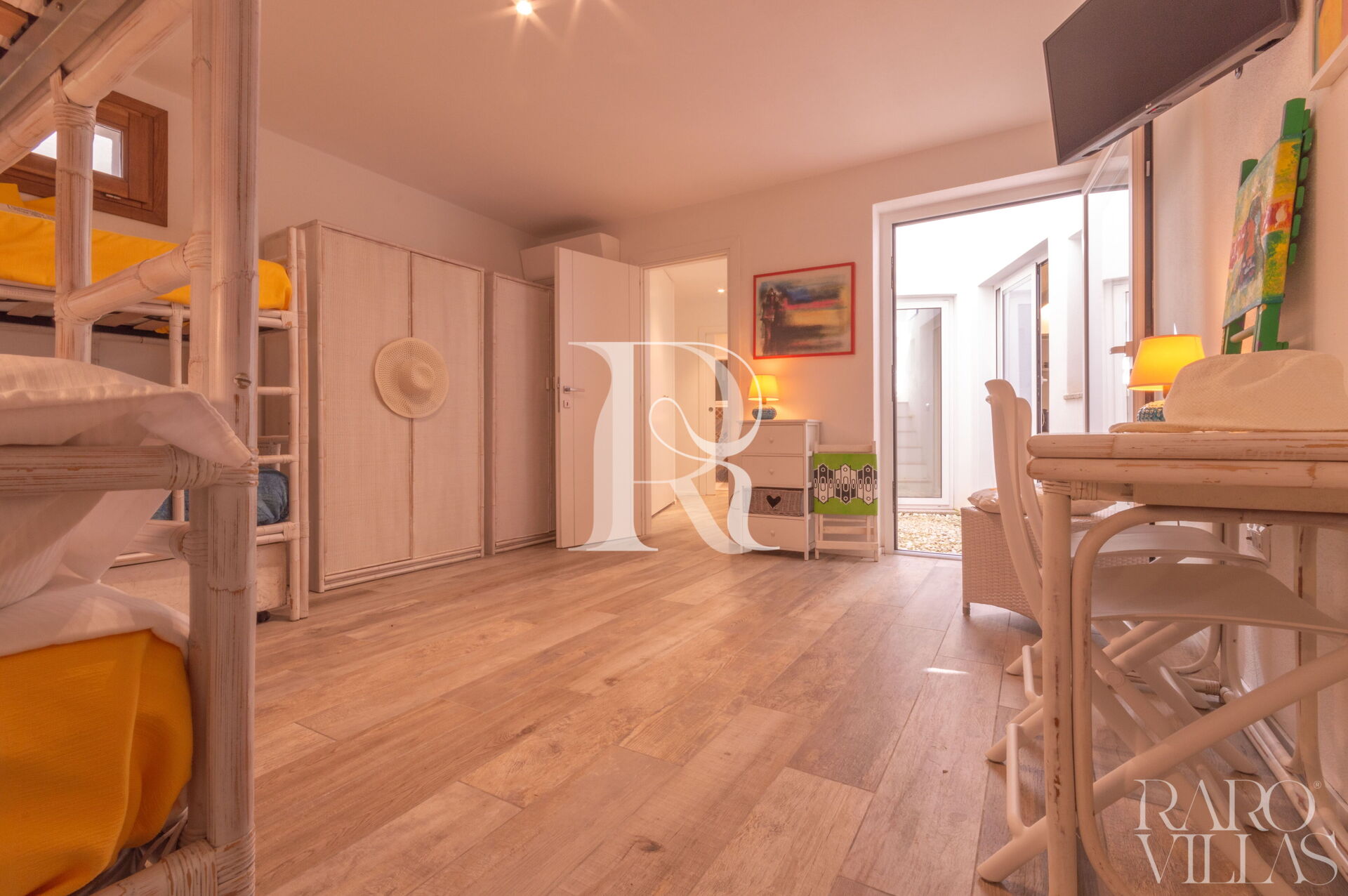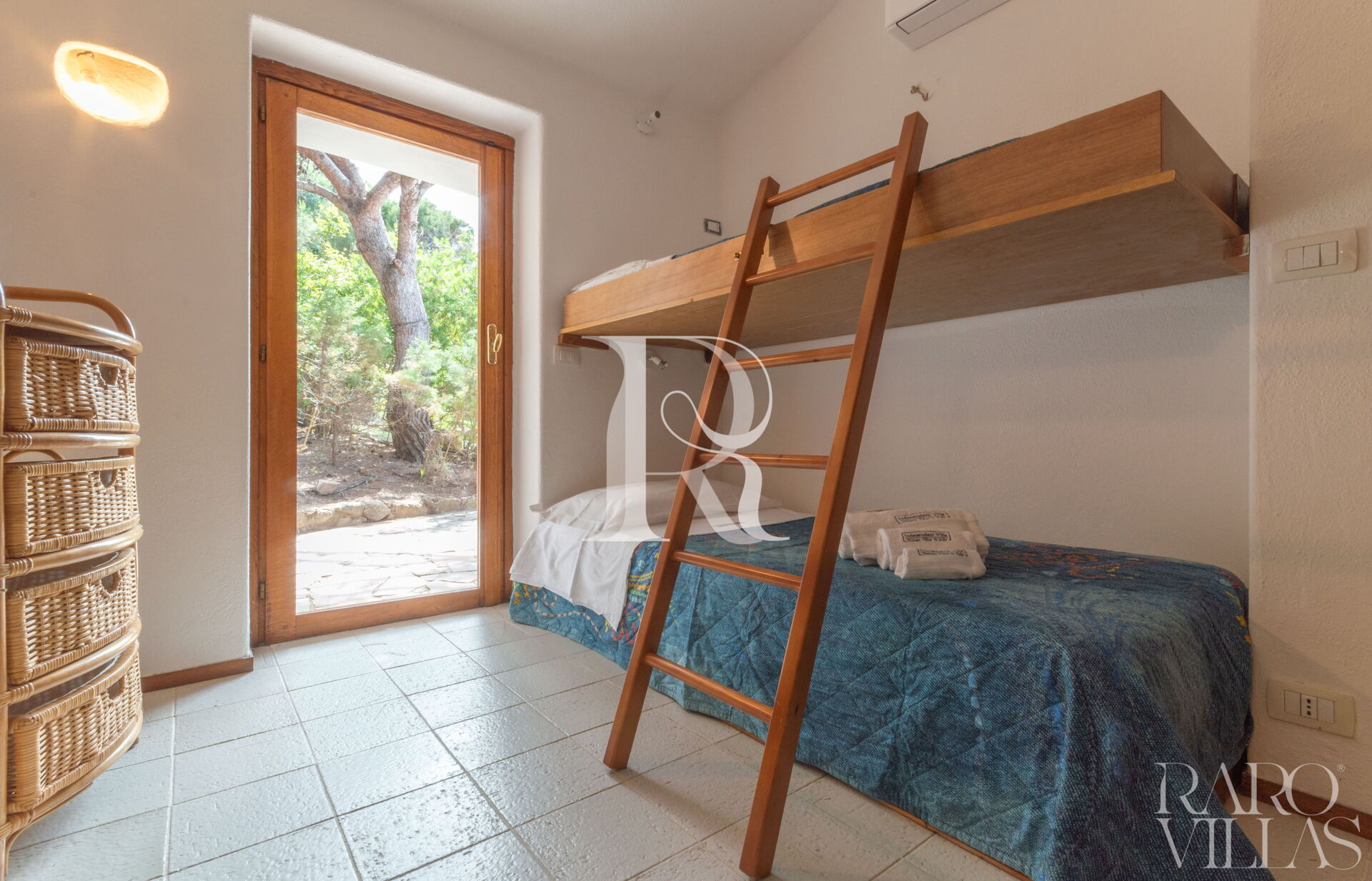 - Camere: 1 camera matrimoniale con AC, bagno ensuite e cabina armadio; 1 camera con doppio letto a castello + 1 estraibile con AC e bagno esterno con doccia.