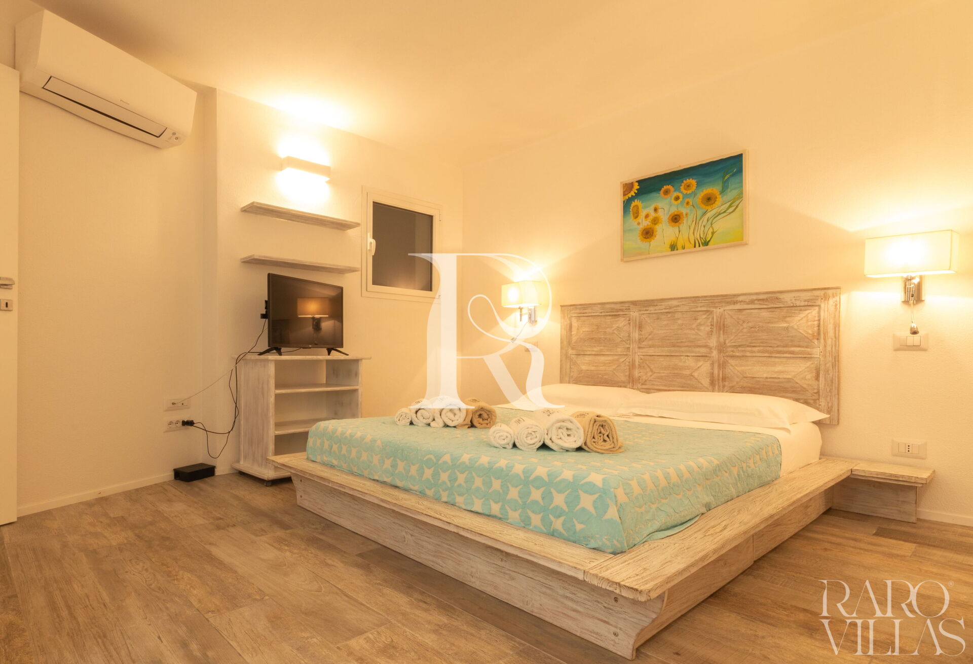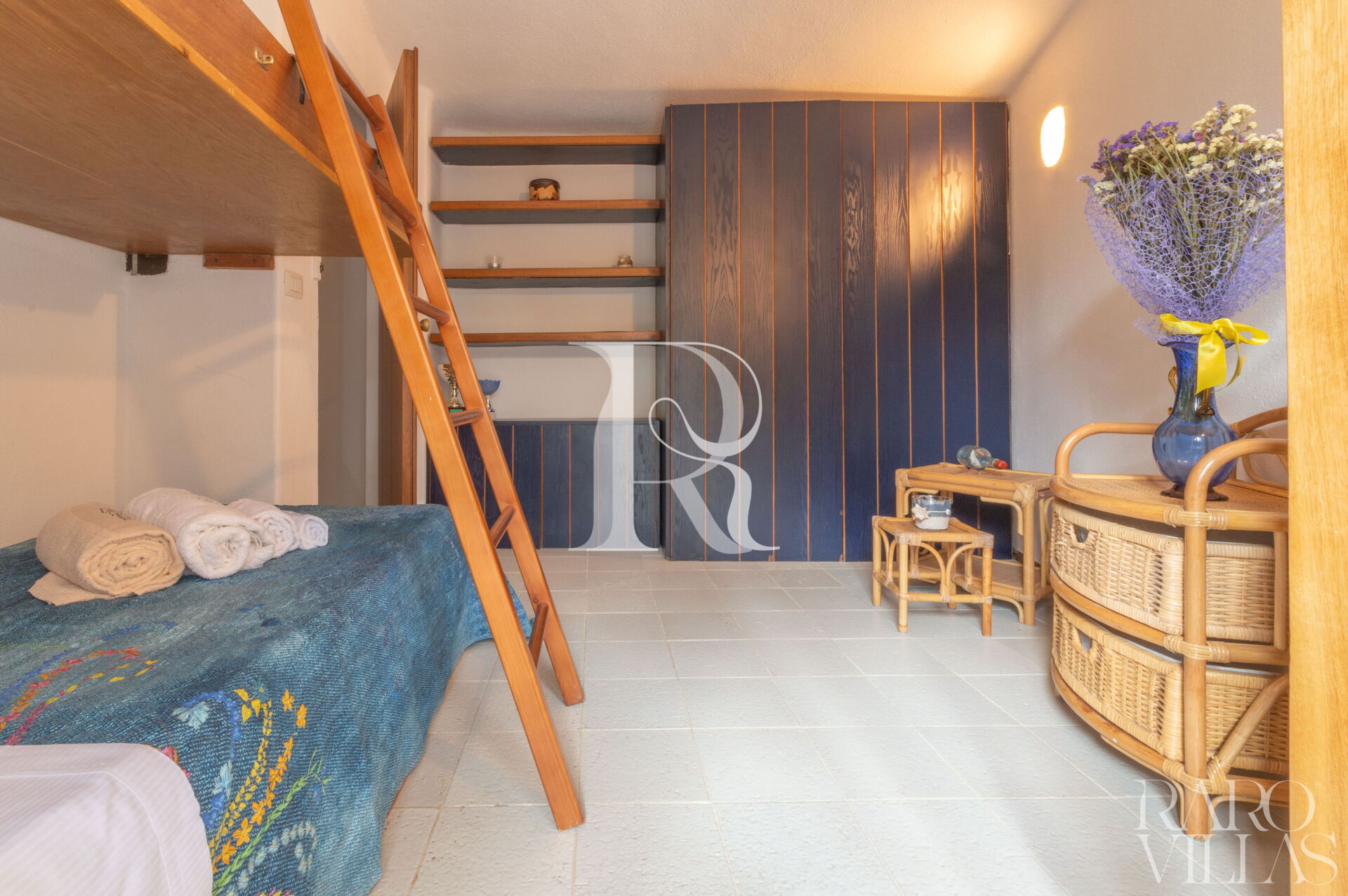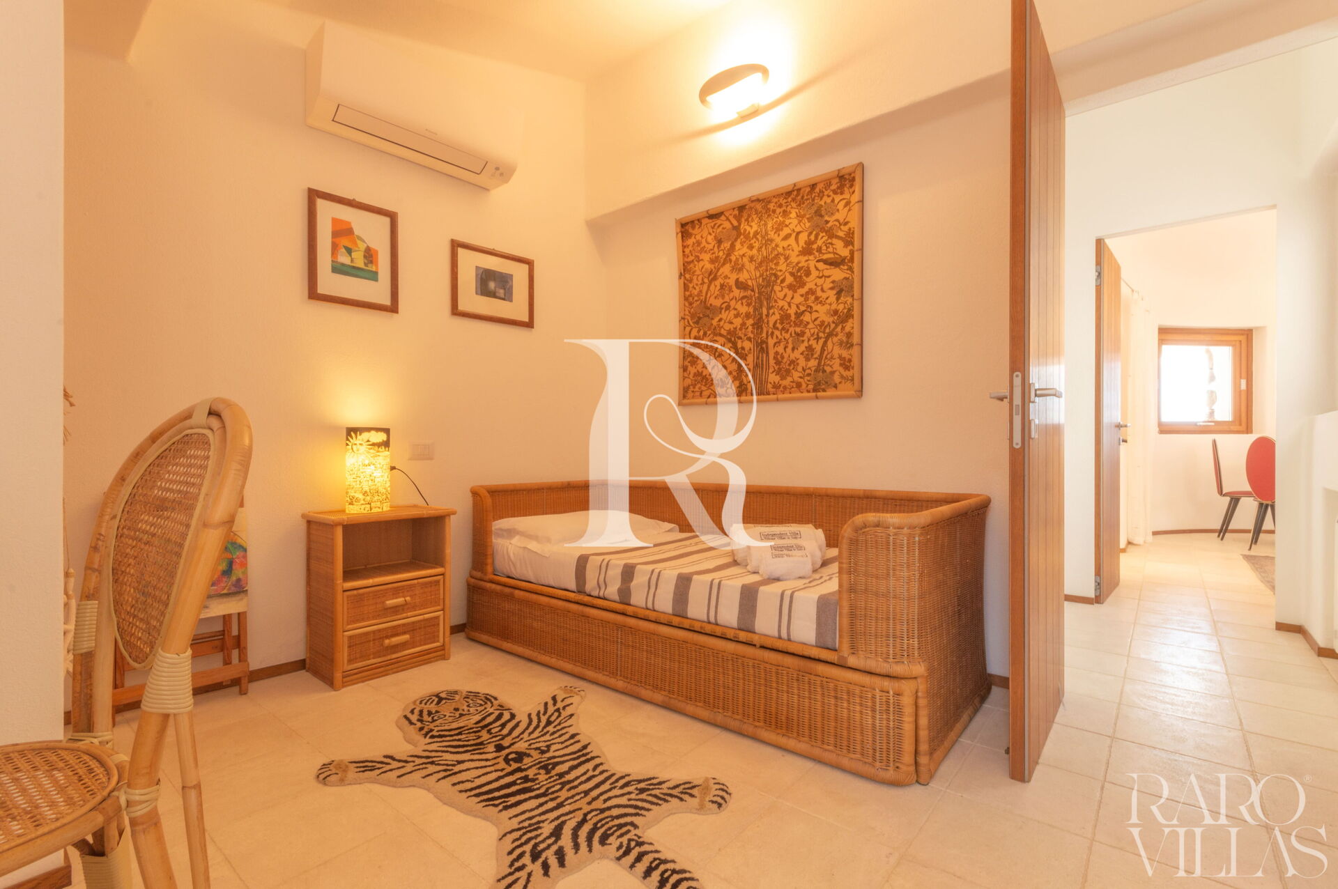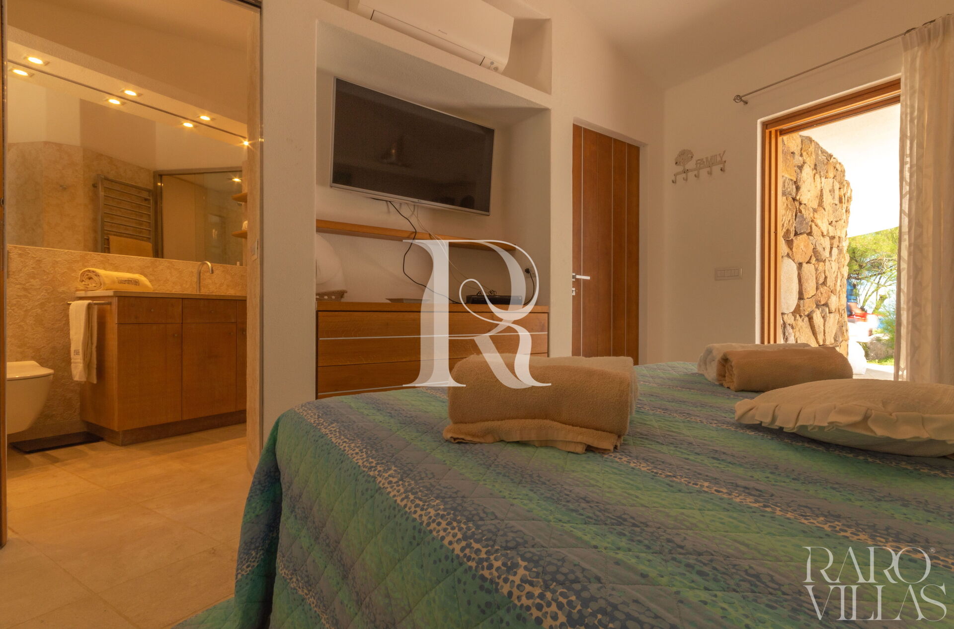- Camere: 1 camera matrimoniale con AC, bagno ensuite e cabina armadio; 1 camera con doppio letto a castello + 1 estraibile con AC e bagno esterno con doccia.