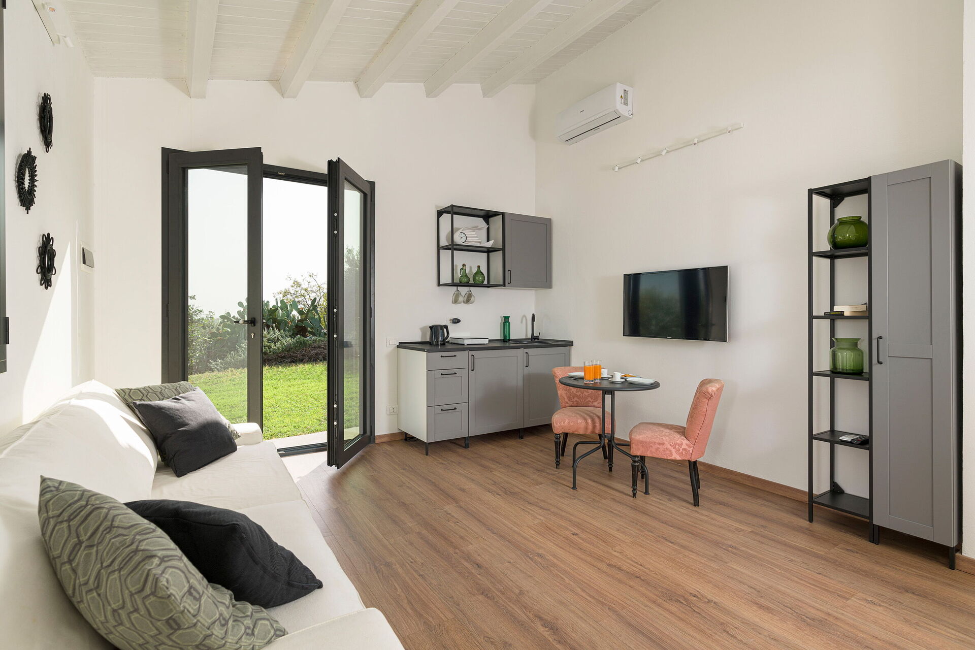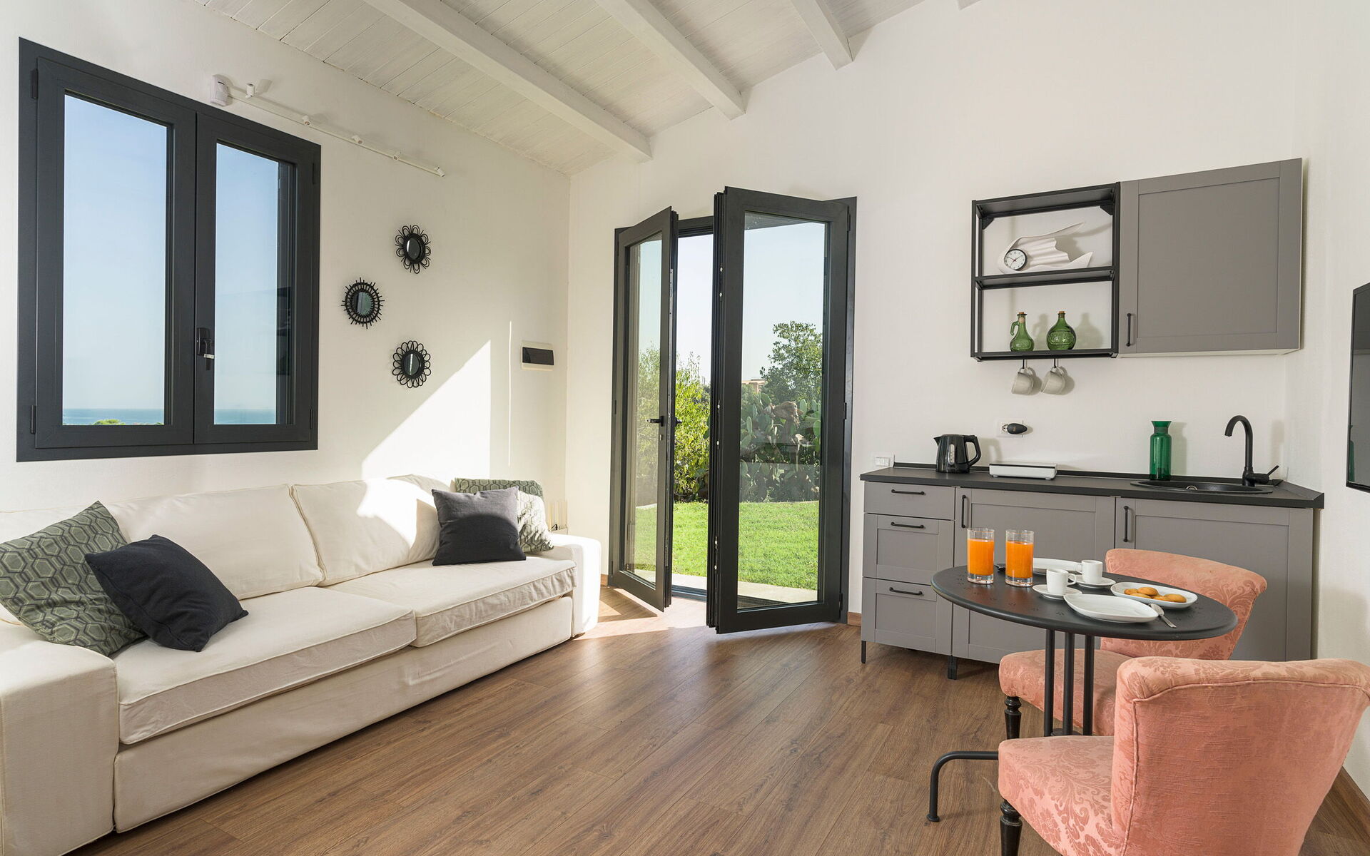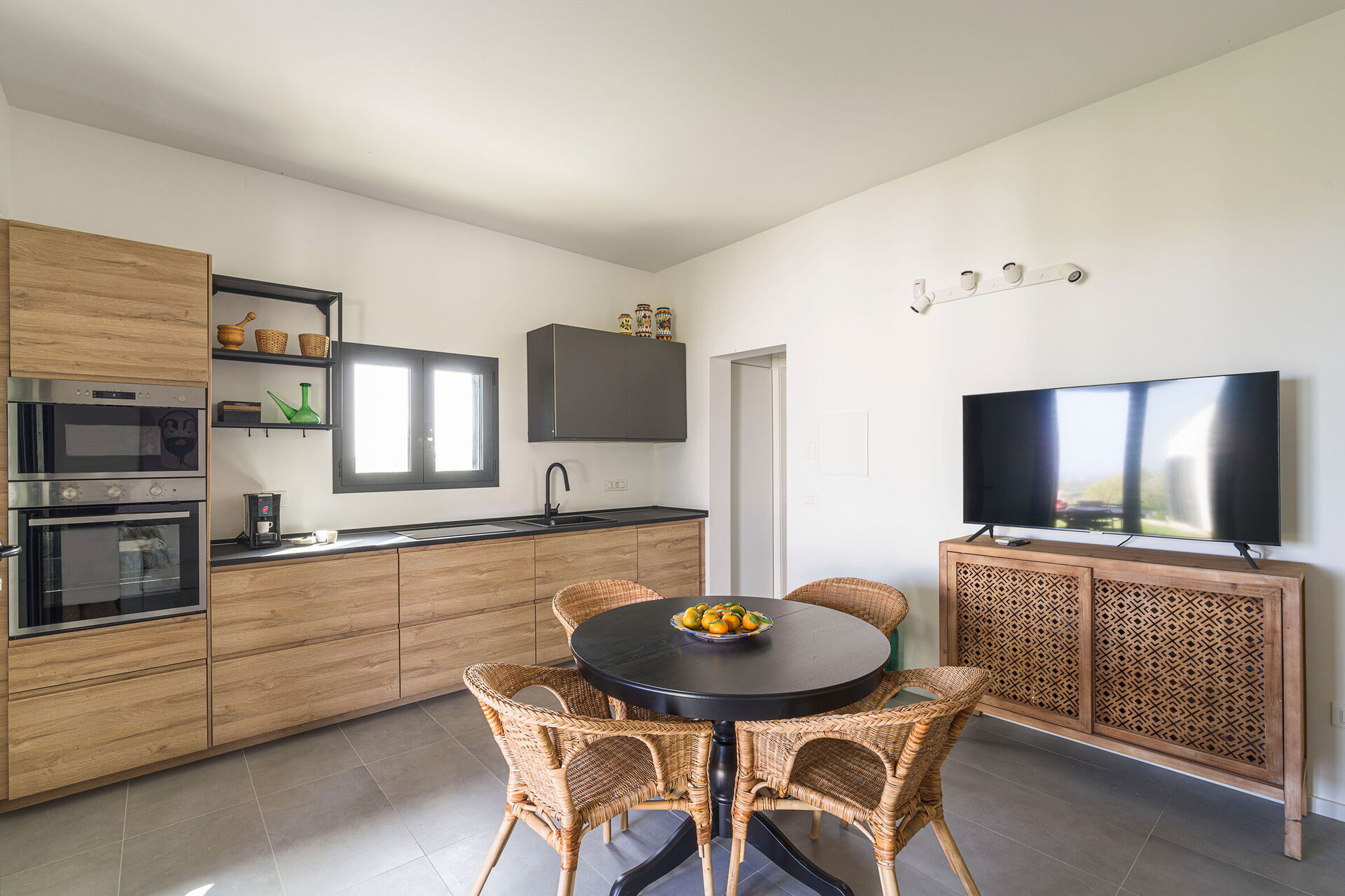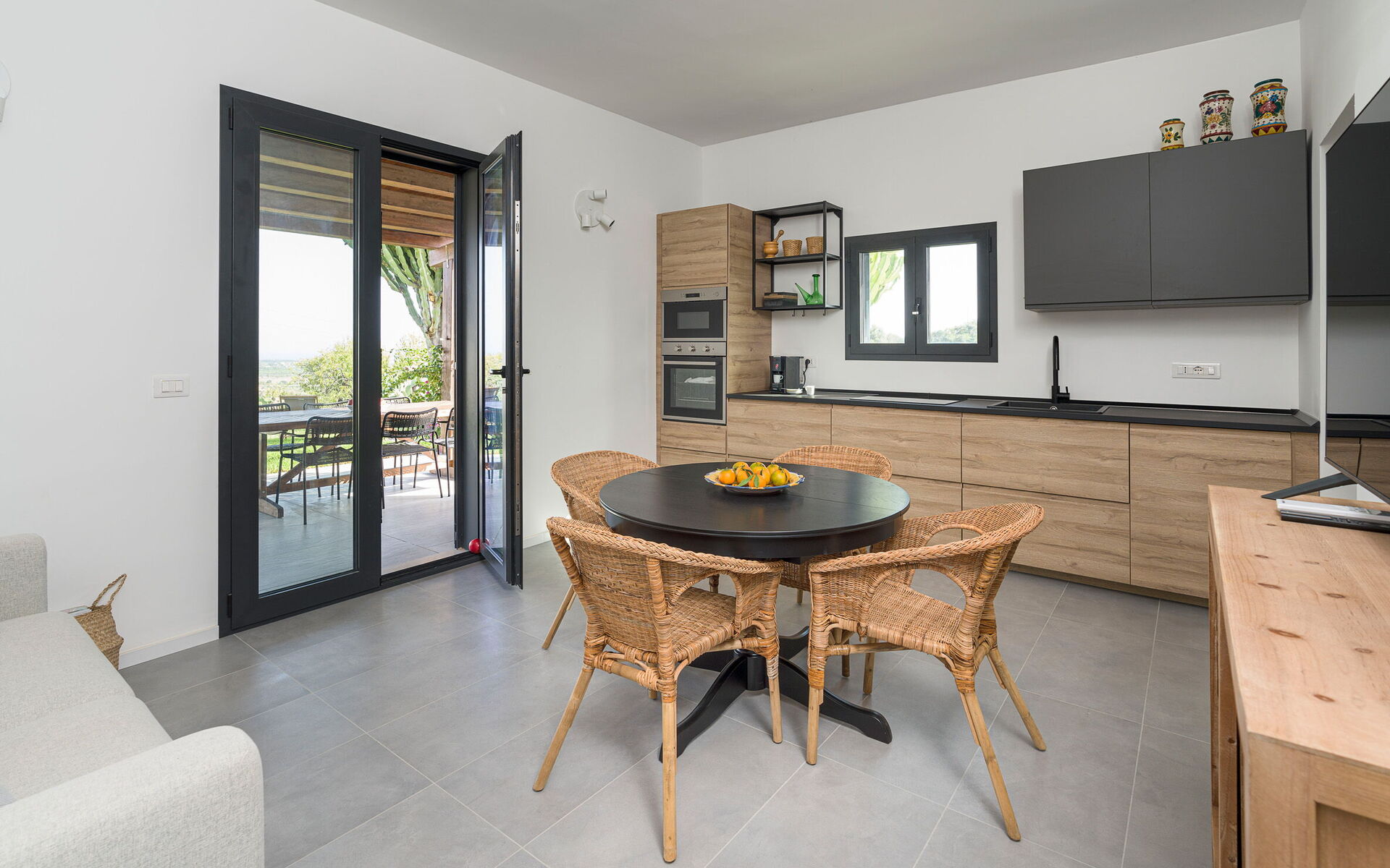 Cucina - soggiorno: cucina ben attrezzata, tavolo da pranzo, lavastoviglie, frigo, freezer, microonde, piano cottura, forno, tostapane, ferro da stiro, macchina da caffè (italiana), macchina da caffè americano, divano, culla, internet WIFI, internet, aria condizionata, televisione, rilevatore di fumo, uscita sul patio.