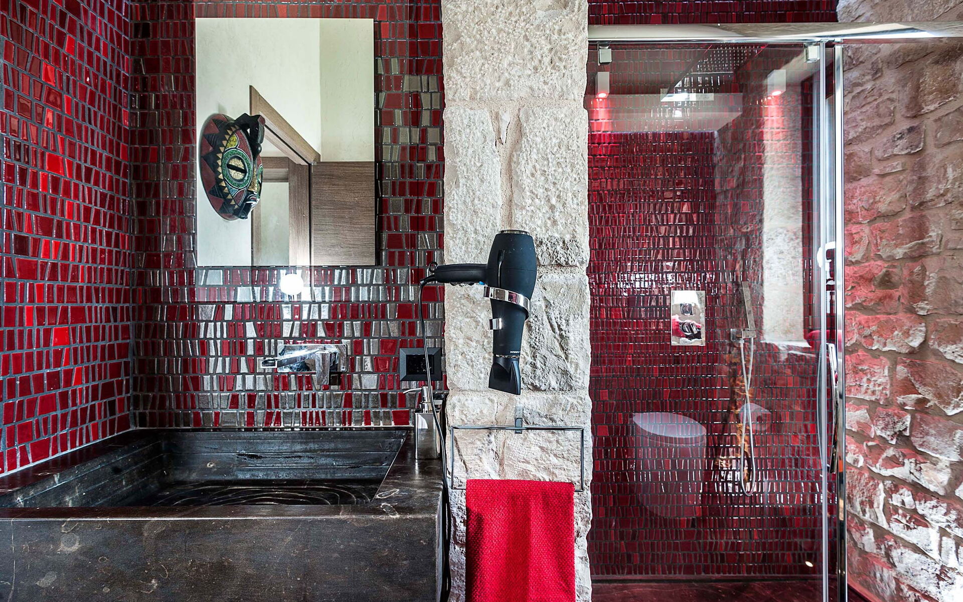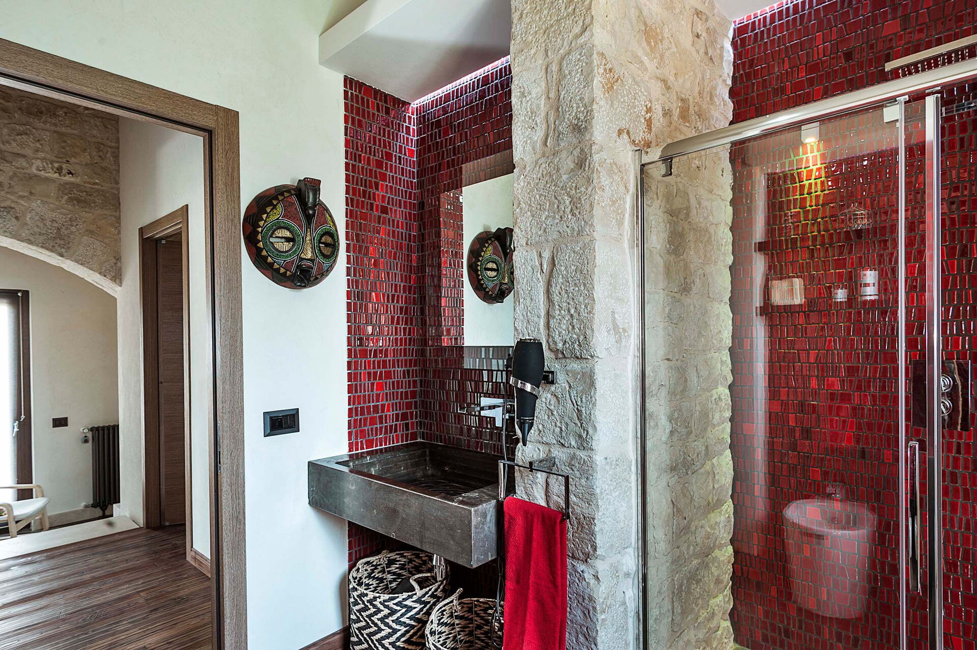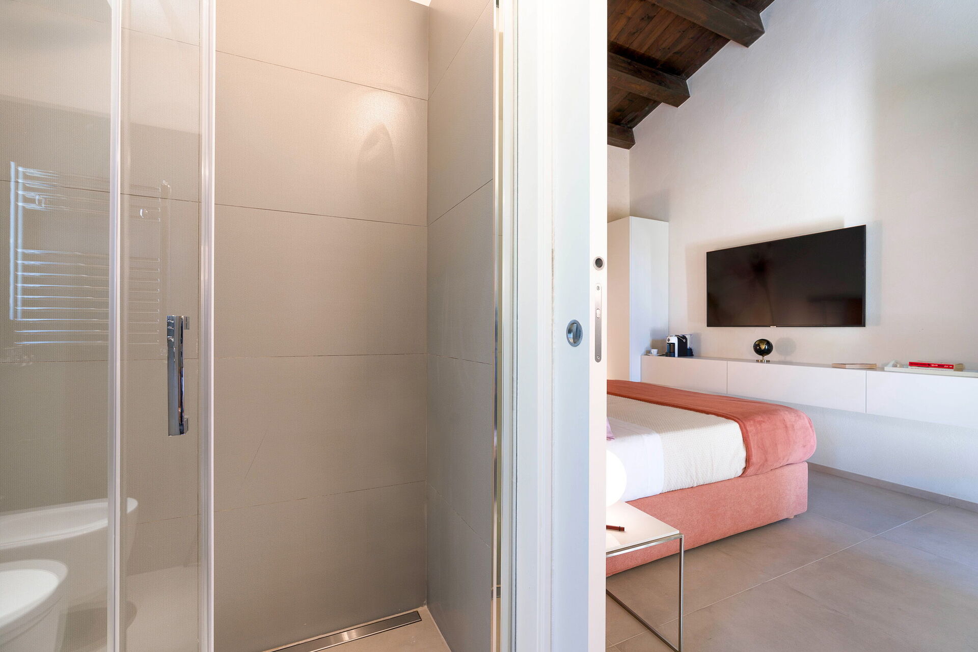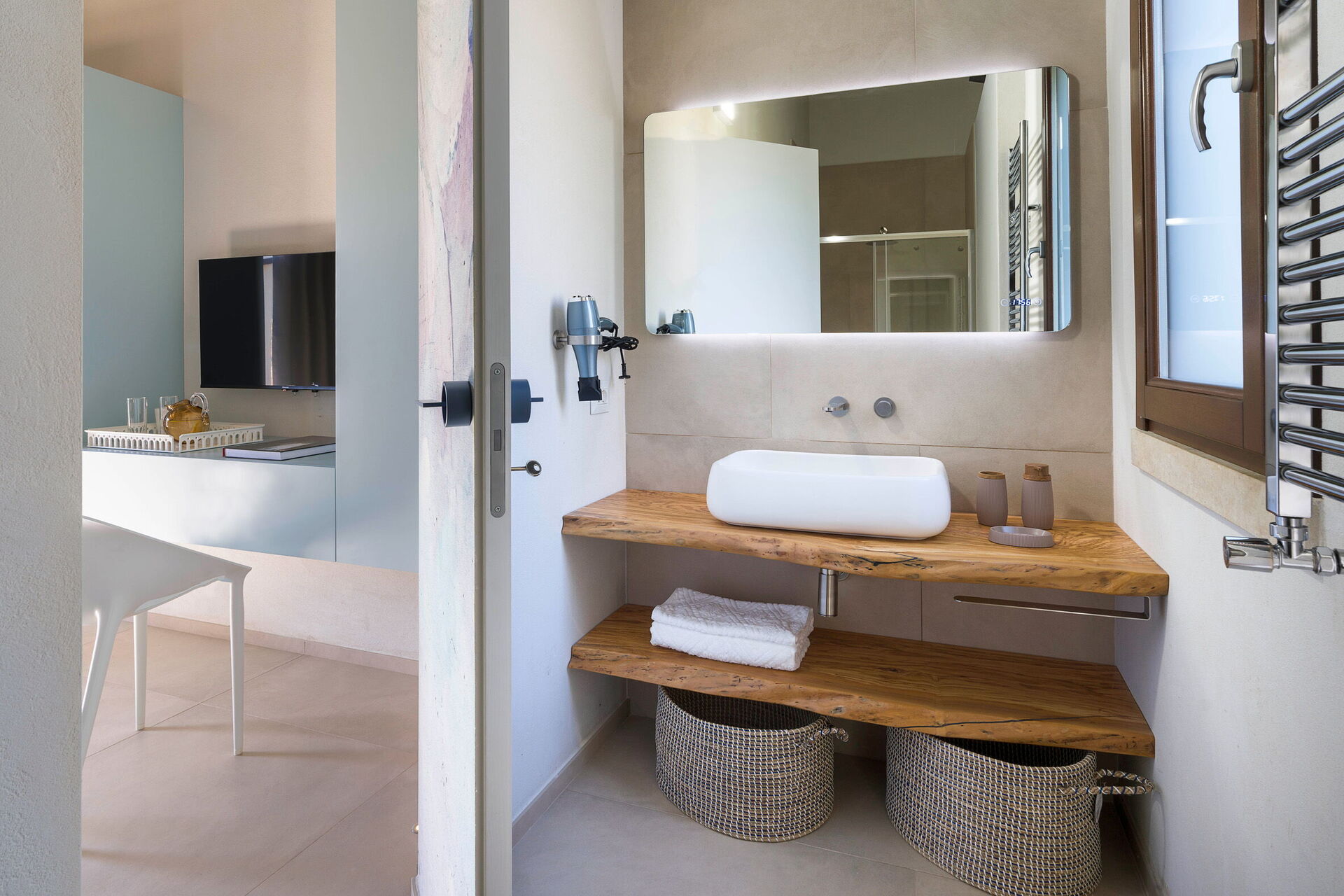 Camera da letto con bagno 1: letto matrimoniale, internet WIFI, internet, aria condizionata, zanzariere, lavandino, wc, bidet, doccia, uscita sul giardino.