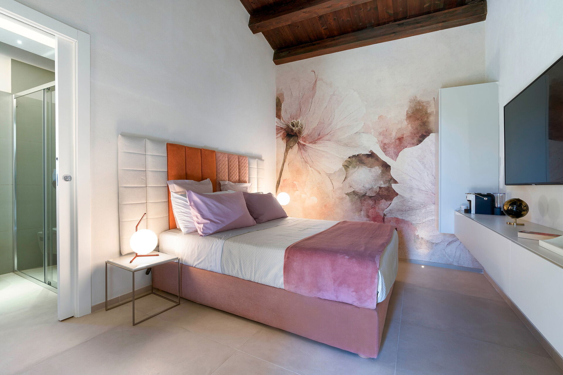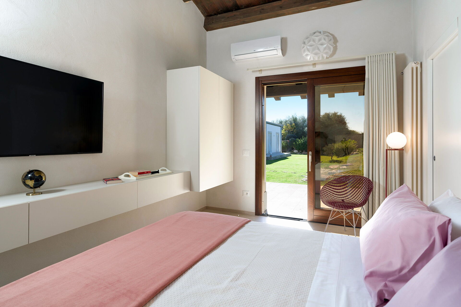 Camera da letto con bagno 2: letto matrimoniale, internet WIFI, internet, aria condizionata, zanzariere, wc, bidet, doccia, uscita sul giardino.