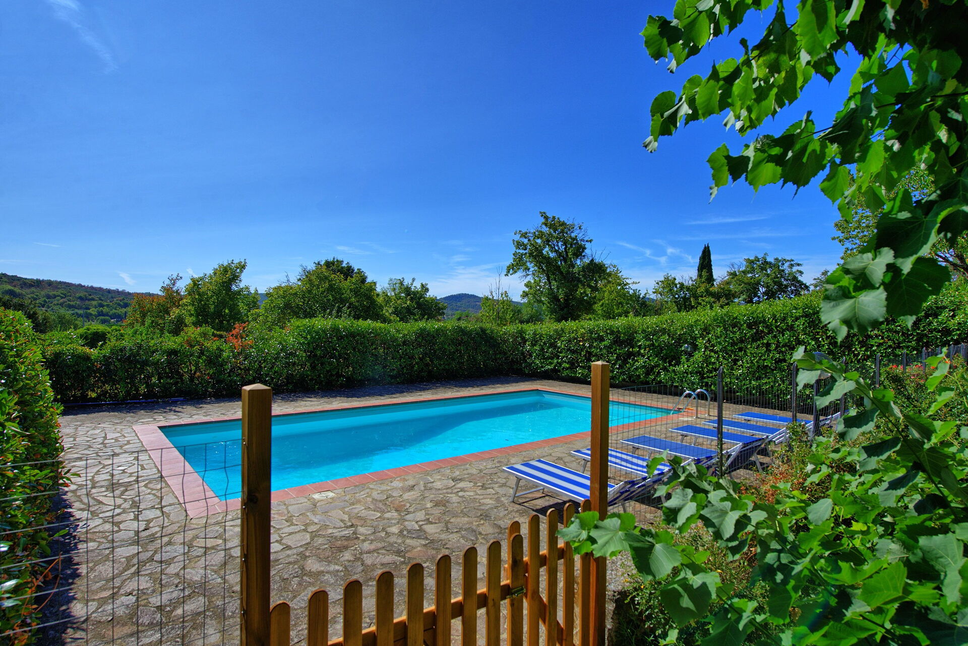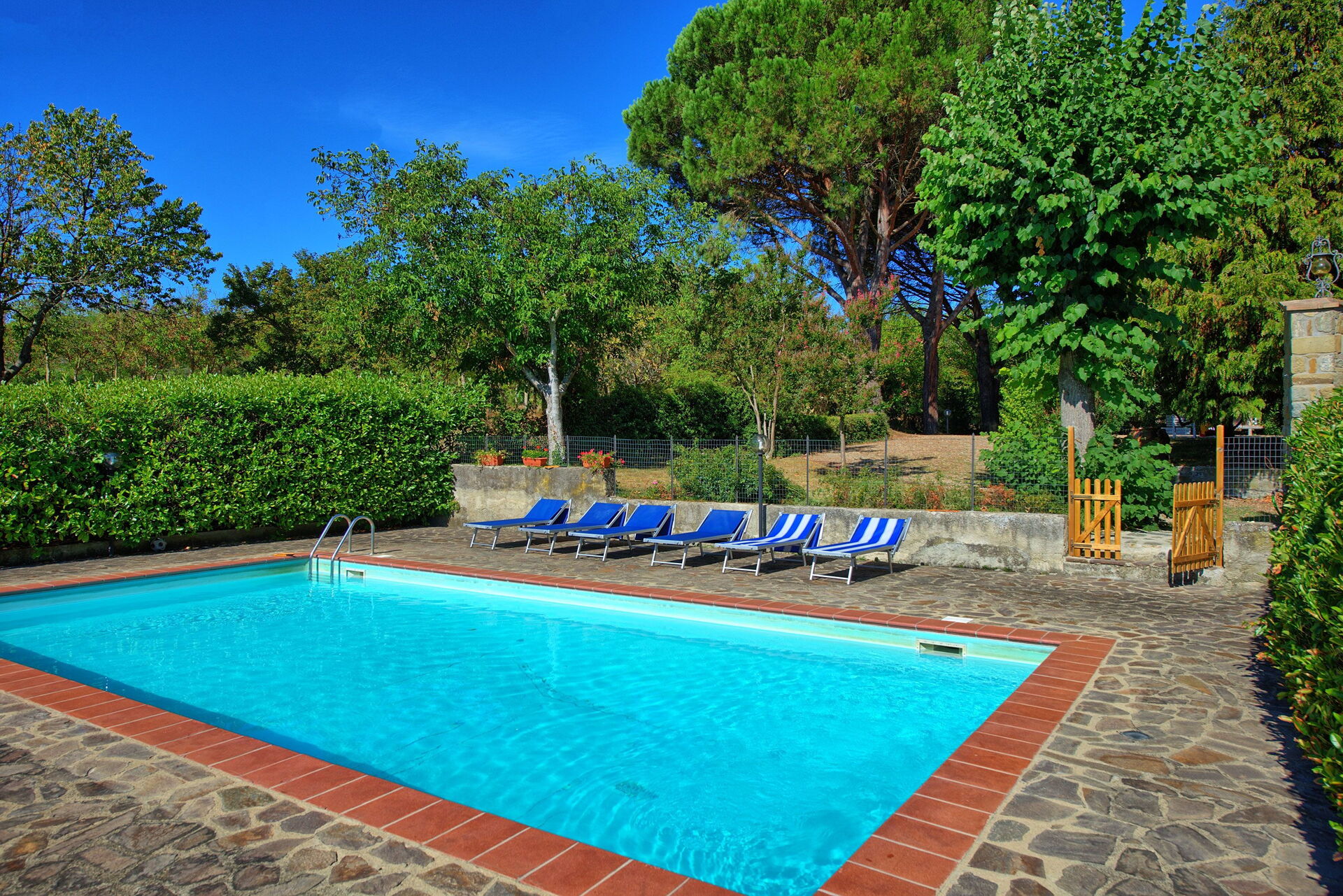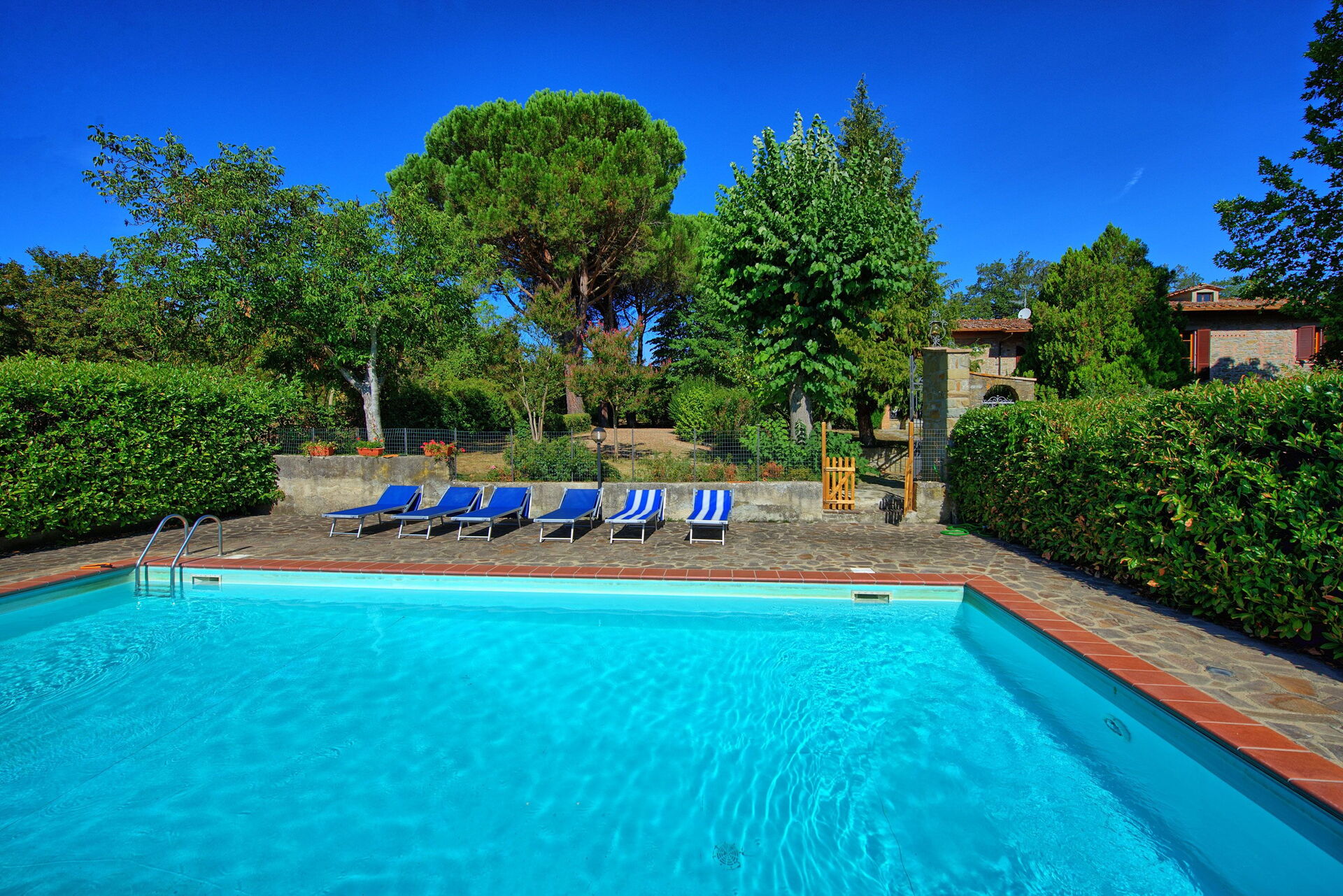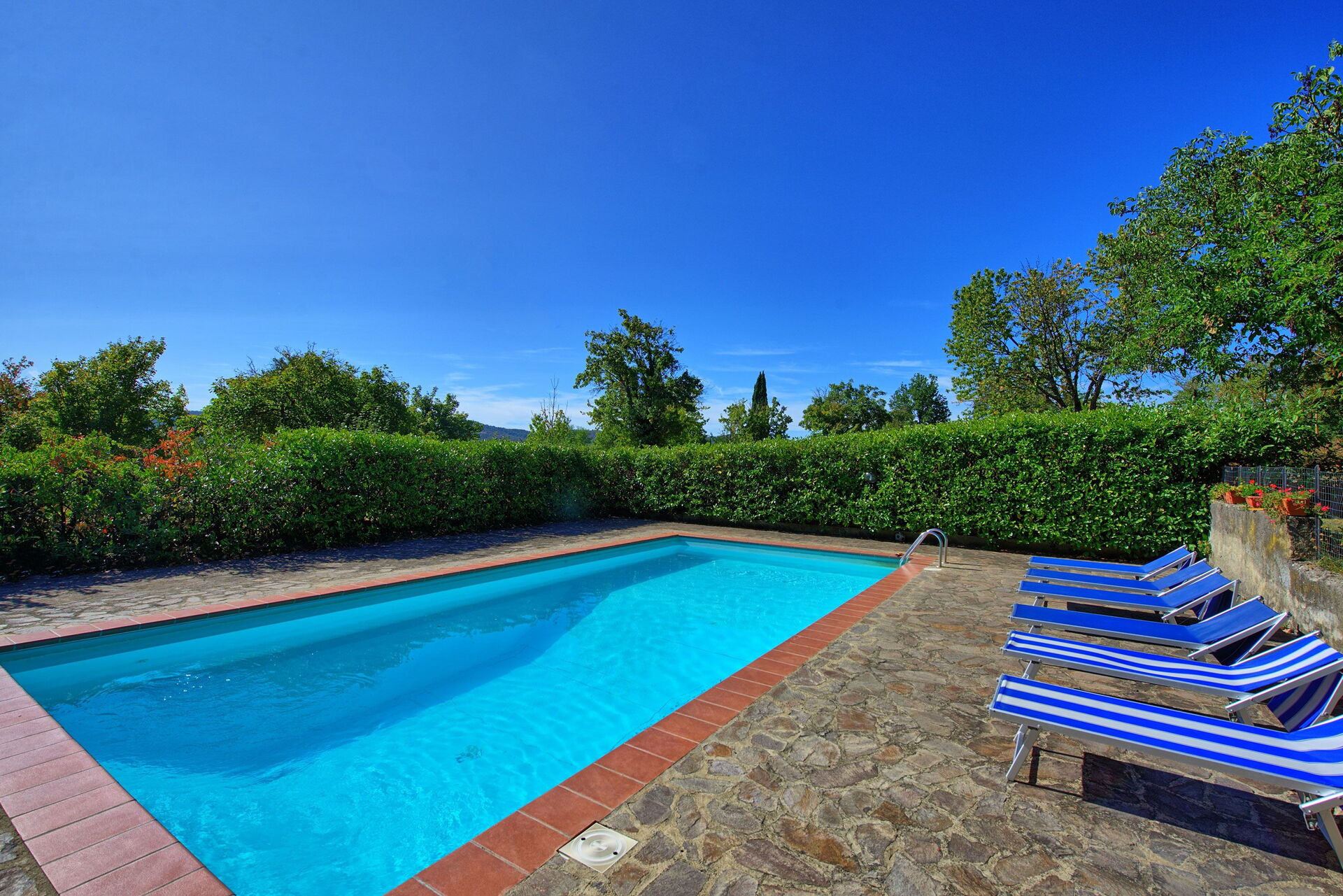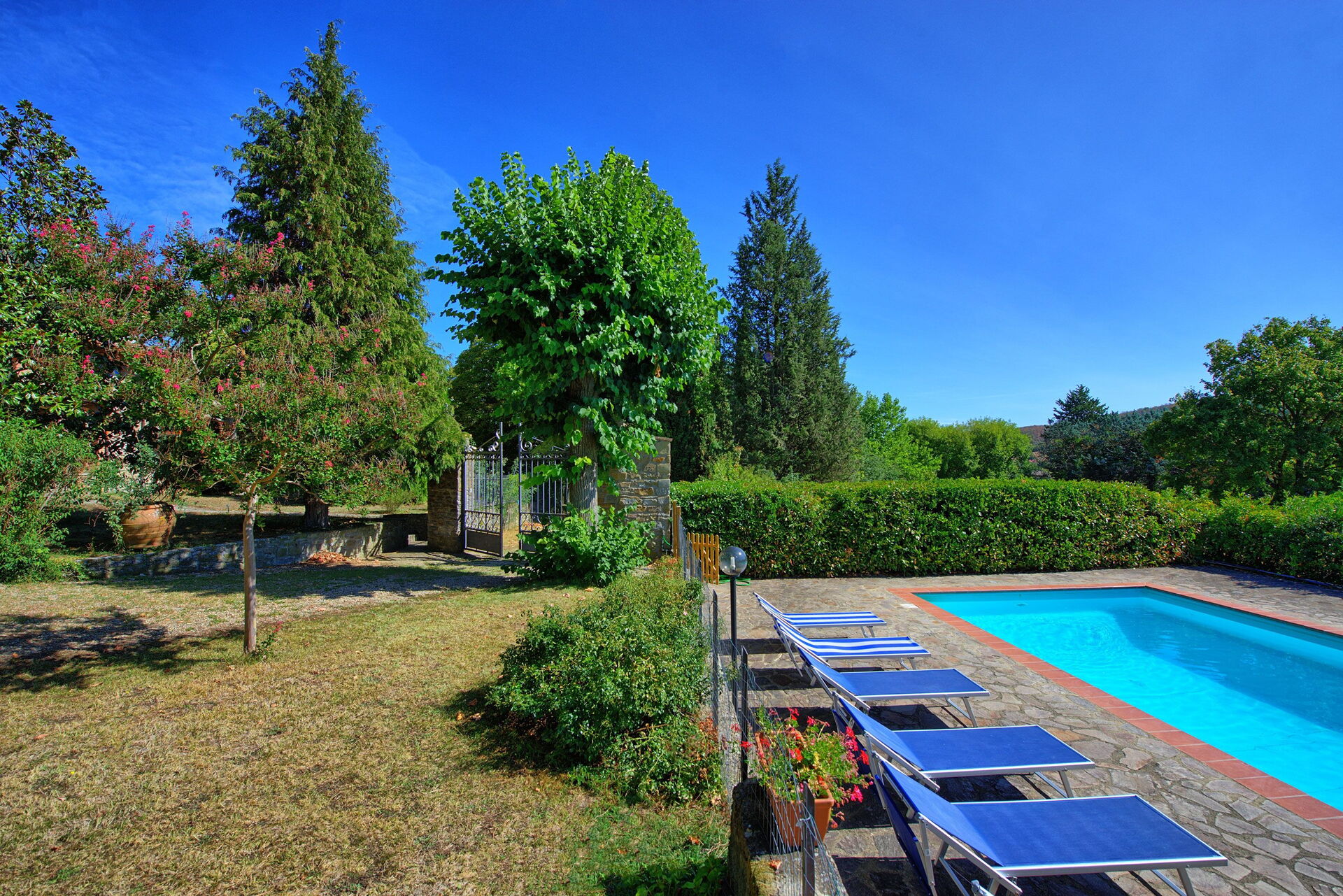 Attorno alla casa si trova un bel parco-giardino completamente recintato ed in parte ombreggiato da alberi secolari con piscina privata e recintata, dotata di solarium con lettini, un luogo fantastico per rilassarsi e prendere il sole nelle calde giornate estive. Vi è inoltre un'area barbecue, dotata di tavoli, sedie e panchine per poter mangiare all'aperto e godersi la vista panoramica sulle colline del Chianti in compagnia di amici e familiari.