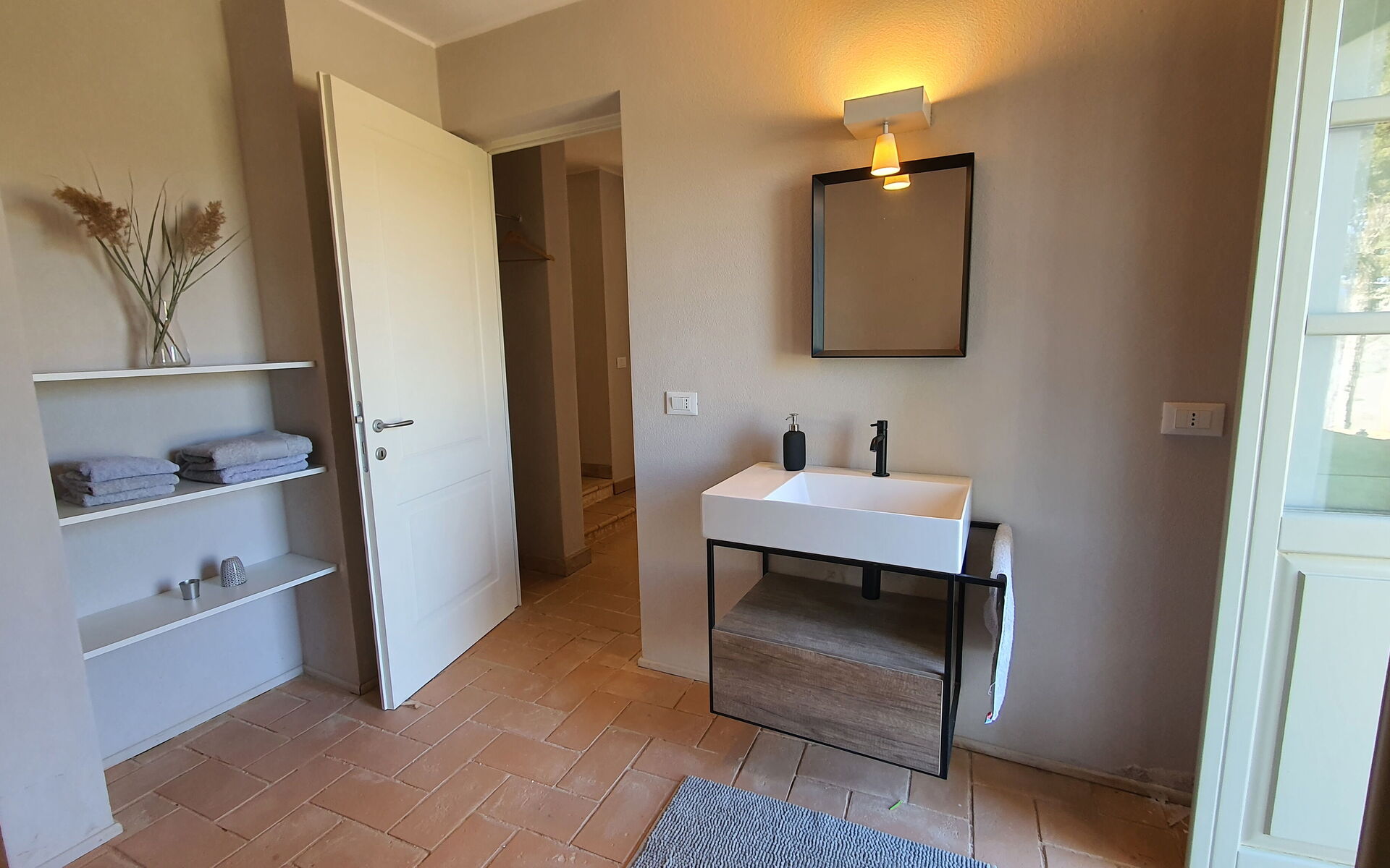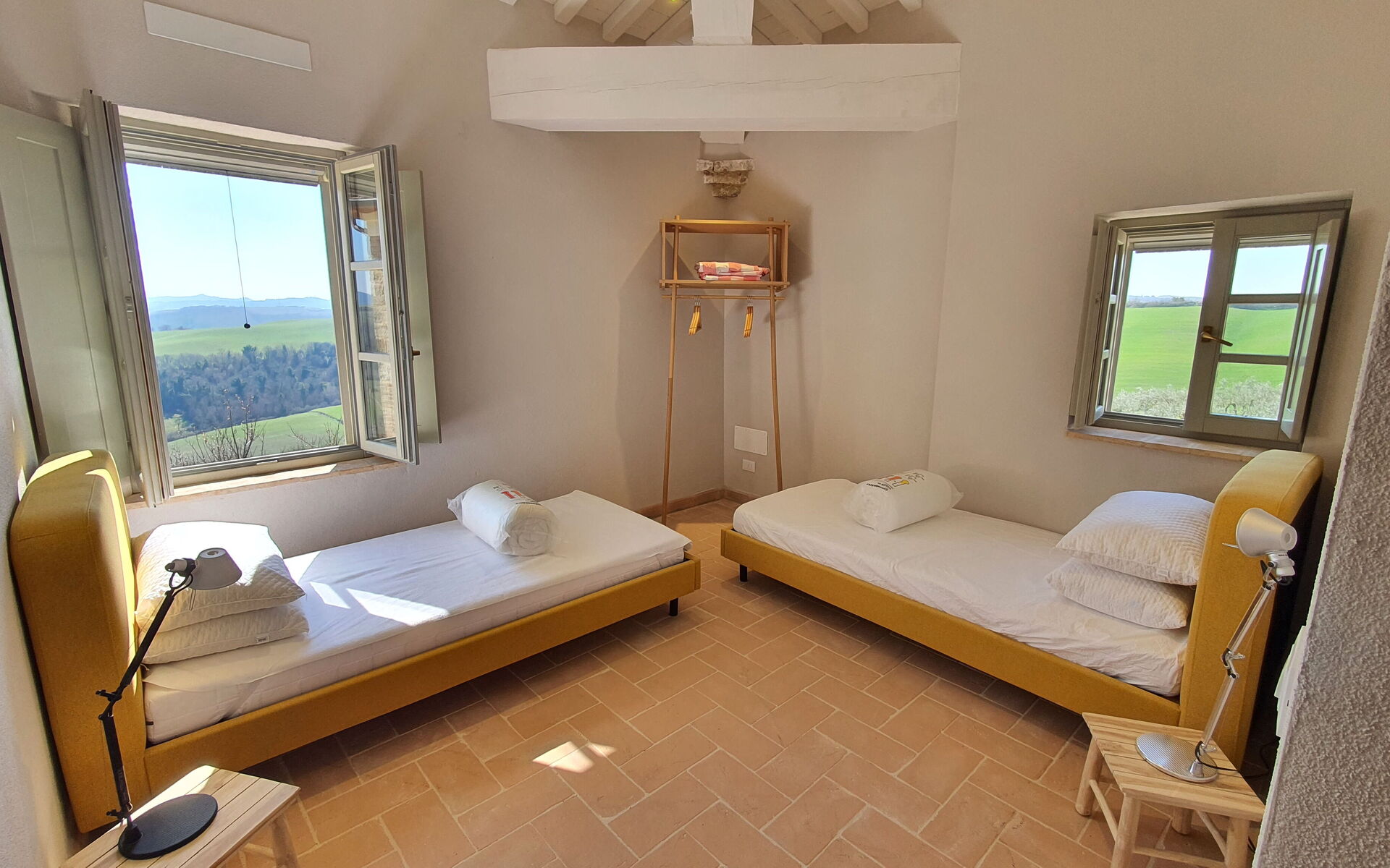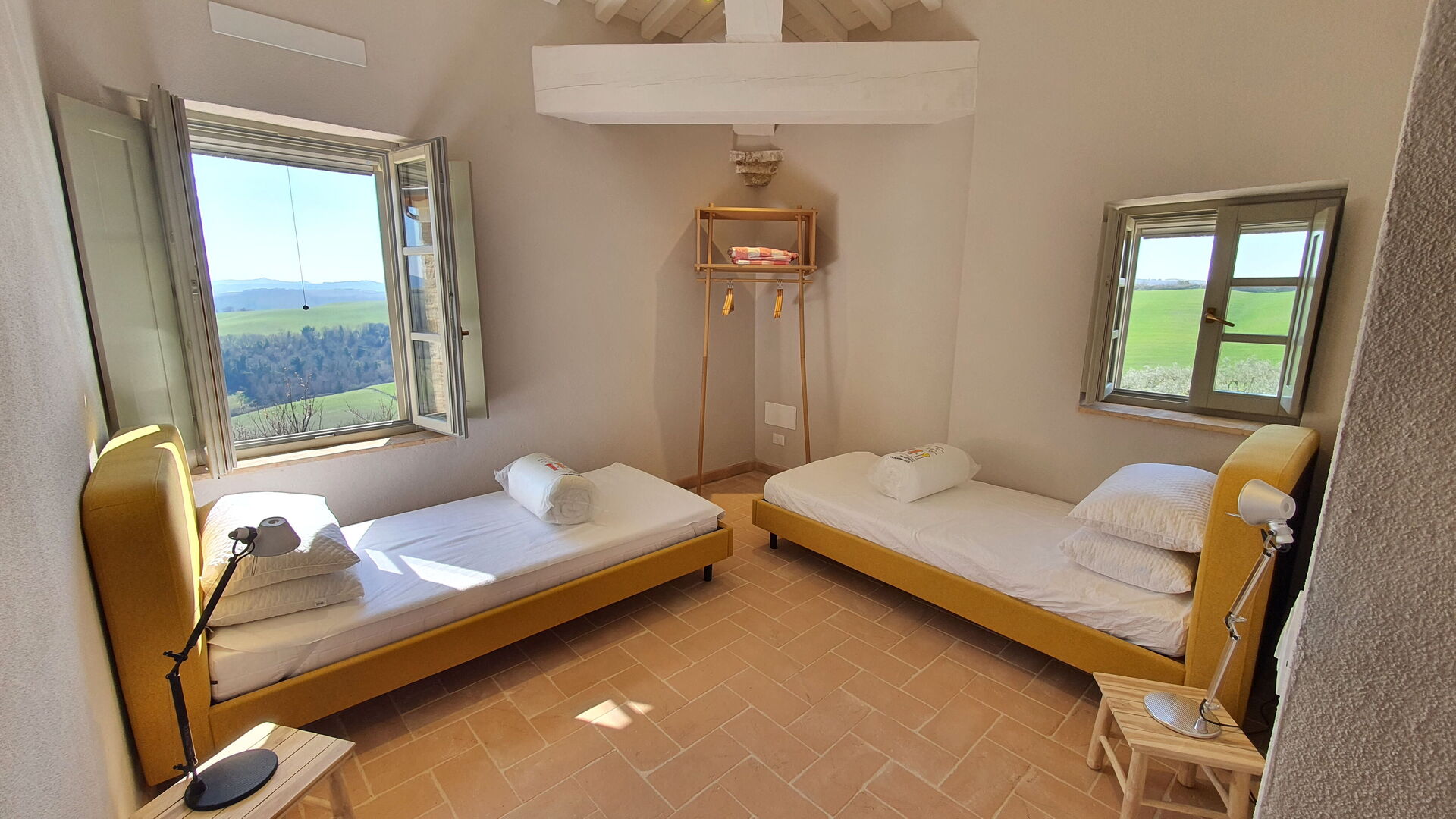 Camera da letto con bagno 2 (20 m2): due letti singoli (larghezza: 1.6m, lunghezza: 1.8m), aria condizionata, lavandino, wc, bidet, doccia, asciugacapelli.