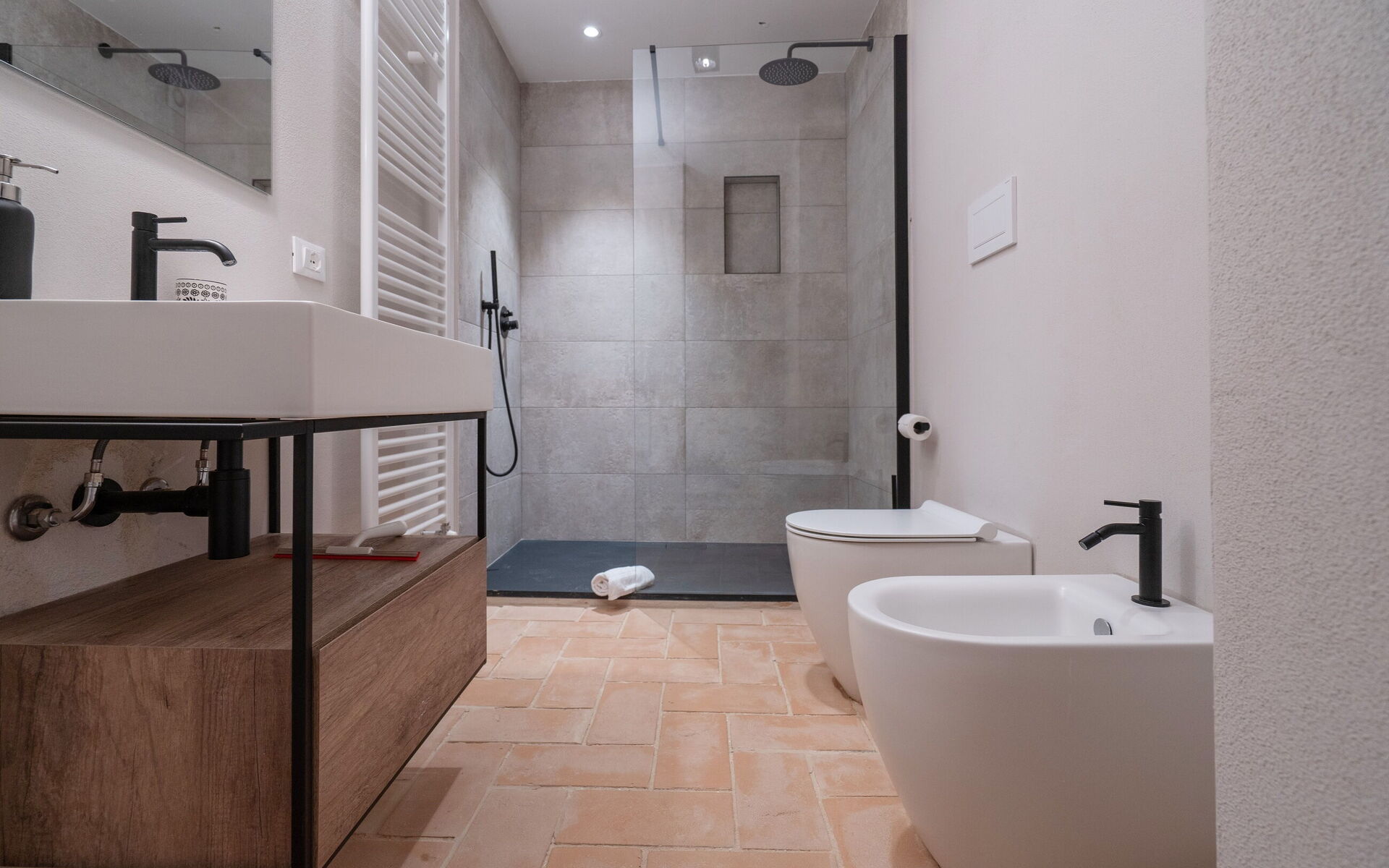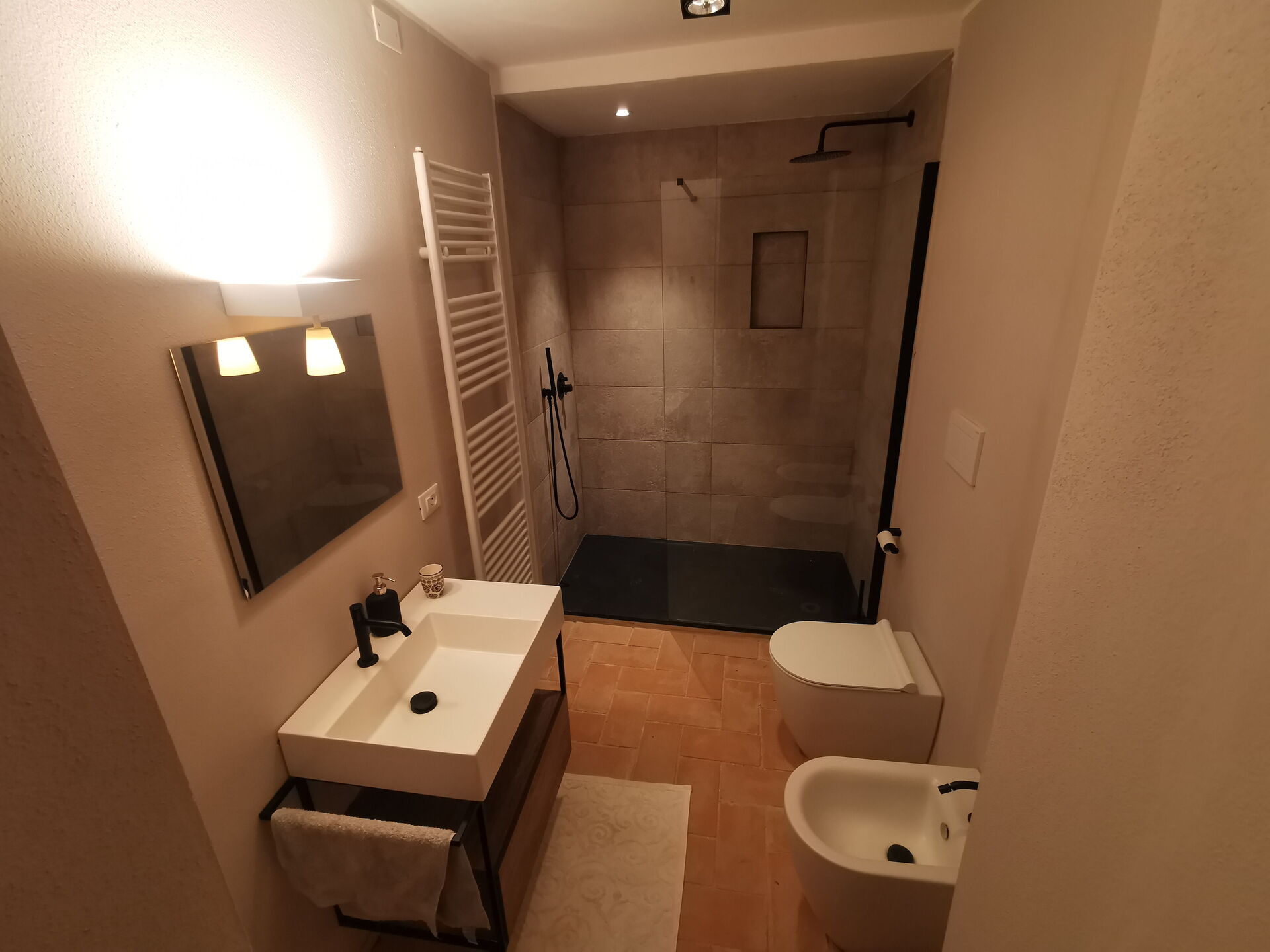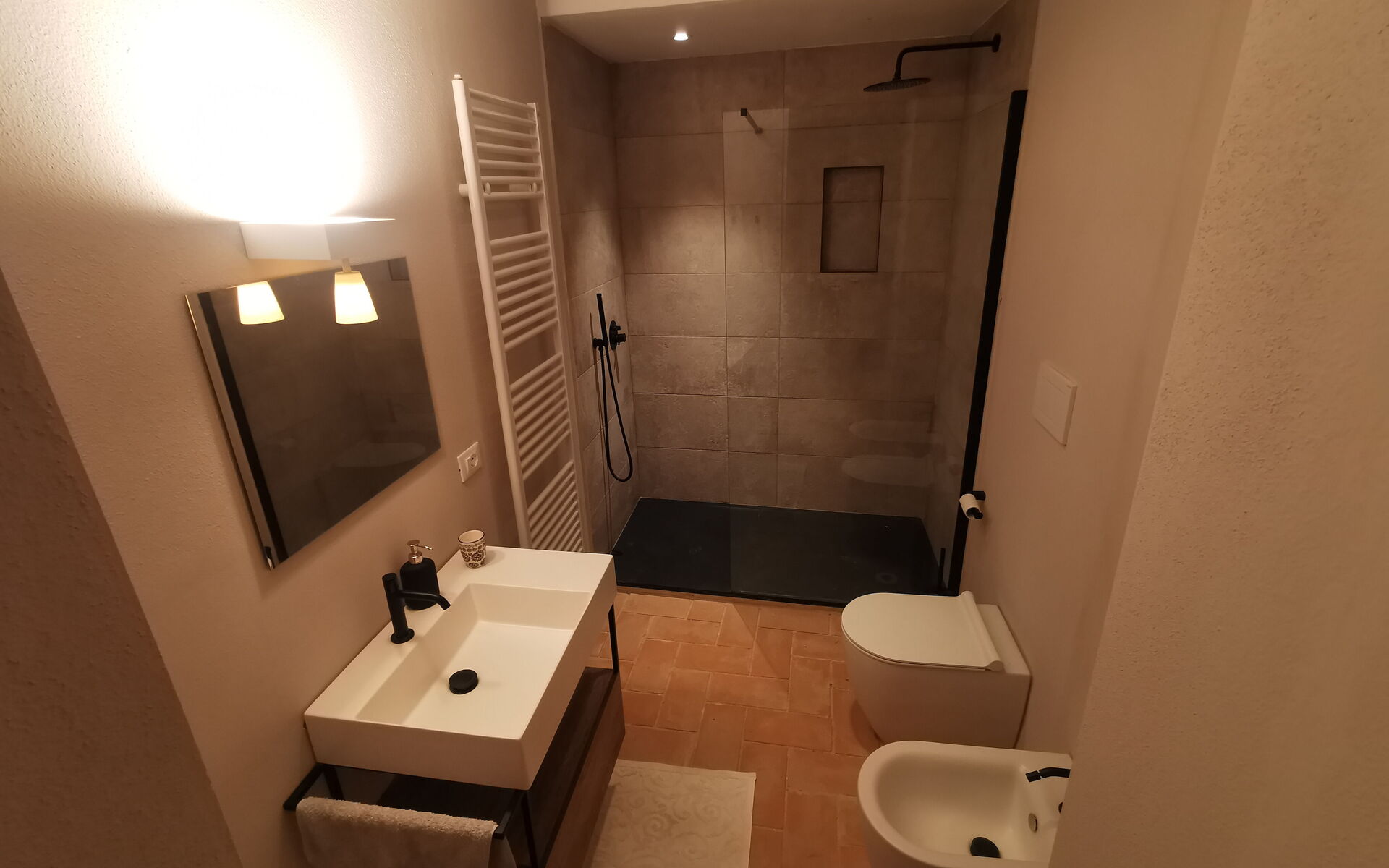 Bagno 1 (10 m2): lavandino, wc, bidet, doccia, asciugacapelli.