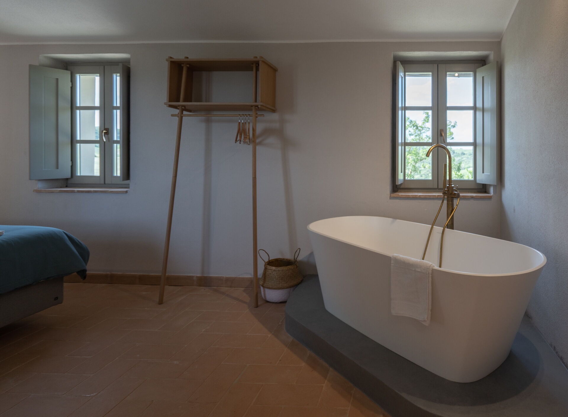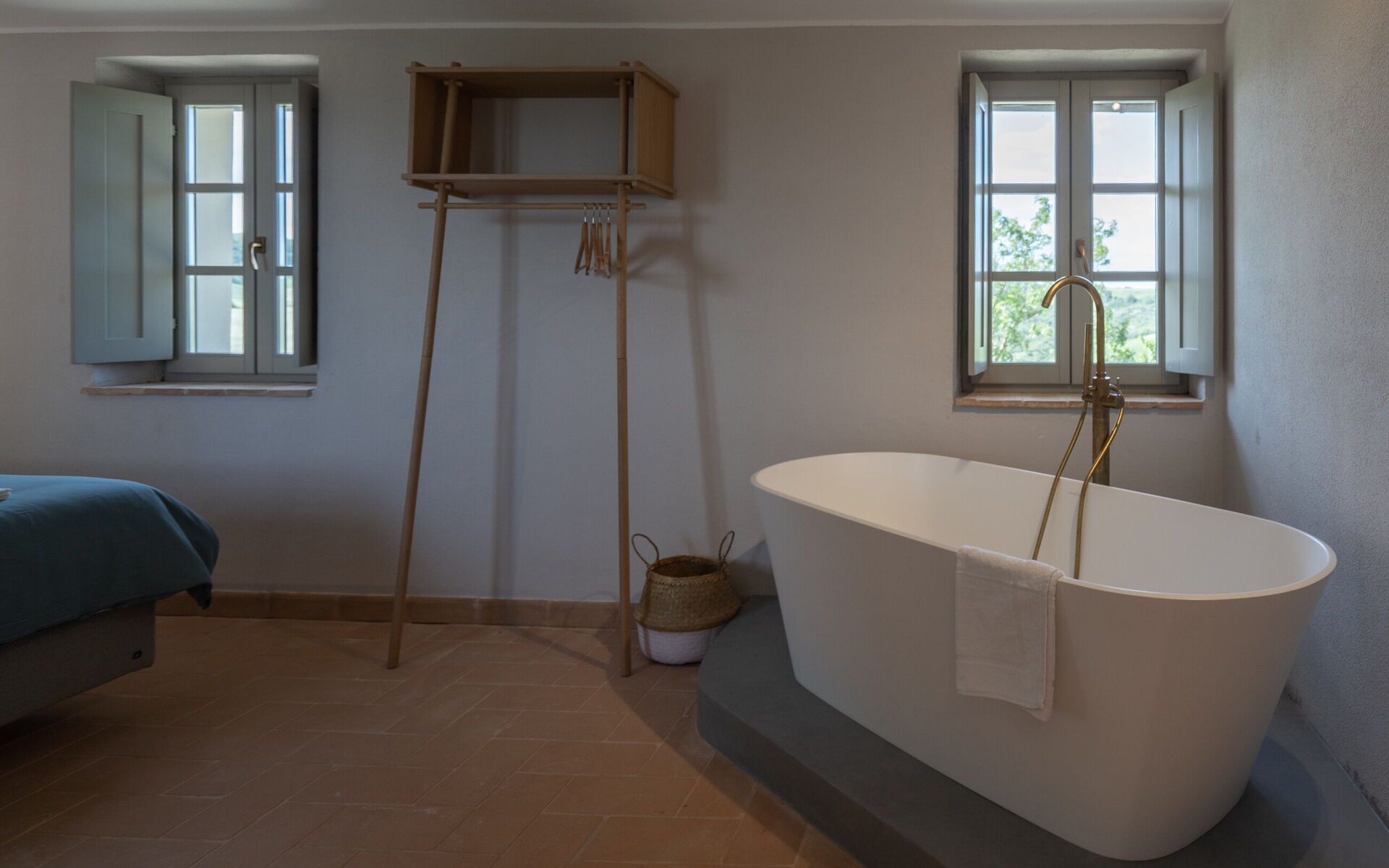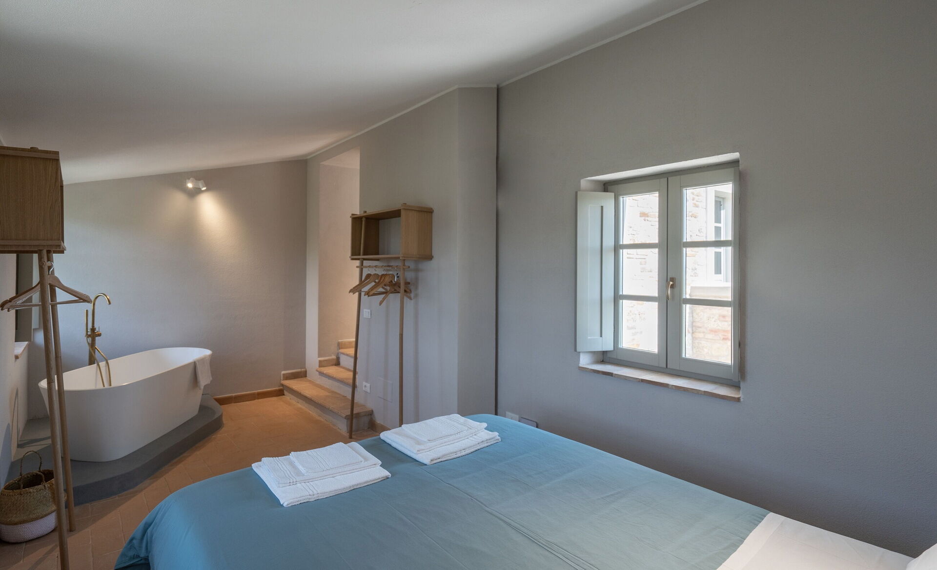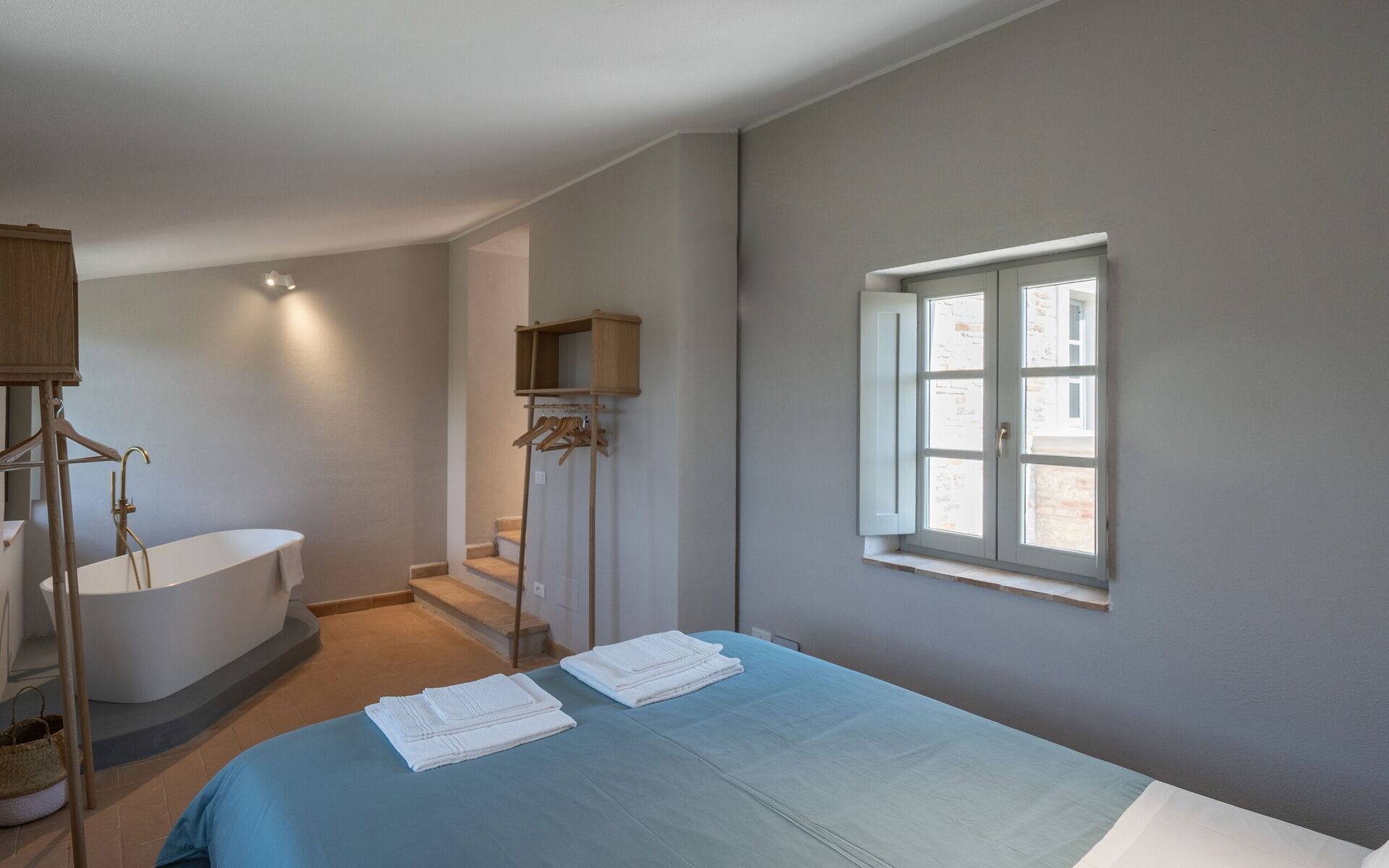 Camera da letto con bagno 1 (30 m2): letto matrimoniale (larghezza: 2m, lunghezza: 2m), aria condizionata, lavandino doppio, wc, bidet, vasca da bagno, doccia, asciugacapelli.