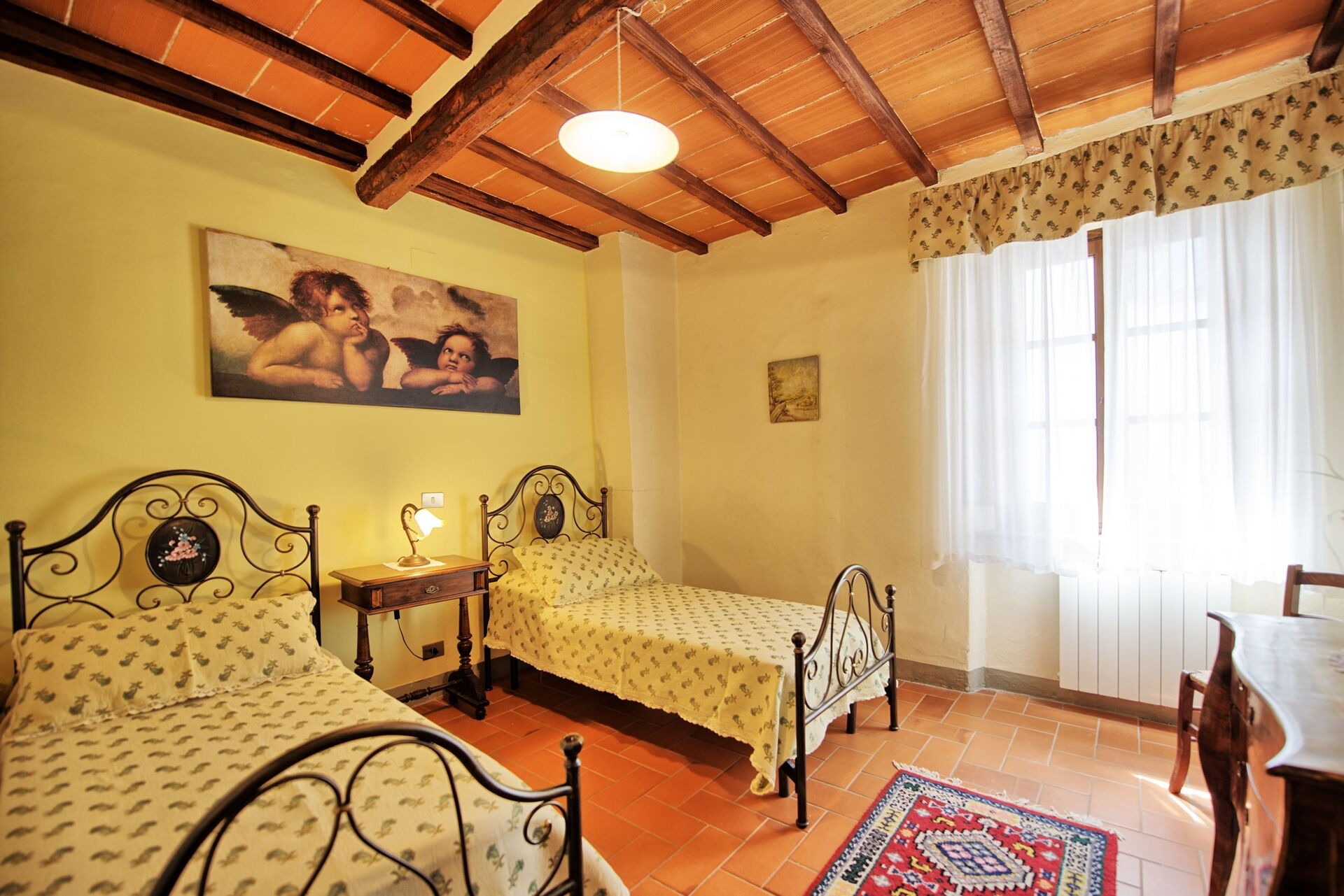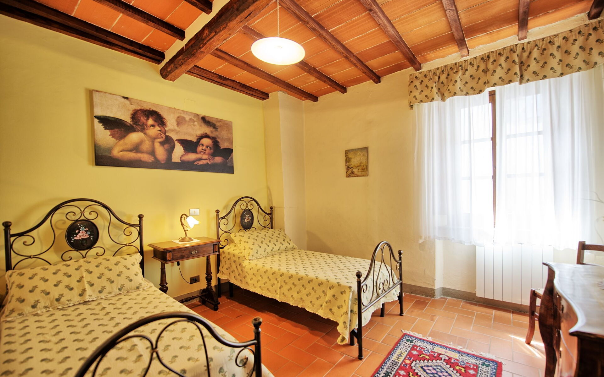 1° Piano: camera matrimoniale, camera con un letto singolo (letto alla francese), camera matrimoniale, ampio soggiorno (con camino non funzionante e TV satellitare), camera matrimoniale, camera matrimoniale con terzo letto singolo, 2 bagni ognuno con vasca e attacco doccia.