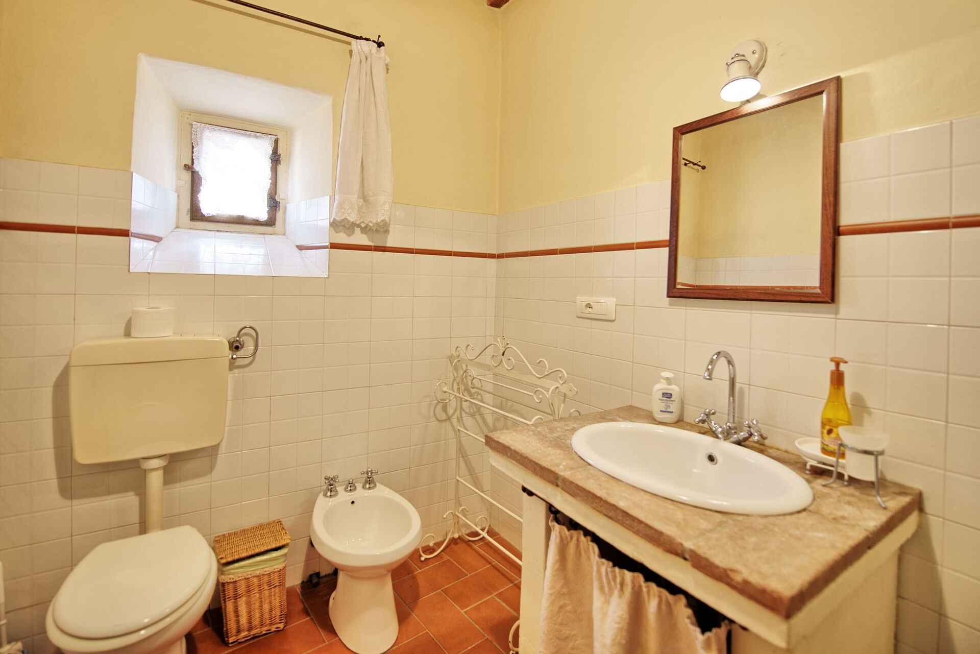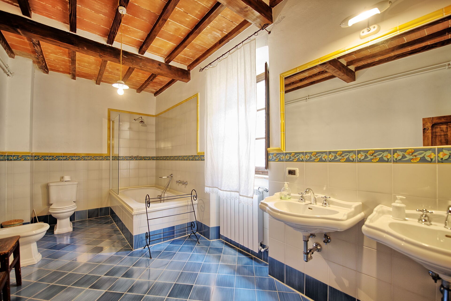Piano terreno rialzato (si accede salendo 10 gradini): grande salone (con camino non funzionante) adibito a zona pranzo, piccolo soggiorno (TV e camino non funzionante), cucina con camino (freezer, forno, microonde, lavastoviglie, macchina da caffè espresso, macchina da caffè americano), camera con 2 letti singoli, camera matrimoniale, 2 bagni ognuno con vasca e attacco doccia.