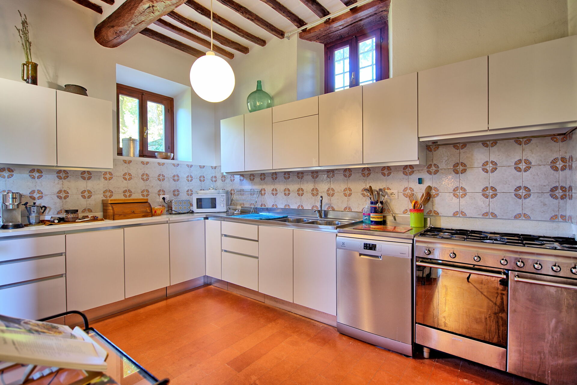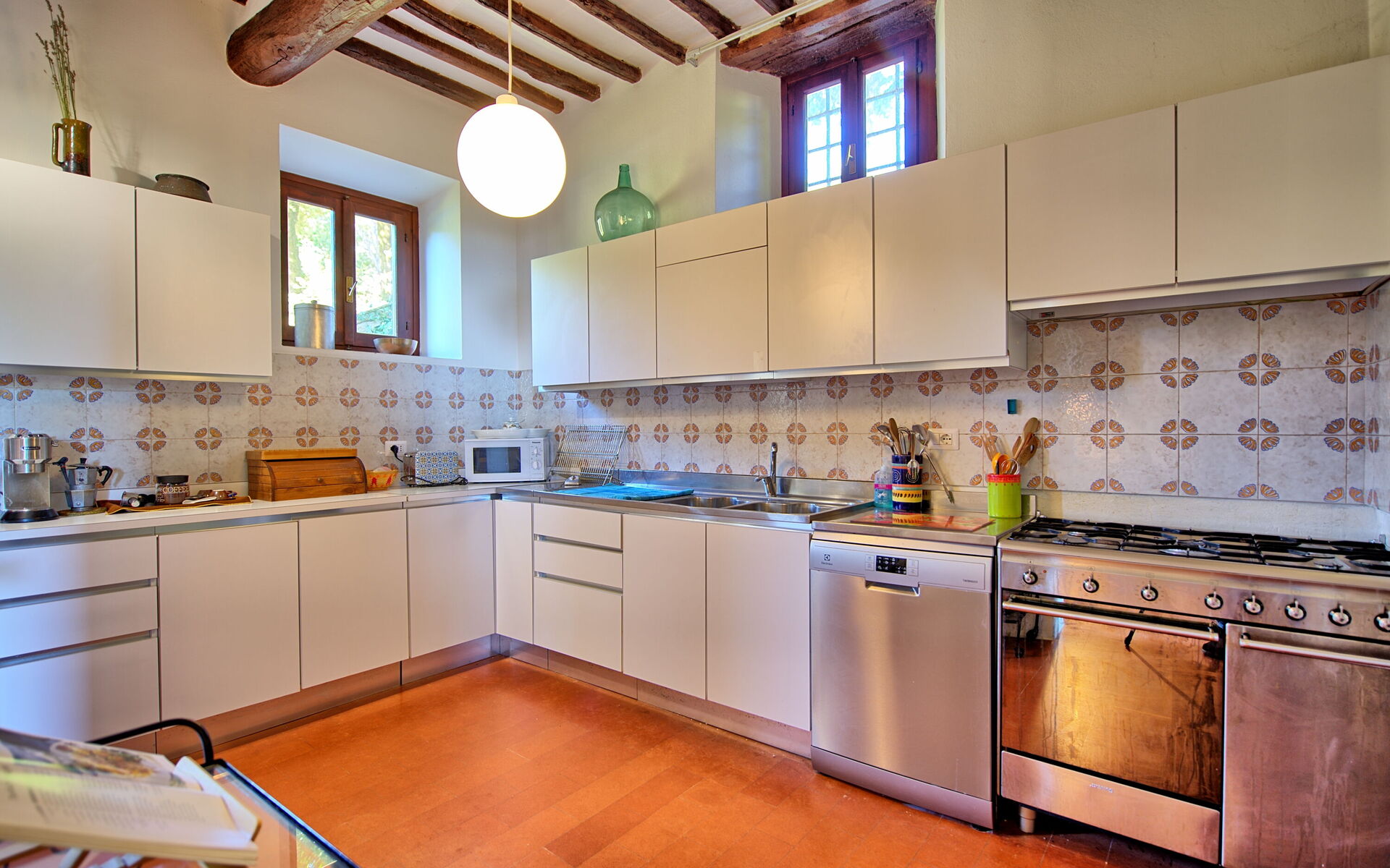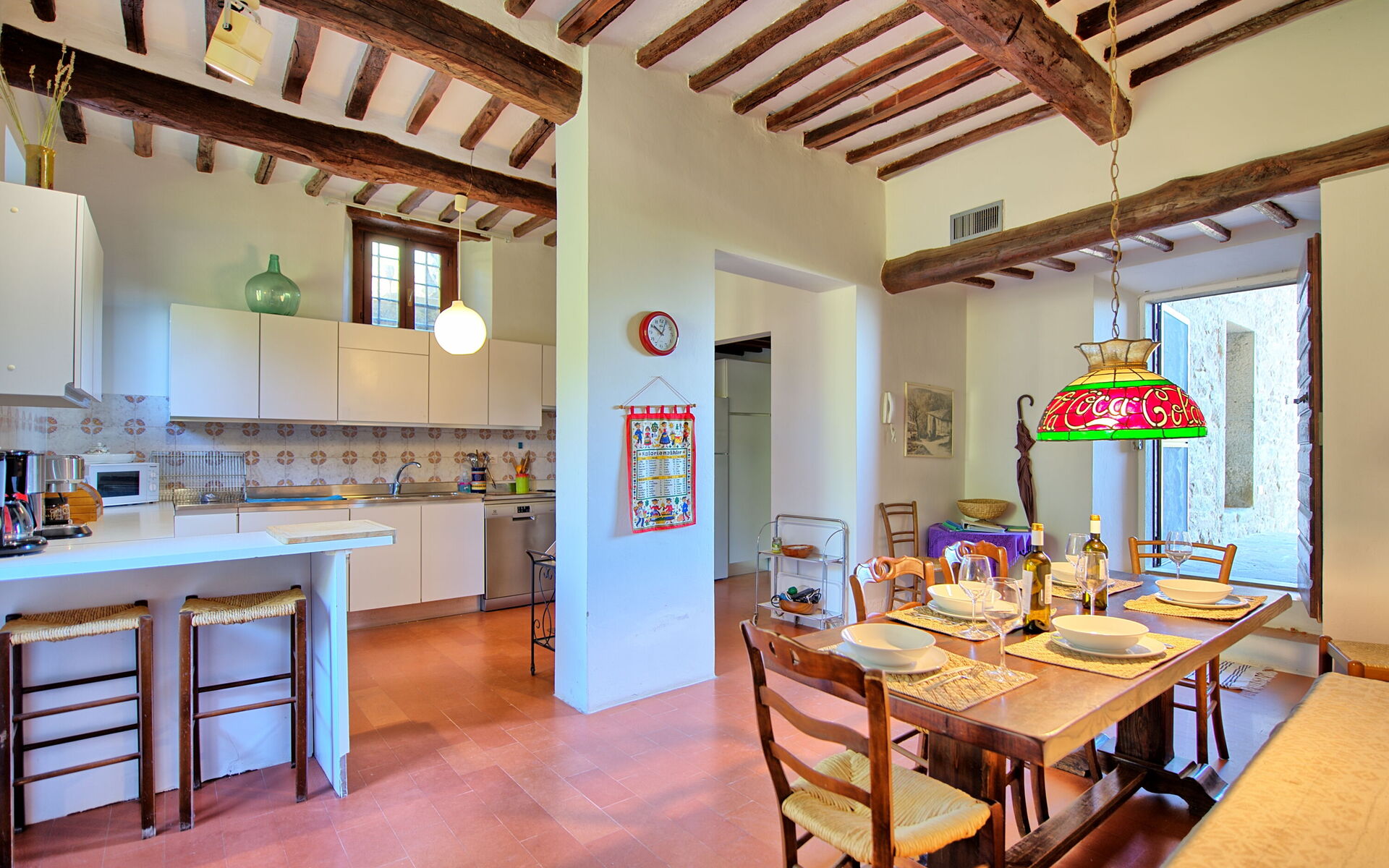 Piano terreno: ingresso su sala da pranzo e cucina a vista, tavolo da pranzo che può ospitare fino a 10 persone, cucina completamente attrezzata con macchina da gas (4 fuochi), forno elettrico, tostapane, lavastoviglie, macchina per il caffe americano e moka, frigo con freezer.