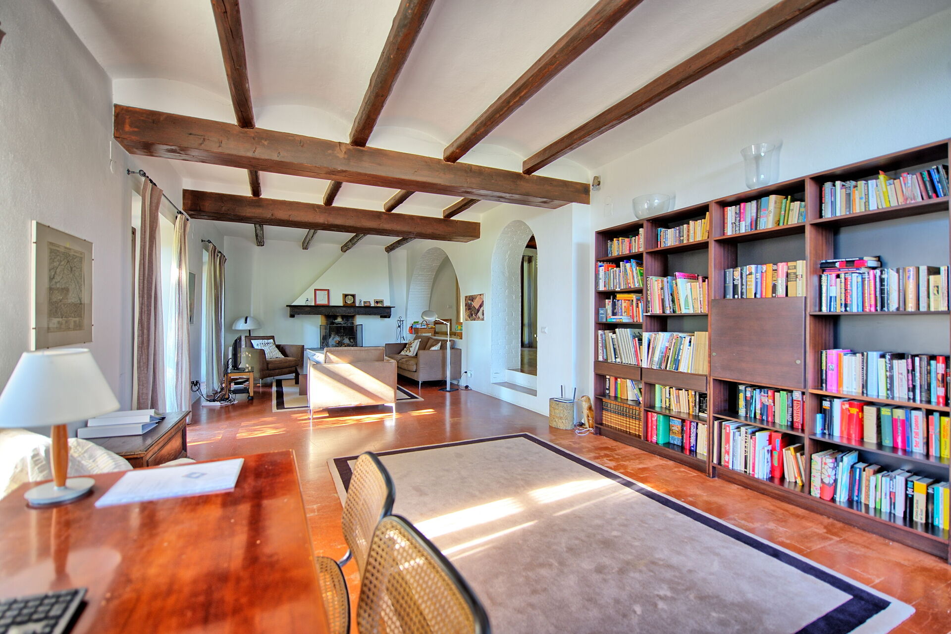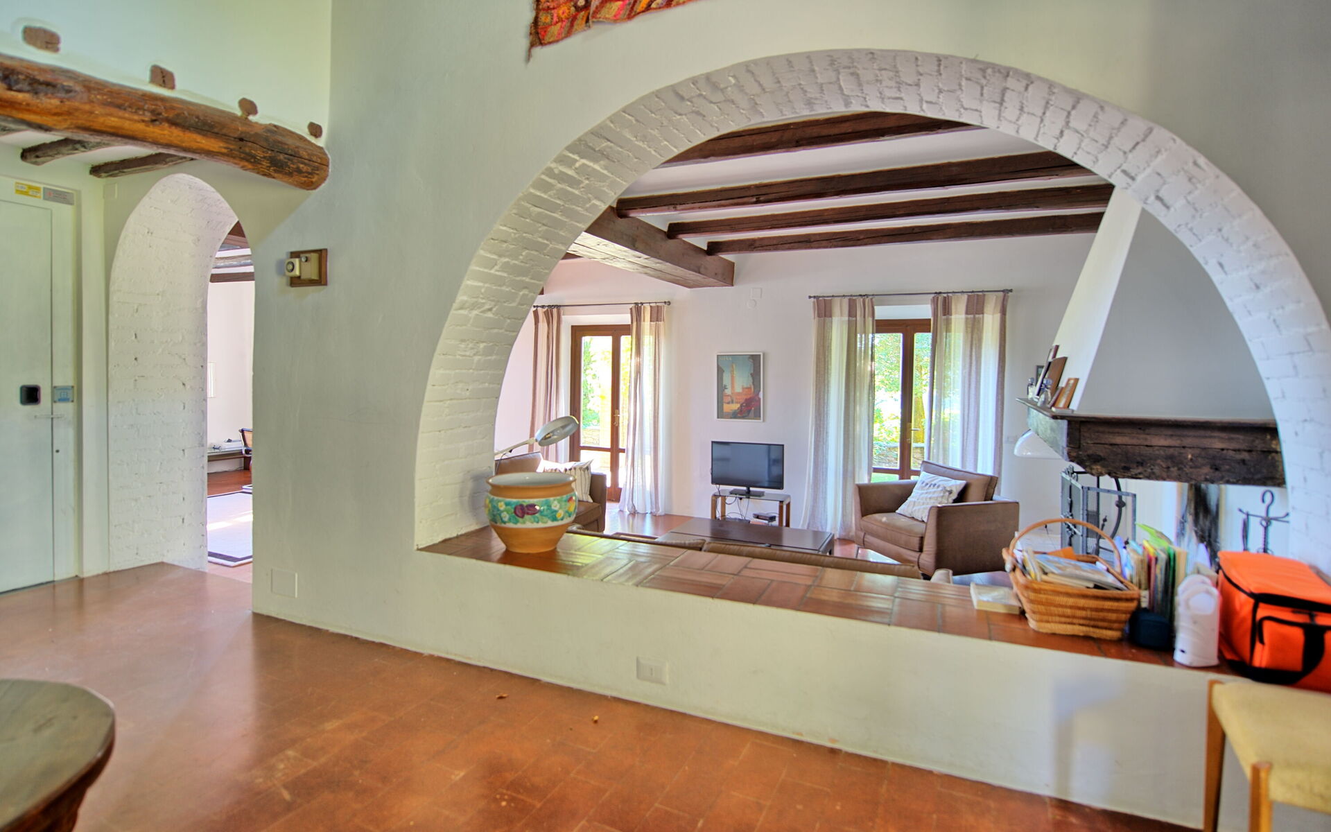 2 gradini giù: ampia zona soggiorno con camino funzionante, arredata con divano e poltrone, TV LCD satellitare, nel lato opposto si trova la scrivania con il computer e la stampante a disposizione degli ospiti. Il soggiorno ha grandi porte finestre che danno sulla veranda attrezzata con tavoli e sedie per cene all’aperto.