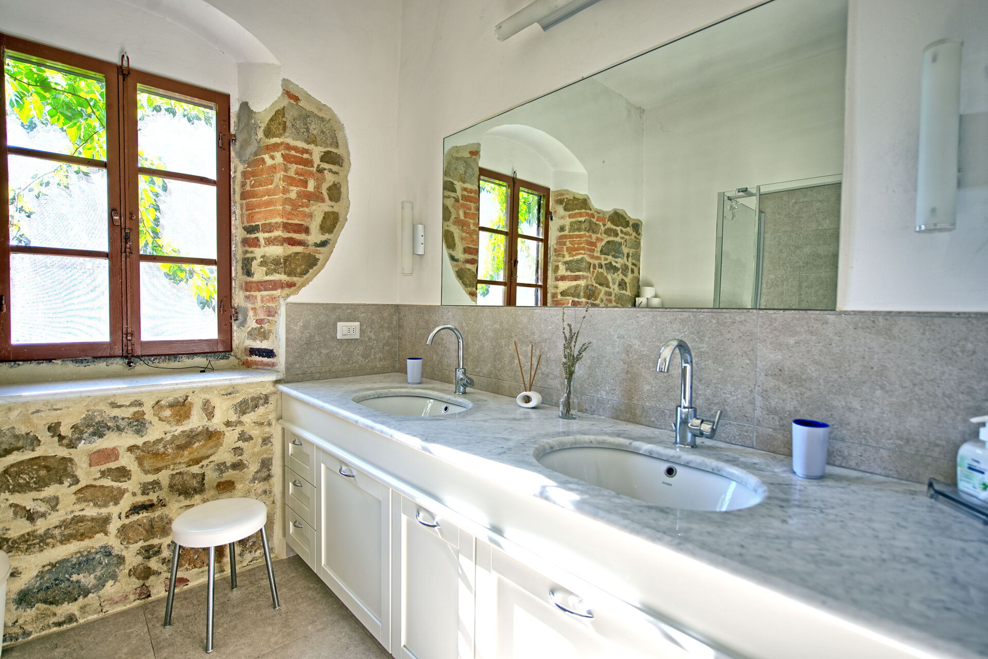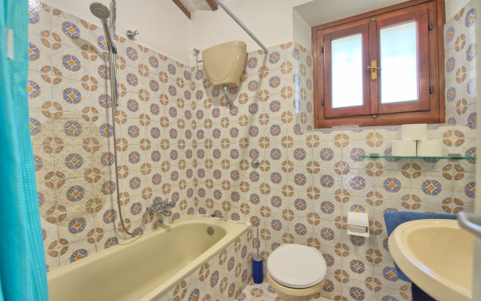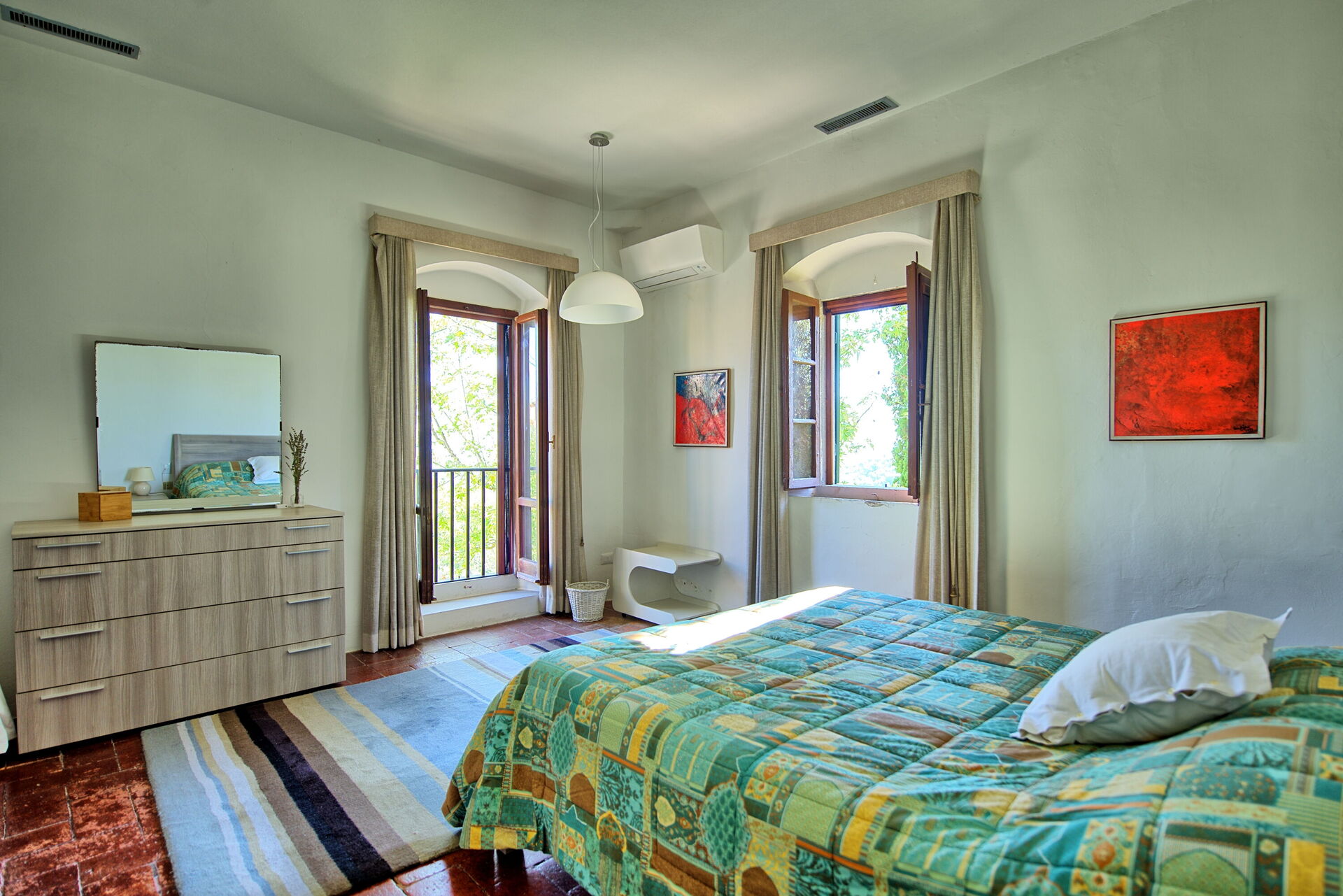 Primo piano: si salgono 12 gradini, si accede ad un pianerottolo, alla sua destra si trova una camera da letto matrimoniale ed una seconda camera con letto alla Francese, queste due camere sono servite dal bagno con doccia che si trova adiacente alle due camere. Nella parte opposta del pianerottolo si trovano una camera da letto matrimoniale con accesso diretto sul giardino (scendendo delle scale); camera da letto con due letti singoli; camera da letto con un letto singolo; le tre camere sono servite dal bagno con doccia che si trova adiacente ad esse.