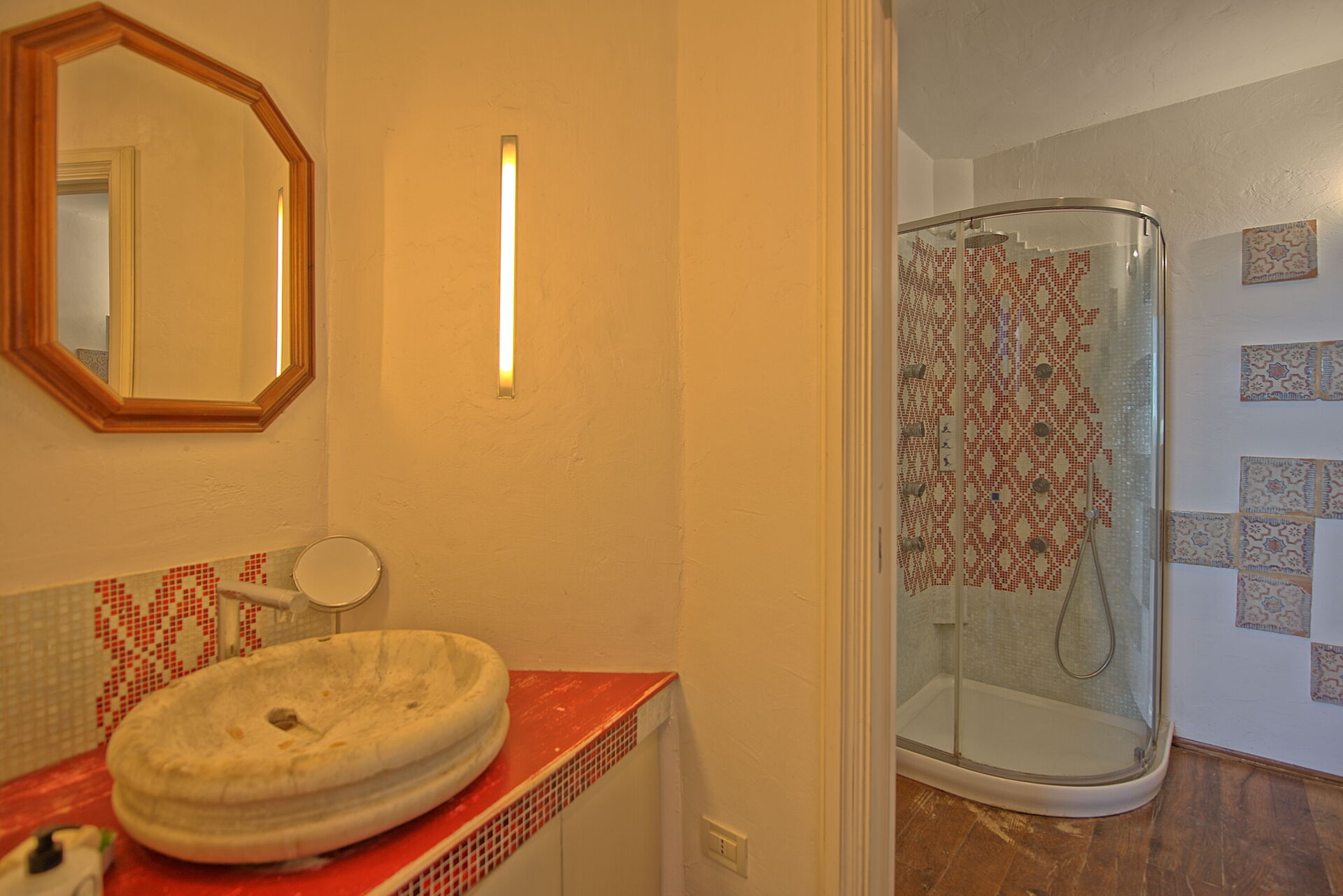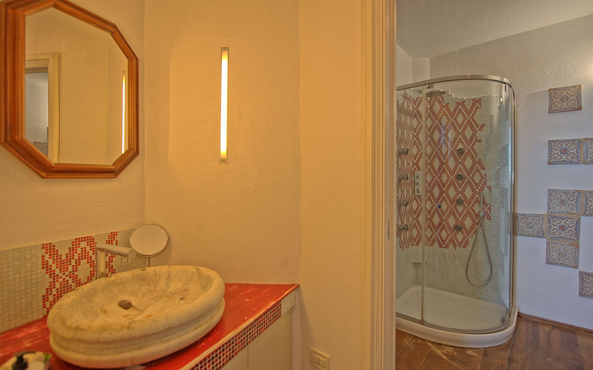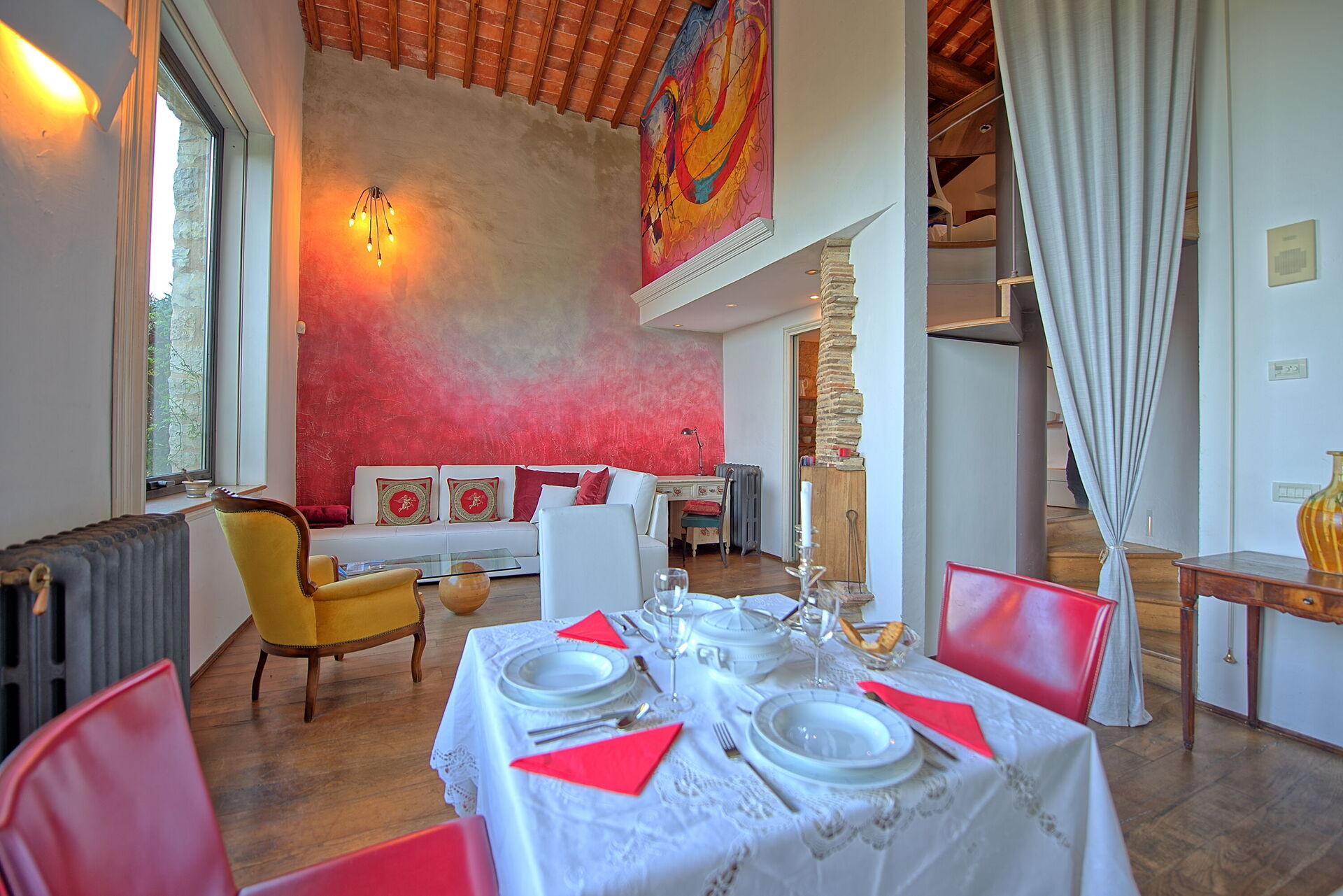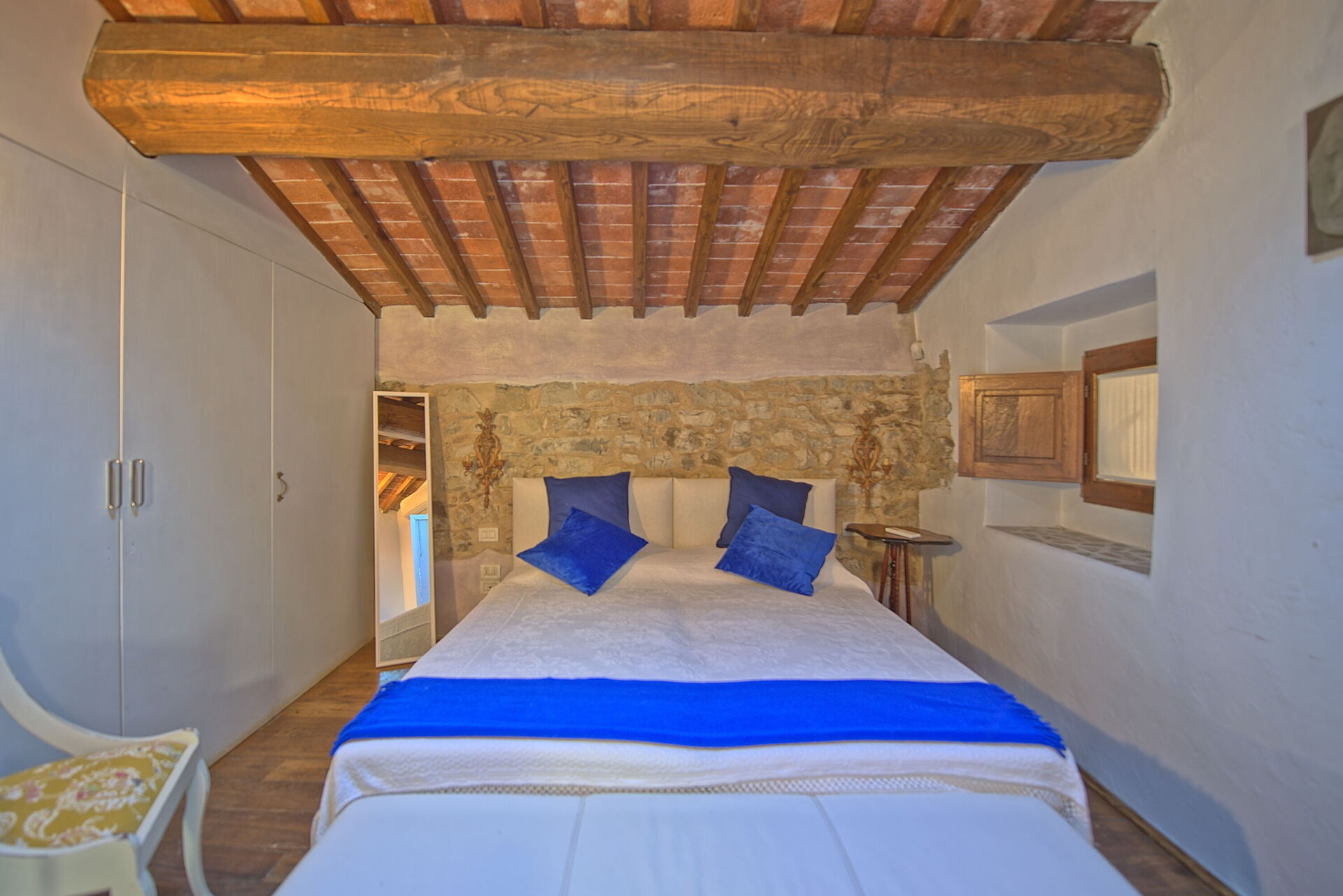 Primo piano: dal soggiorno si accede attraverso una scala a chiocciola ad una camera matrimoniale con aria condizionata (aperta sul soggiorno sottostante) con bagno privato con vasca. Da questa camera si accede ad una seconda camera matrimoniale che è accessibile anche direttamente dall'esterno: chiudendo la doppia porta tra le due camere si ottengono due camere completamente indipendenti; nella seconda camera è presente (oltre al letto matrimoniale) un divano letto matrimoniale, un piccolo angolo cottura con tavolino e un piccolissimo bagno di servizio (wc e lavandino).