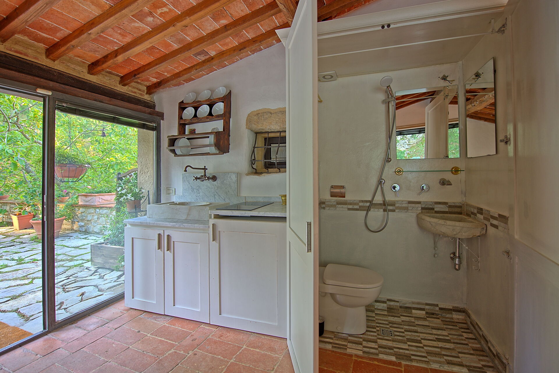 La casa si sviluppa su due piani ed essendo costruita sul pendio di una collina ha l’accesso diretto al livello del giardino da ogni piano.