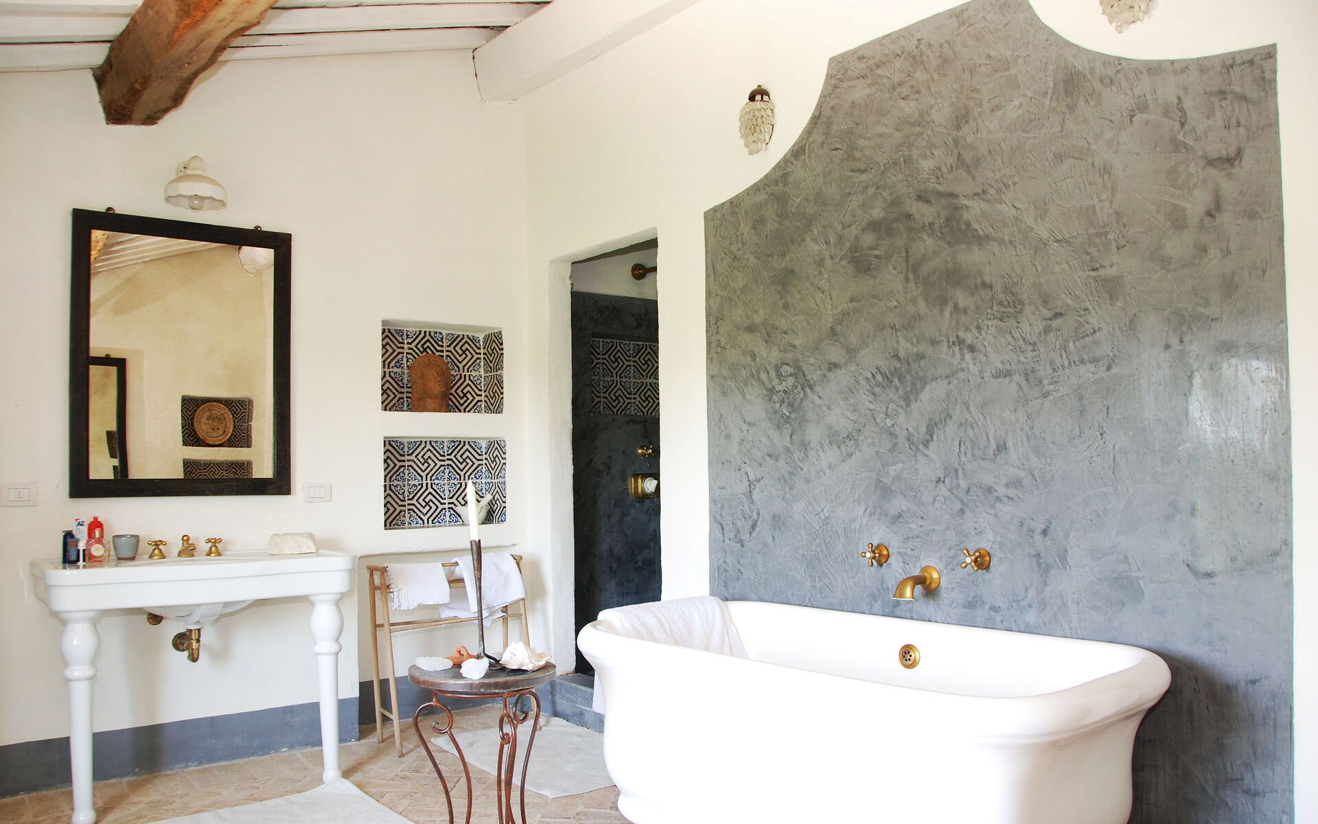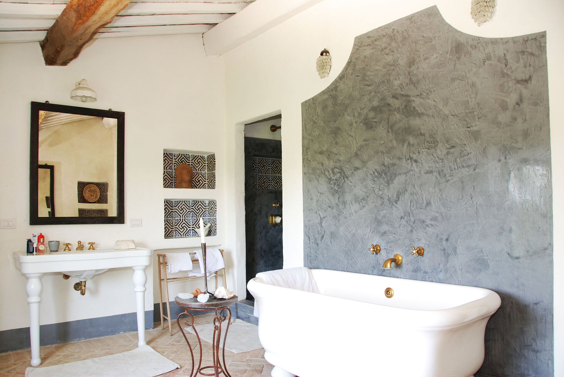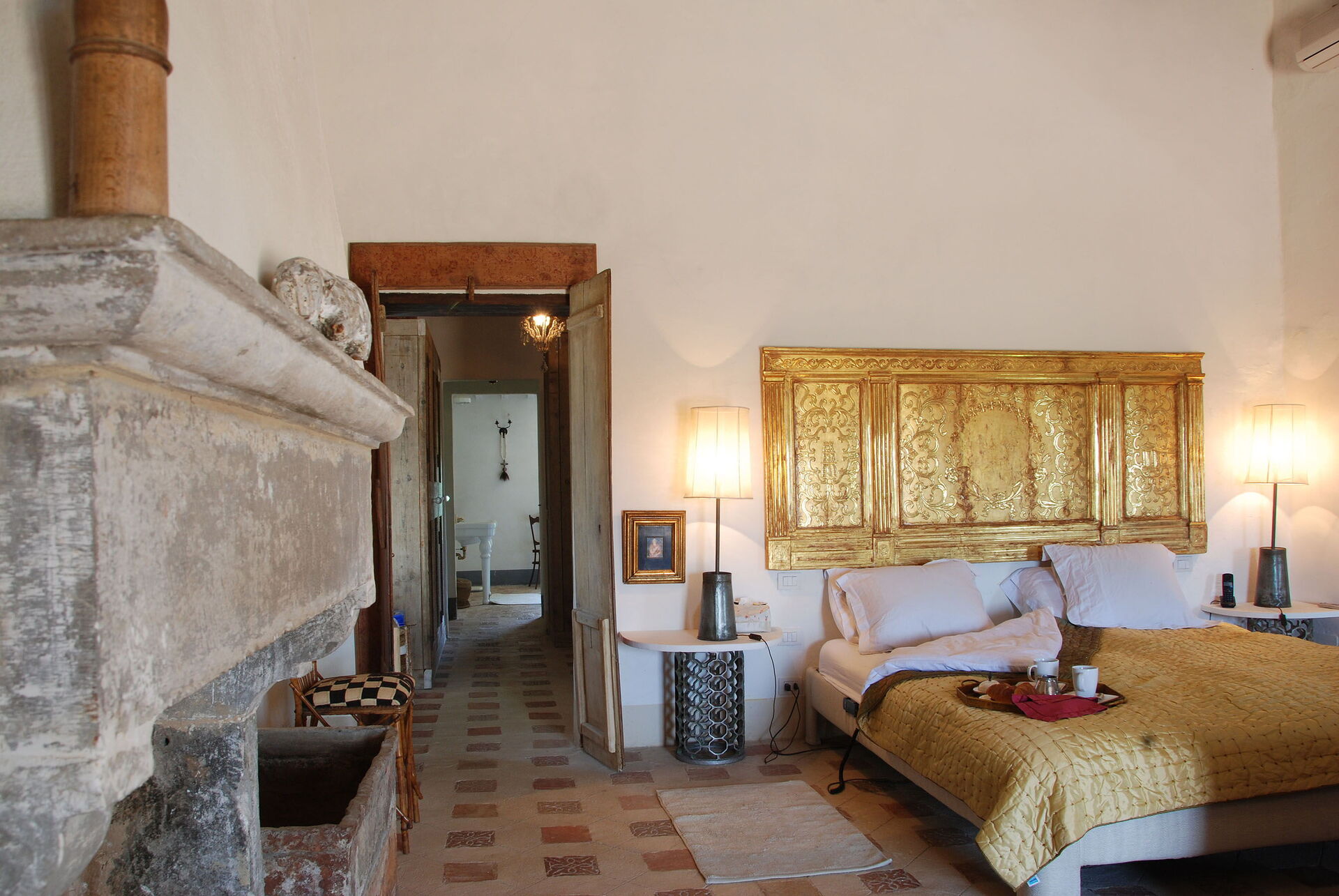 Camera da letto con bagno 2: letto king size, internet WIFI, aria condizionata, televisione, poltrona, caminetto, lavandino doppio, wc, bidet, vasca da bagno, due docce, asciugacapelli, uscita sulla terrazza.