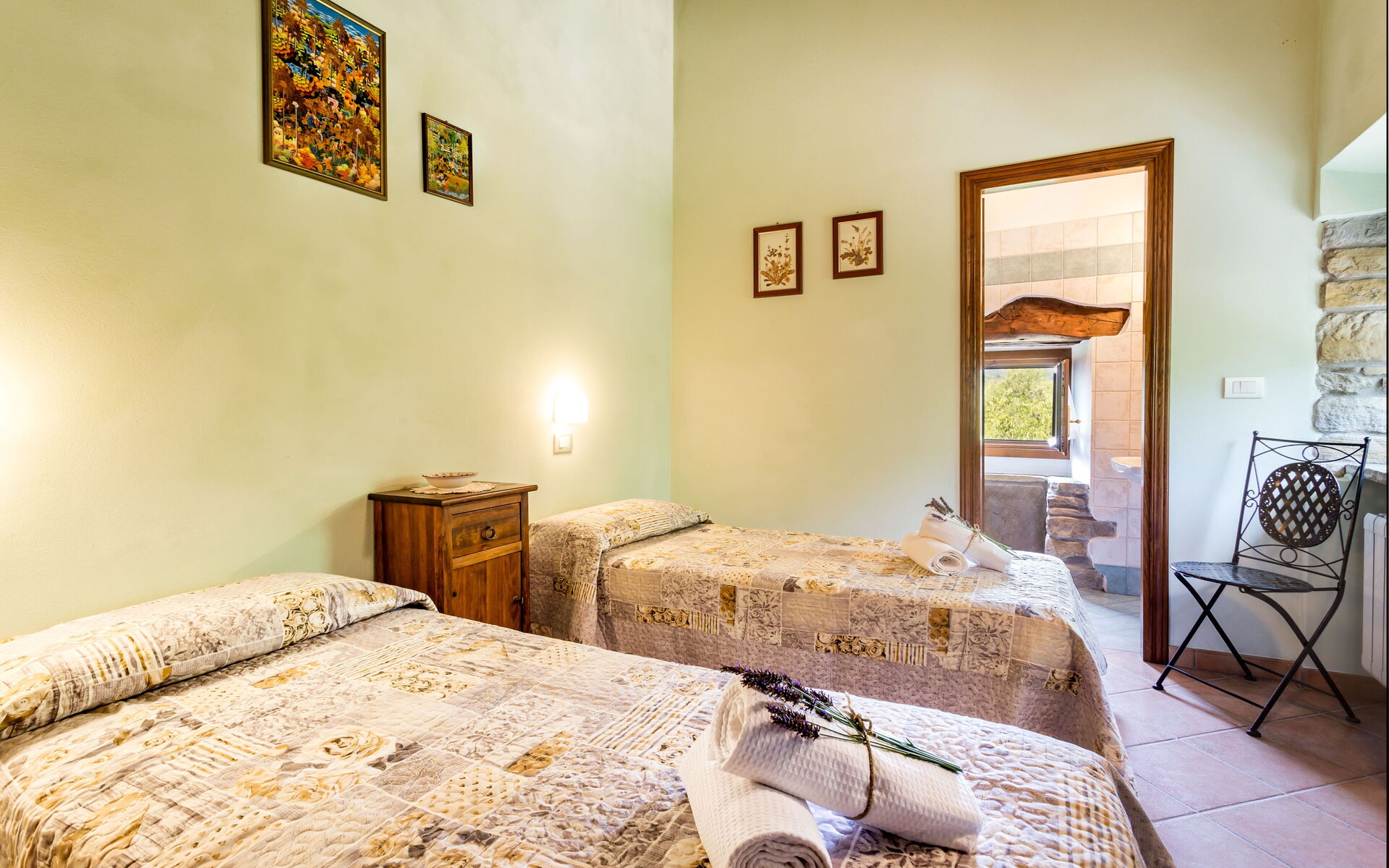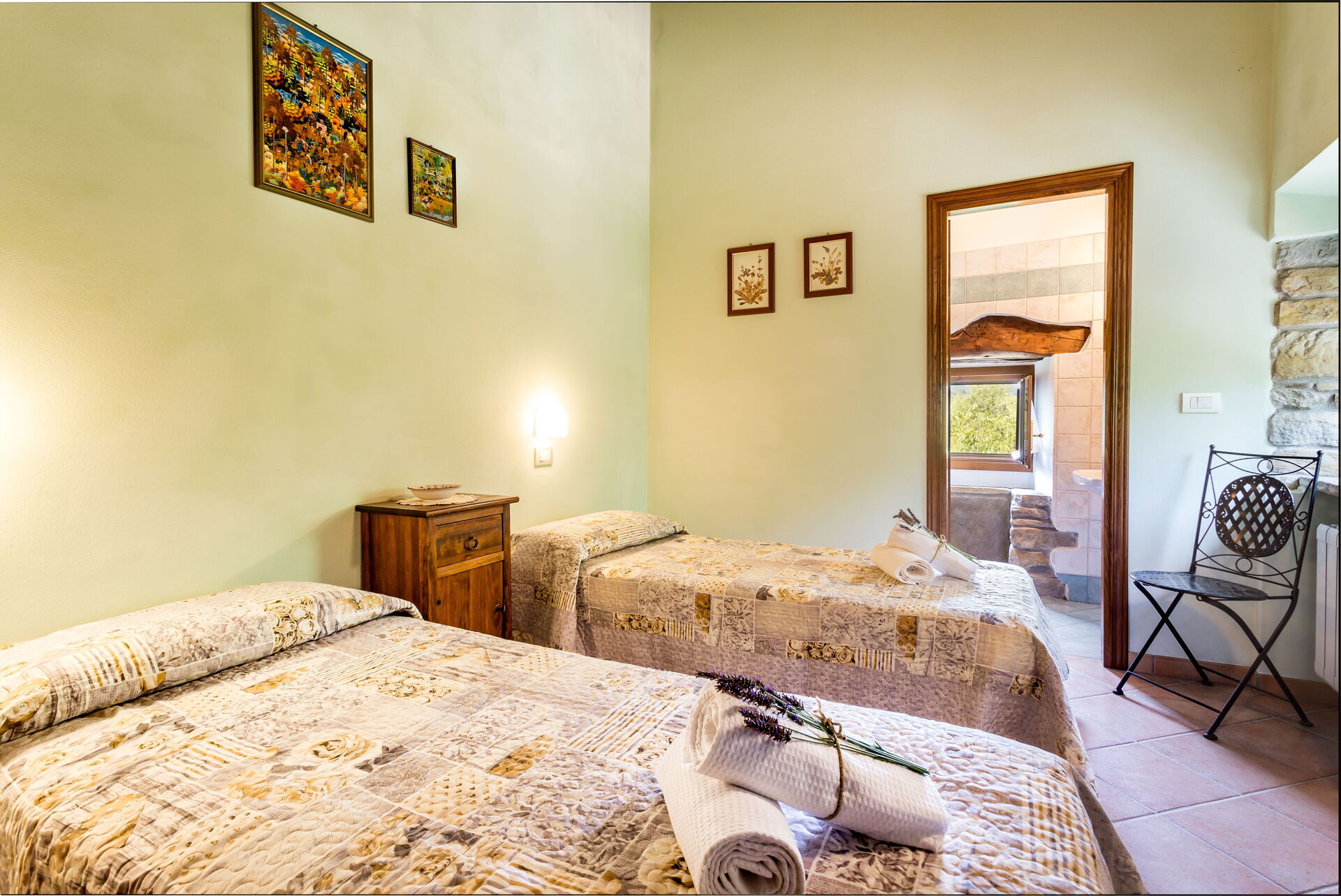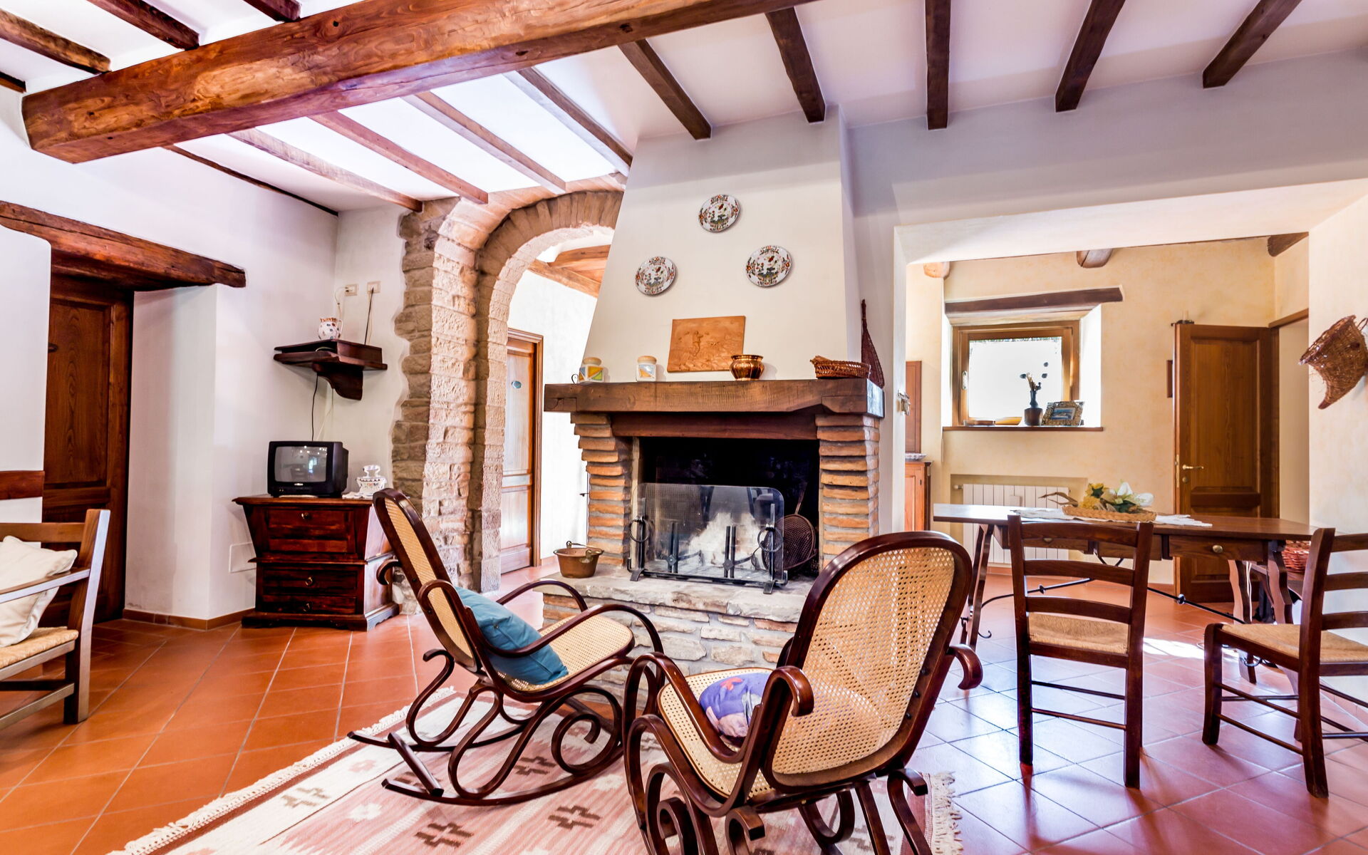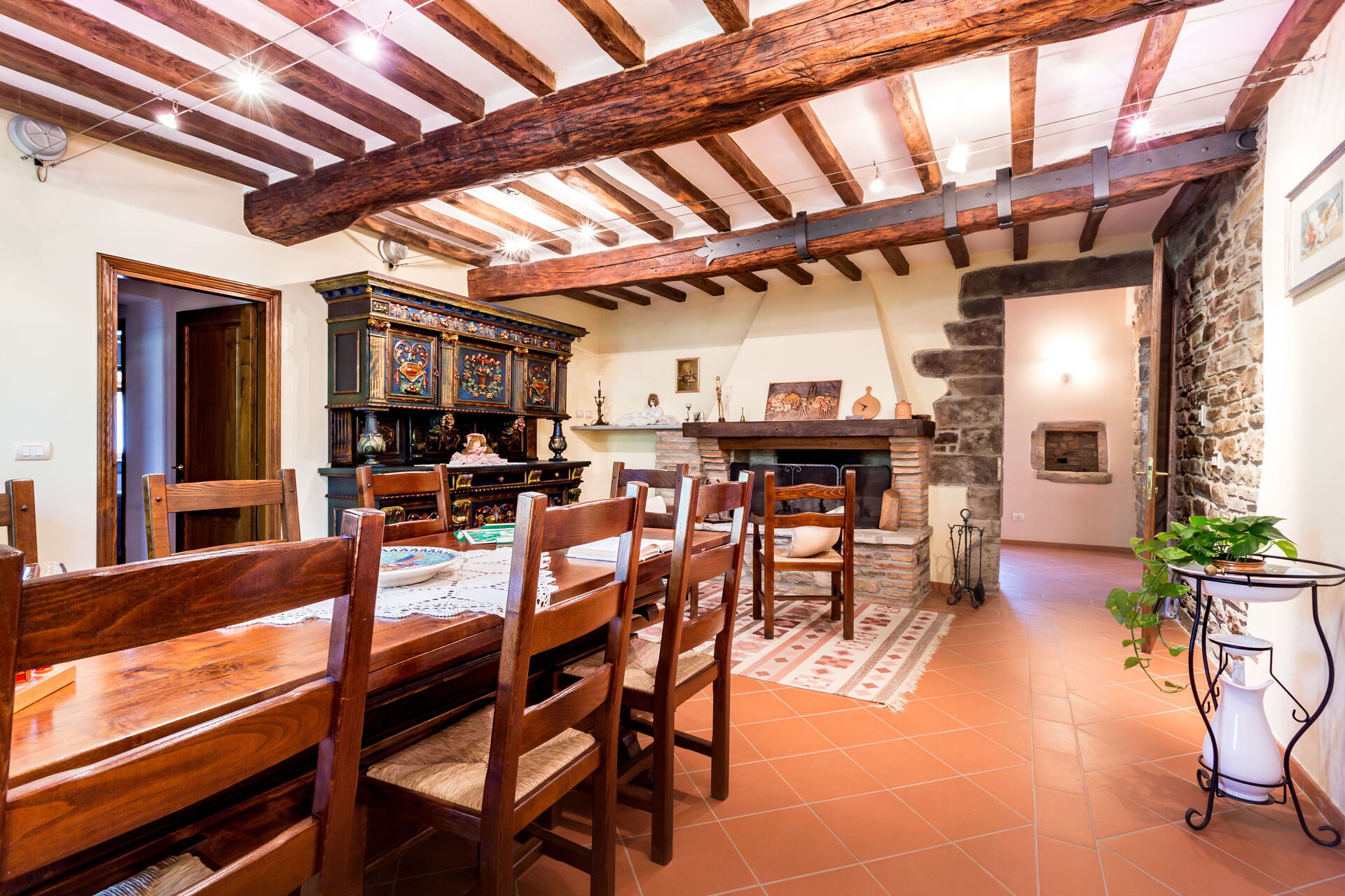 Al piano primo: 2 camere doppie con letto matrimoniale ciascuna con bagno con doccia (wc/bidet); 2 camere doppie con 2 letti singoli ciascuna con bagno con doccia (wc/bidet); Ampio soggiorno con camino e TV satellitare;