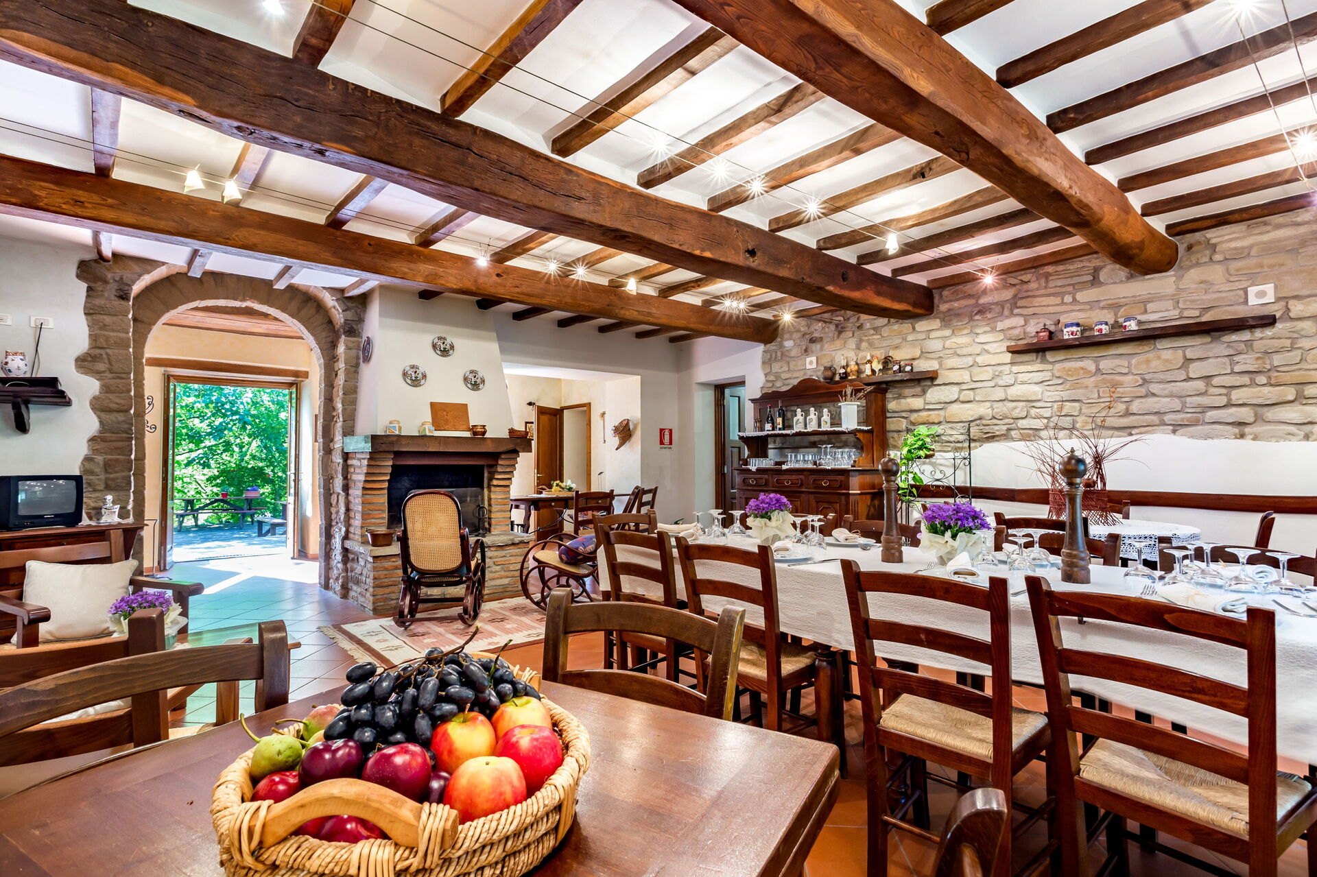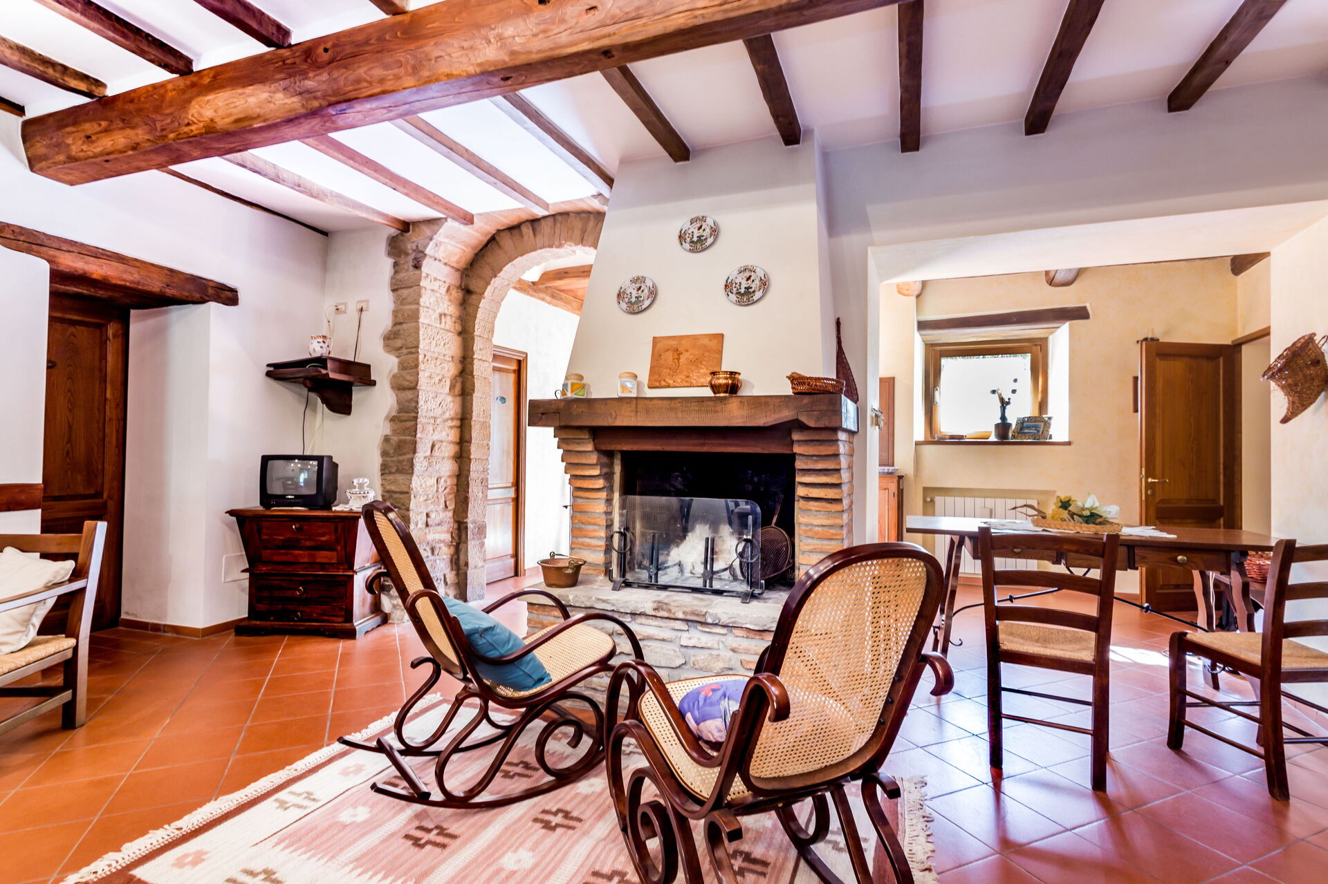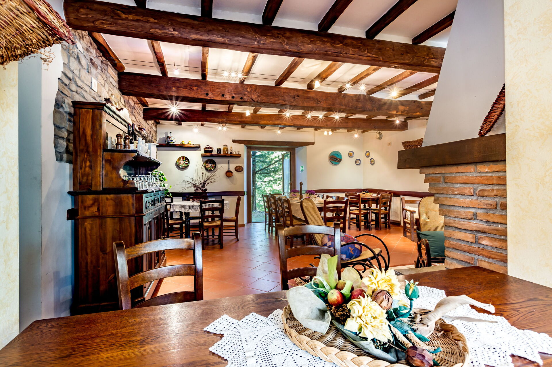 Al piano primo: 2 camere doppie con letto matrimoniale ciascuna con bagno con doccia (wc/bidet); 2 camere doppie con 2 letti singoli ciascuna con bagno con doccia (wc/bidet); Ampio soggiorno con camino e TV satellitare;
