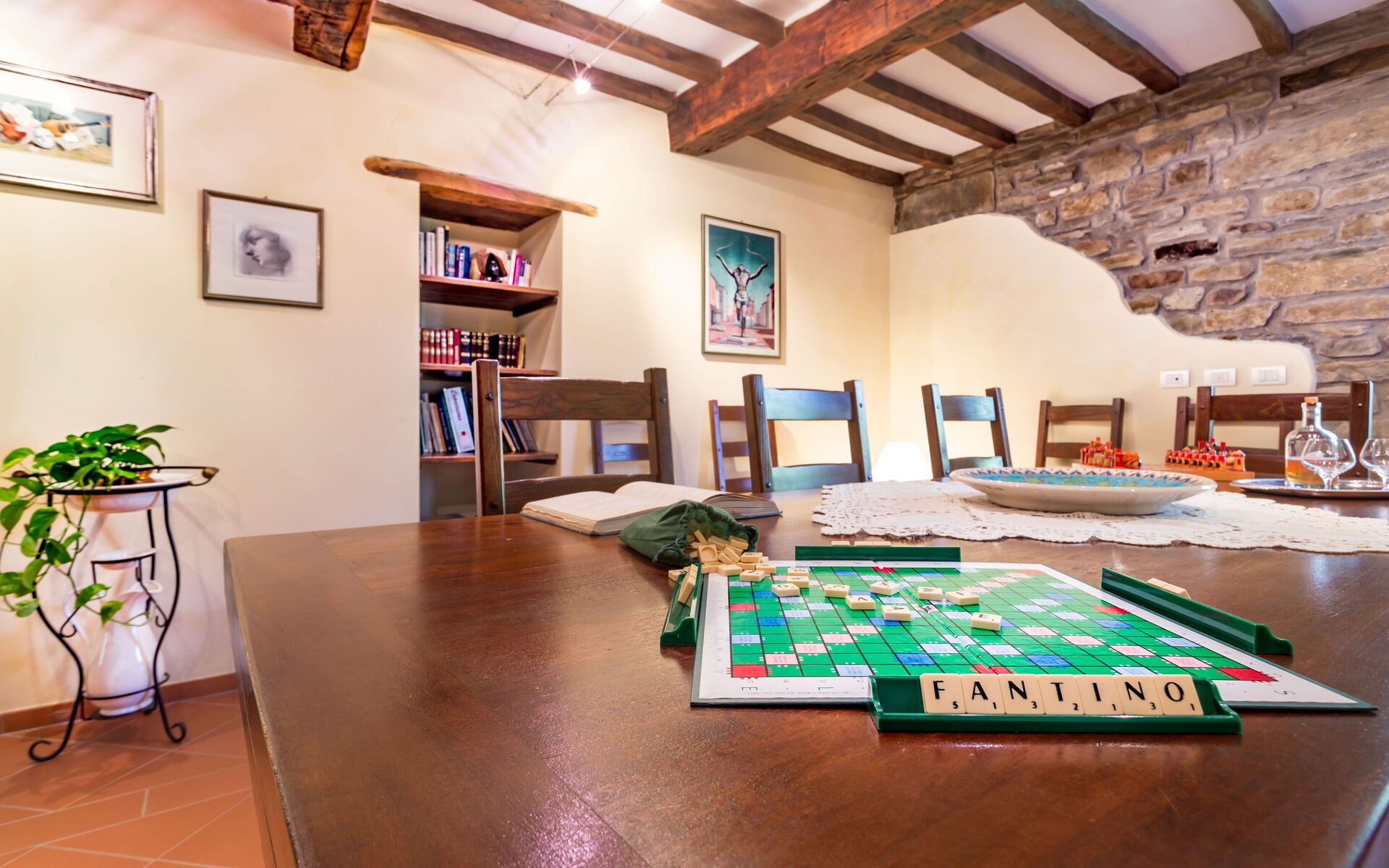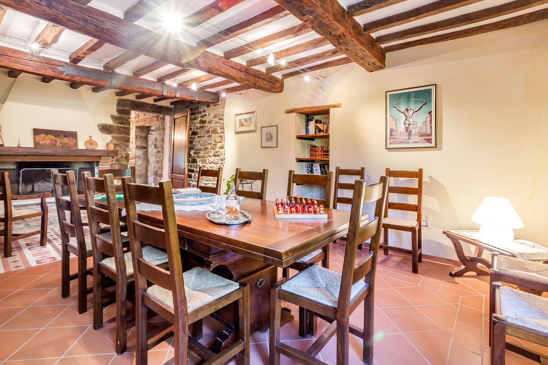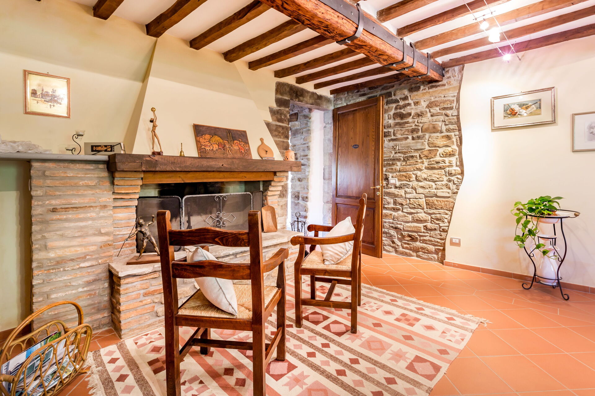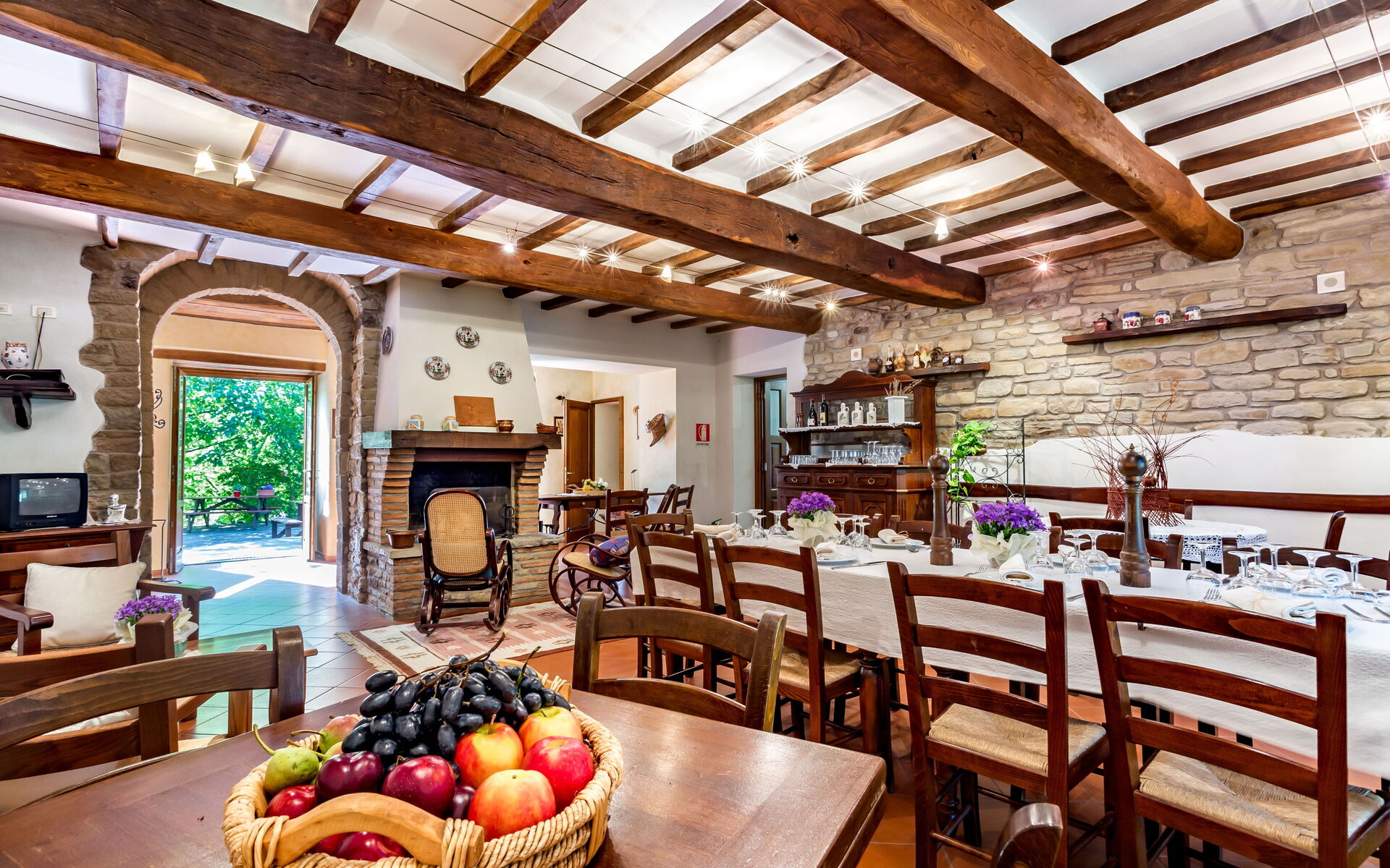 Al piano primo: 2 camere doppie con letto matrimoniale ciascuna con bagno con doccia (wc/bidet); 2 camere doppie con 2 letti singoli ciascuna con bagno con doccia (wc/bidet); Ampio soggiorno con camino e TV satellitare;