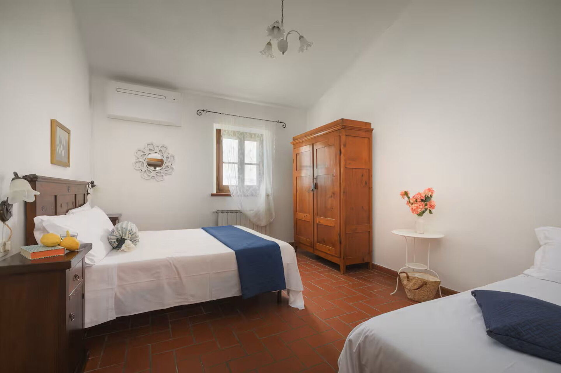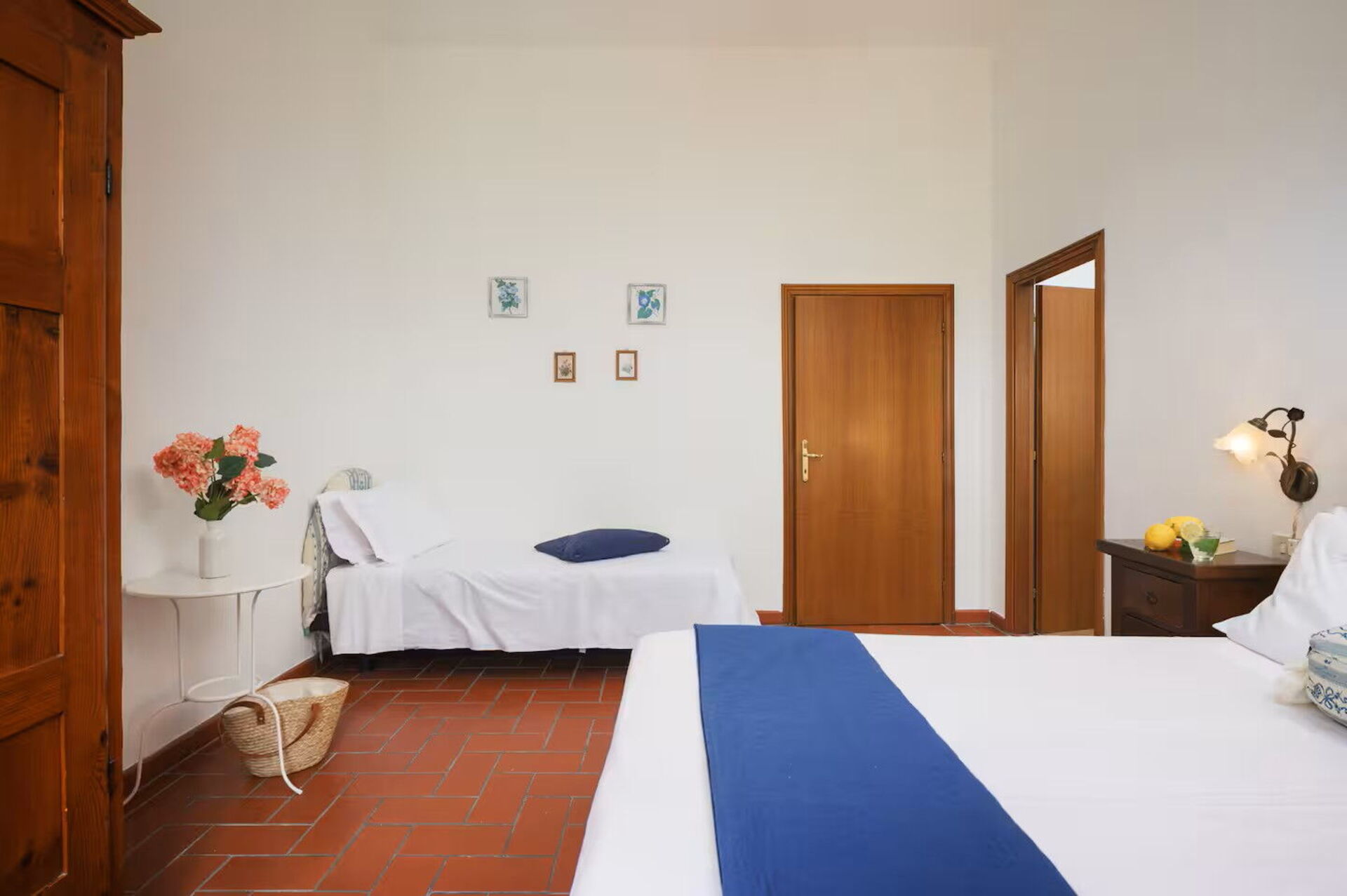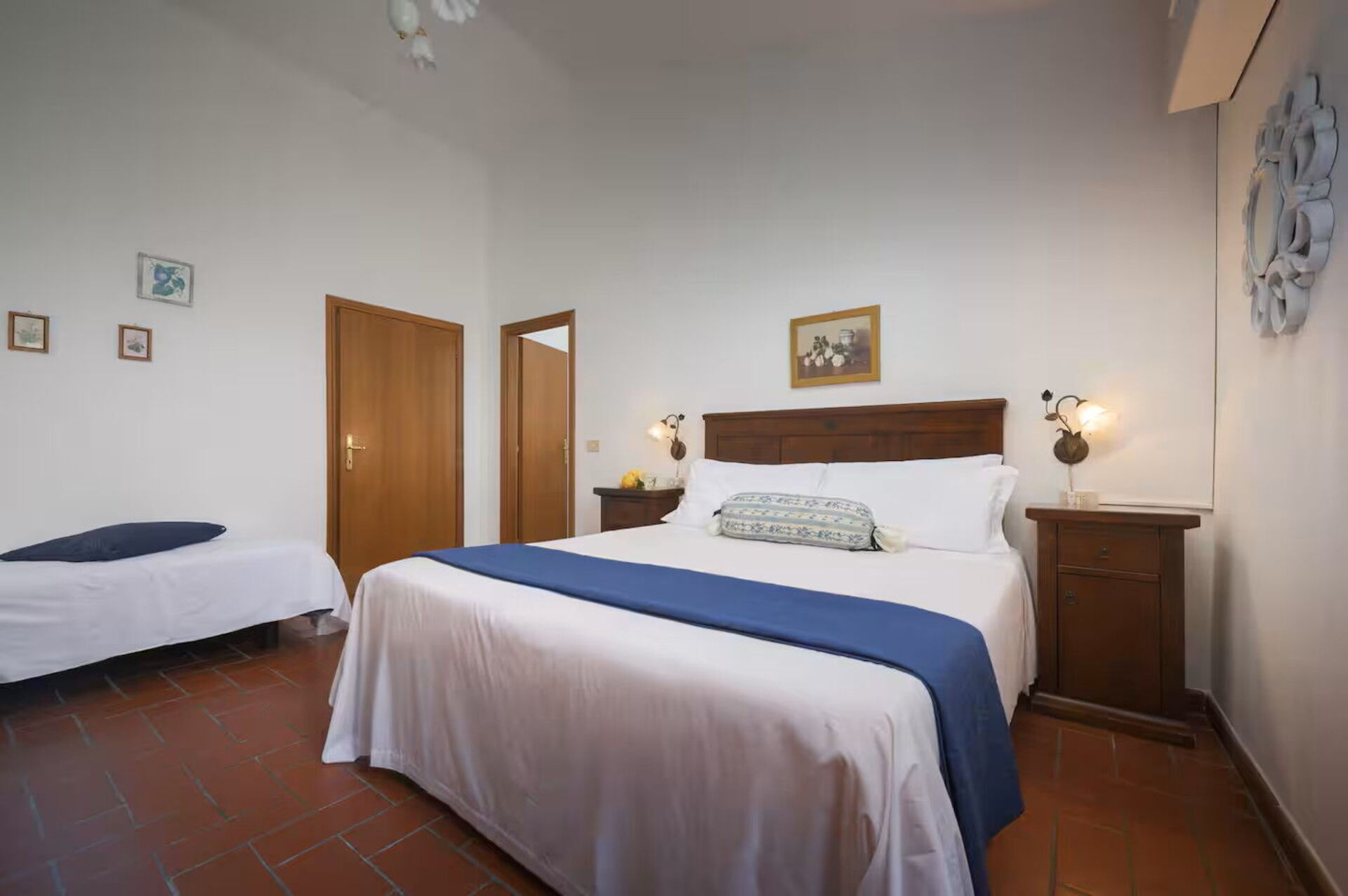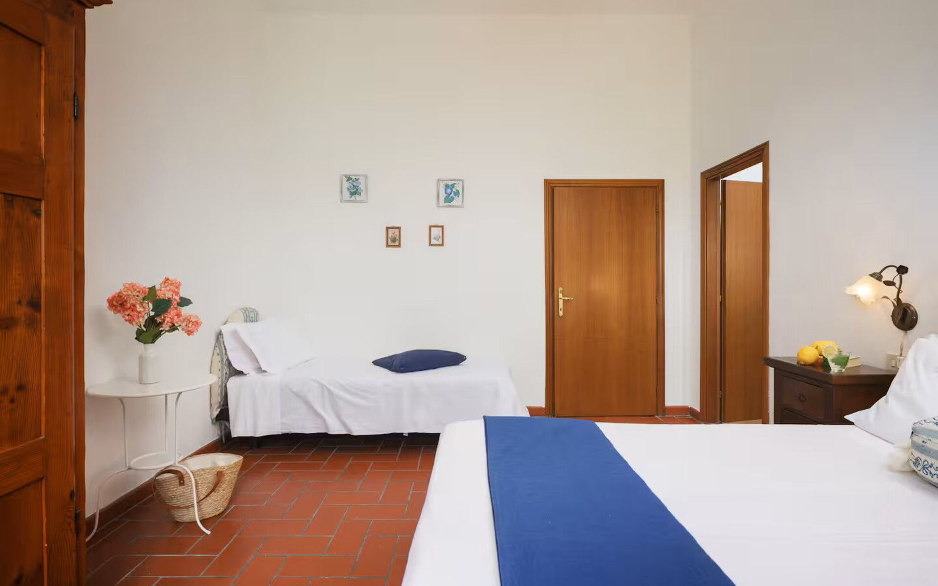 Primo piano: cucina, ampia stanza (aria condizionata) con letto matrimoniale e letto singolo, bagno con doccia.