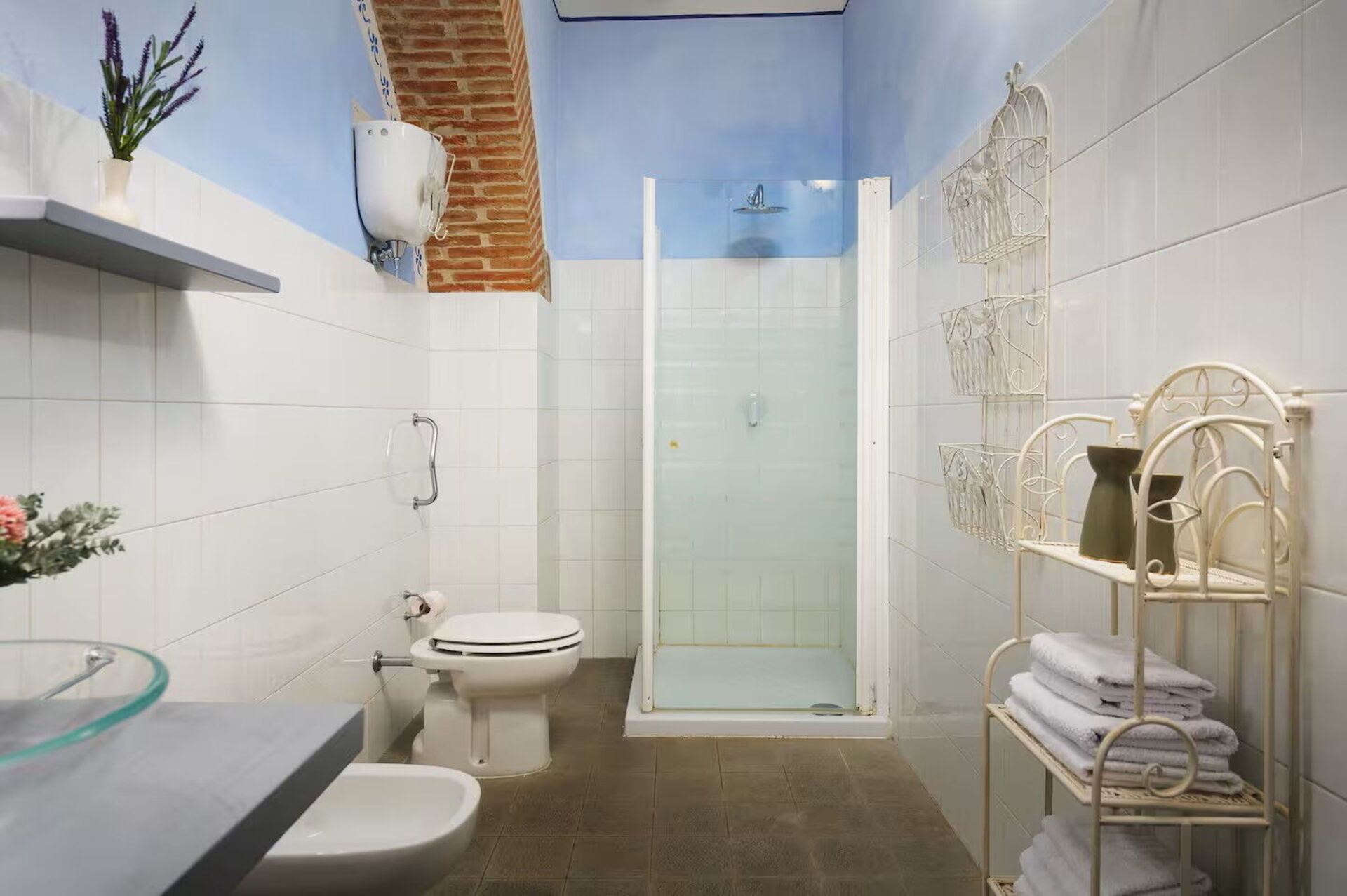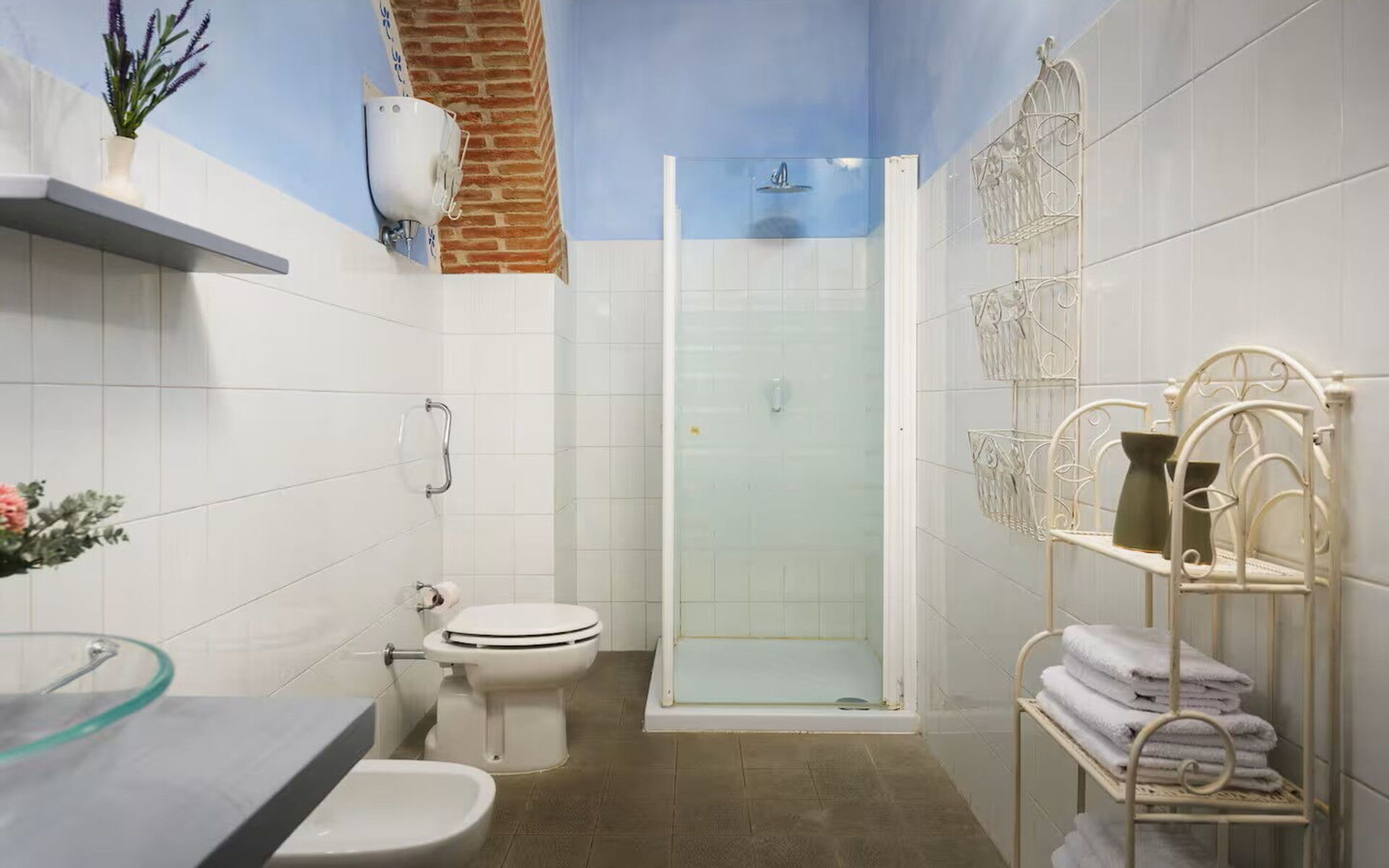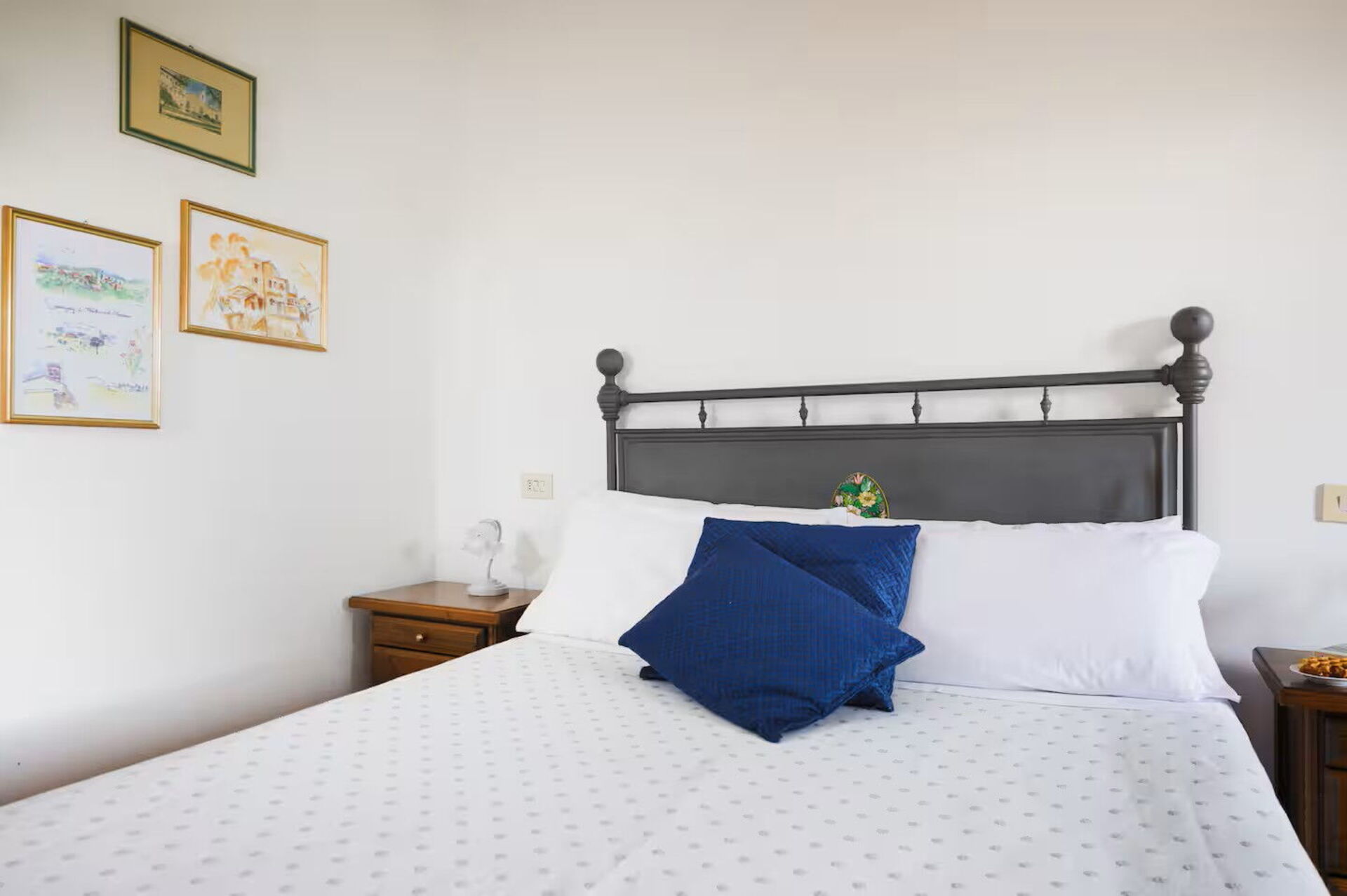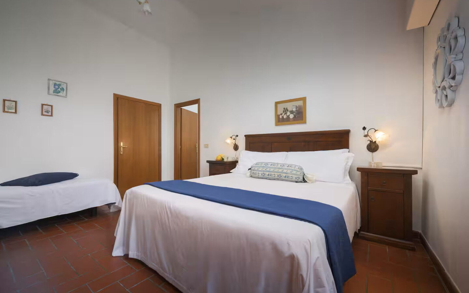 Primo piano: cucina, ampia stanza (aria condizionata) con letto matrimoniale e letto singolo, bagno con doccia.