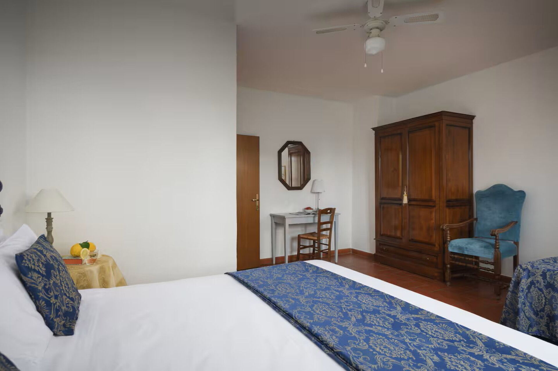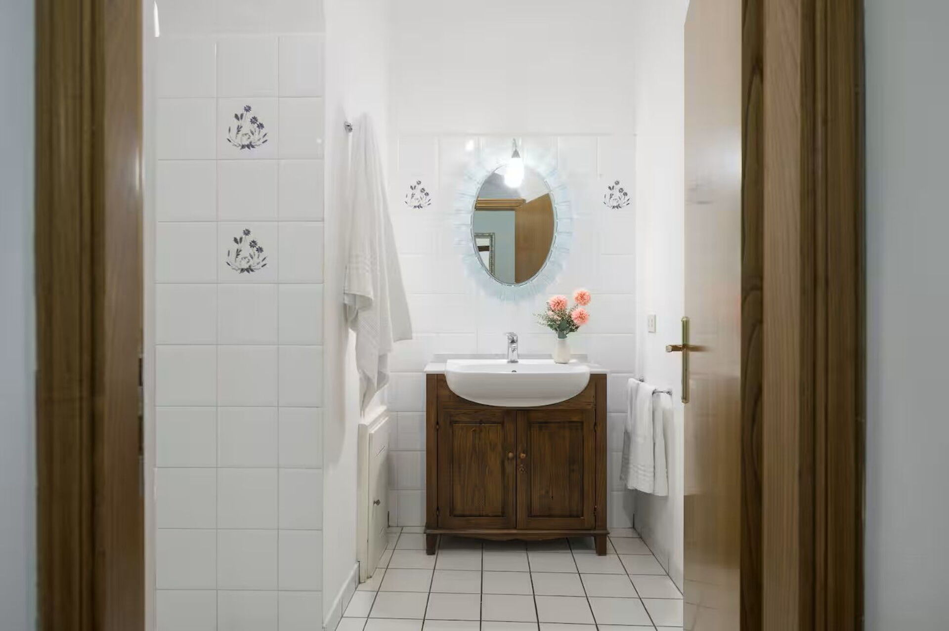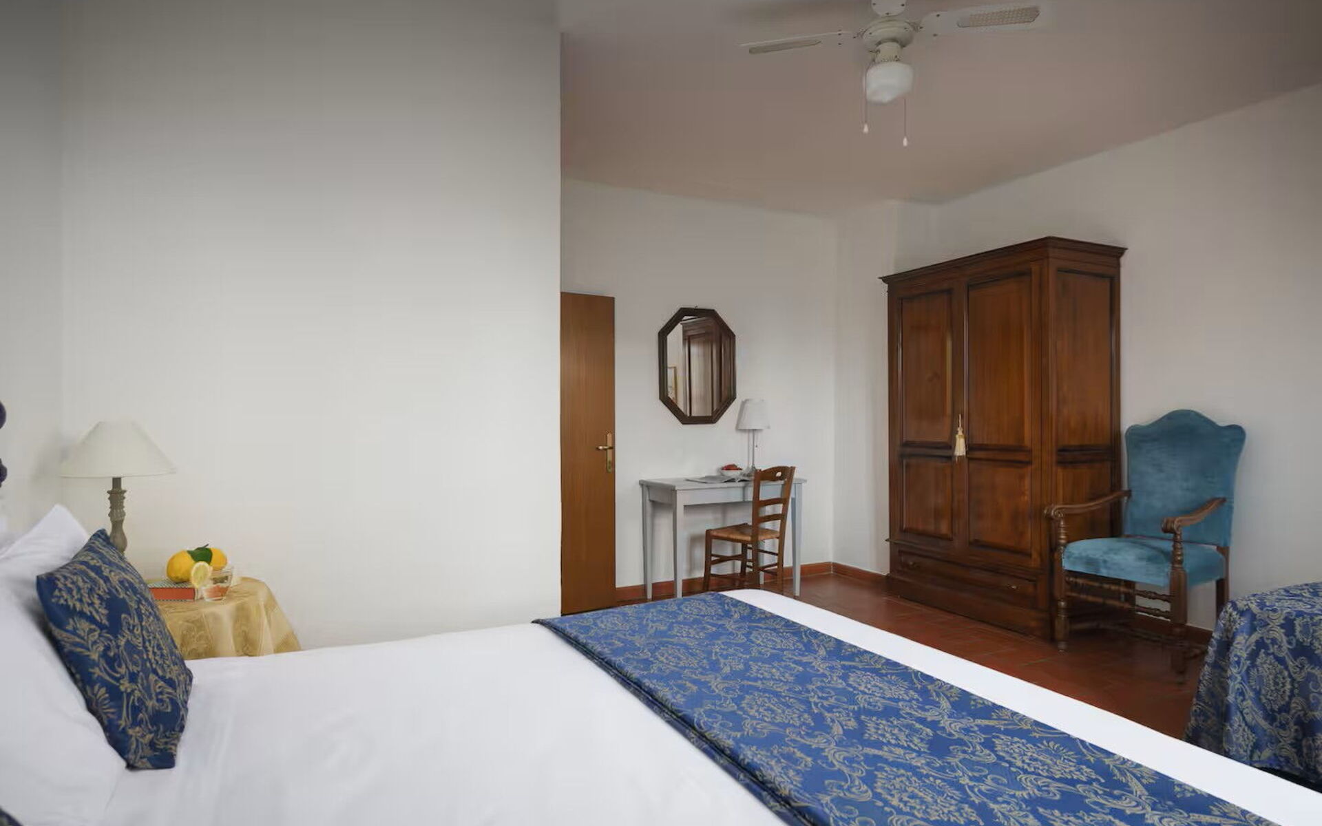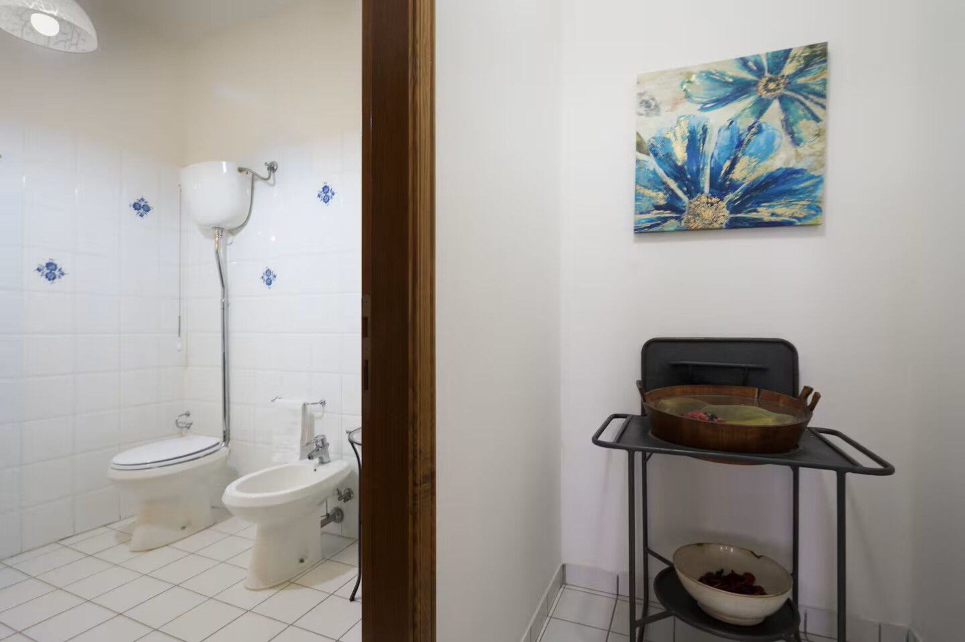 Primo piano: cucina, ampia stanza (aria condizionata) con letto matrimoniale e letto singolo, bagno con doccia.