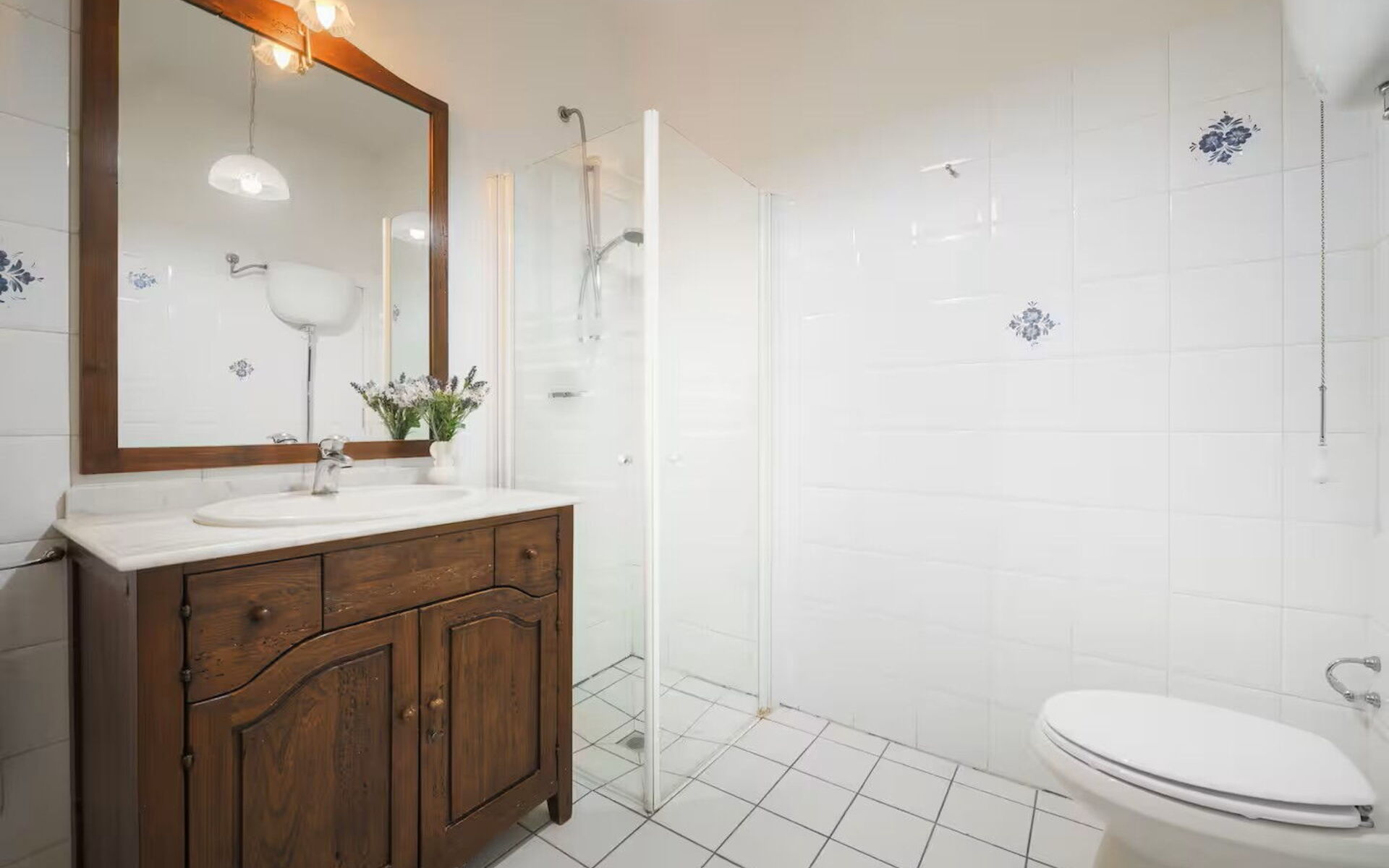 Primo piano: soggiorno con angolo cottura, camera matrimoniale (aria condizionata), camera con letto matrimoniale e letto singolo (aria condizionata), bagno con doccia.