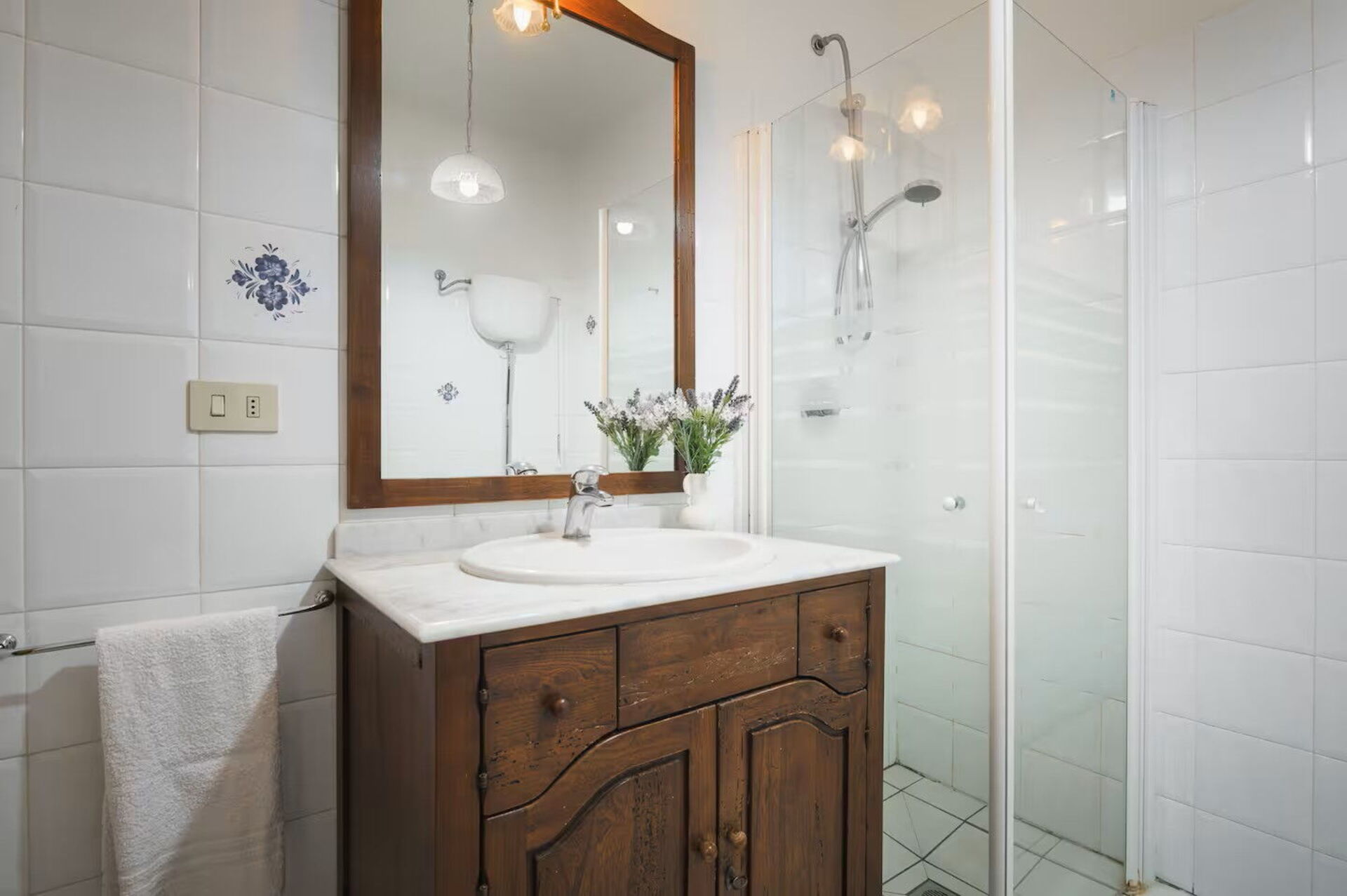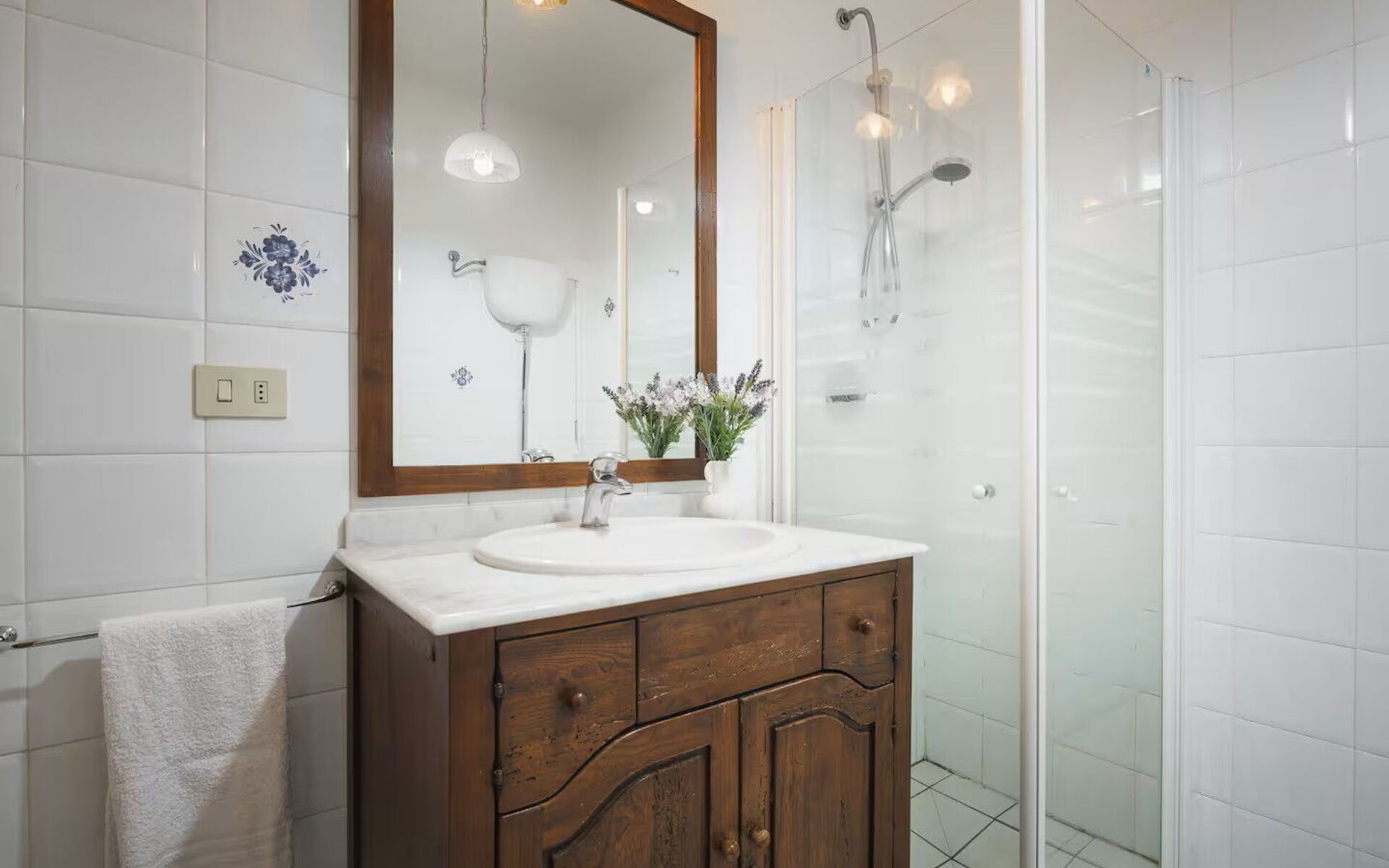 Secondo piano: soggiorno con camino e angolo cottura, camera matrimoniale (aria condizionata), bagno con doccia.