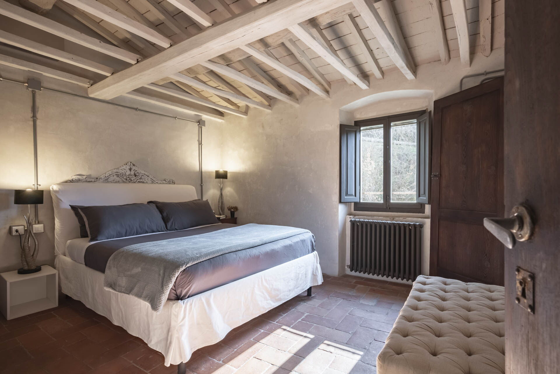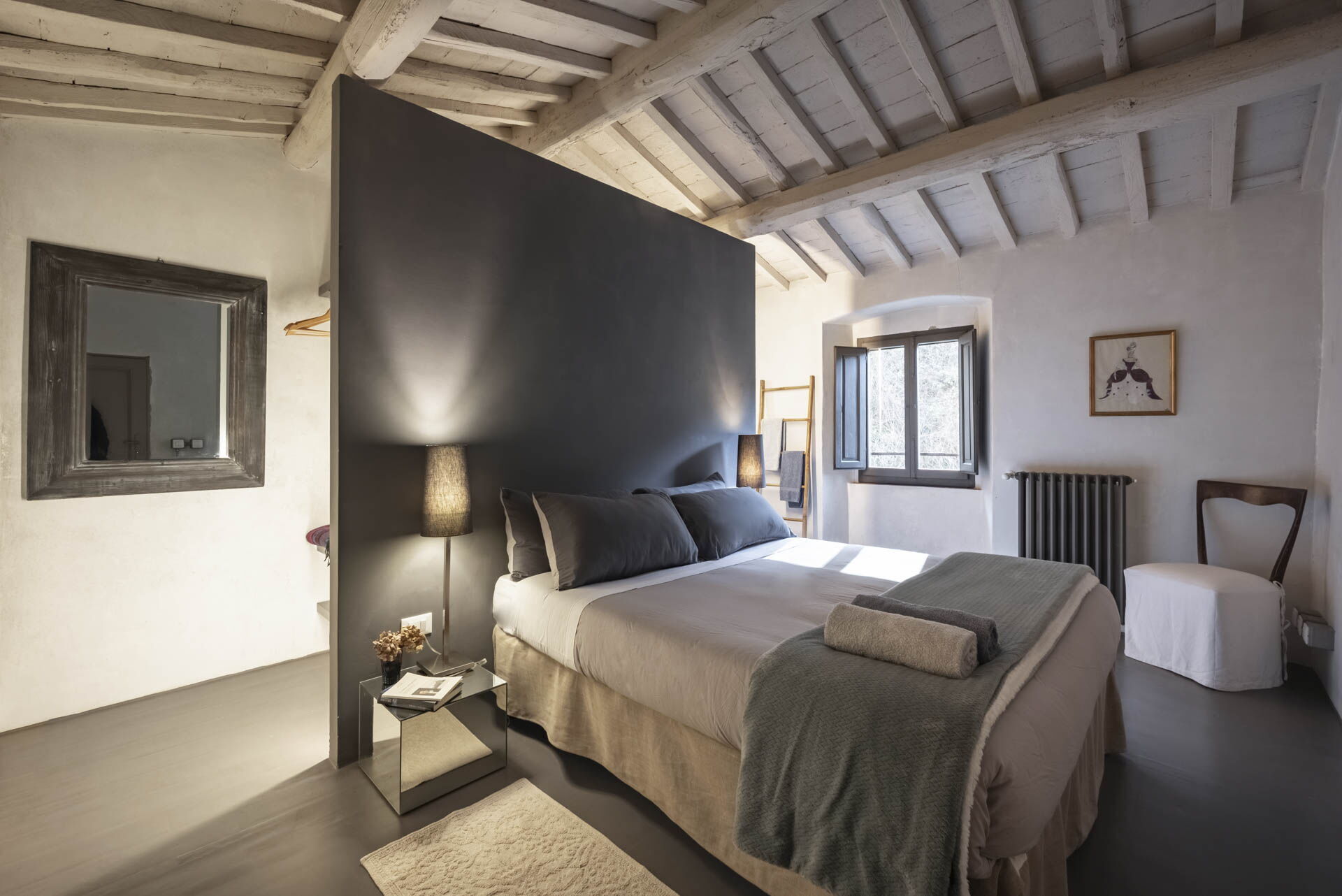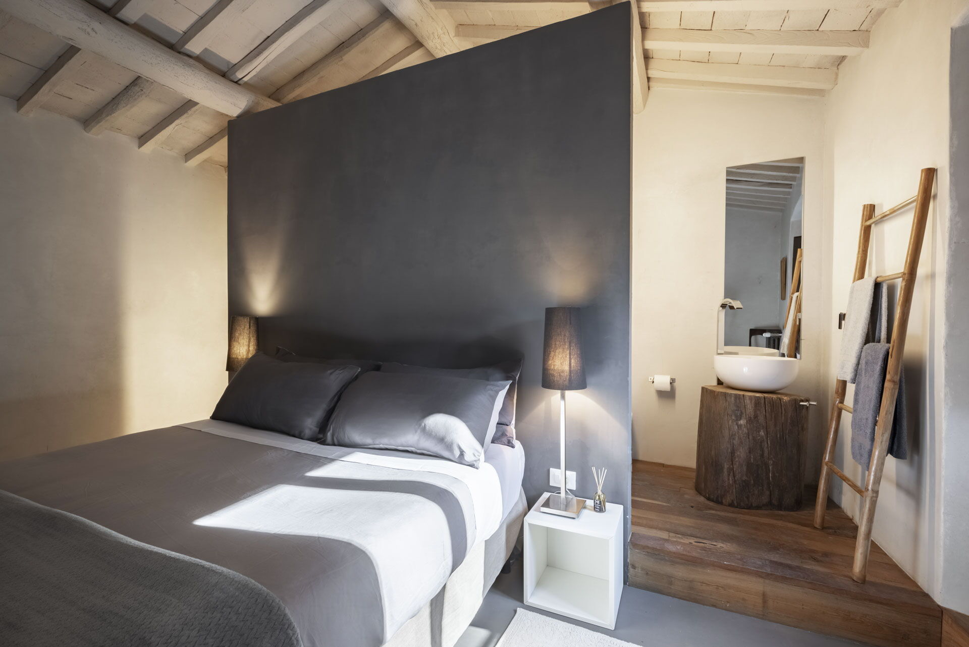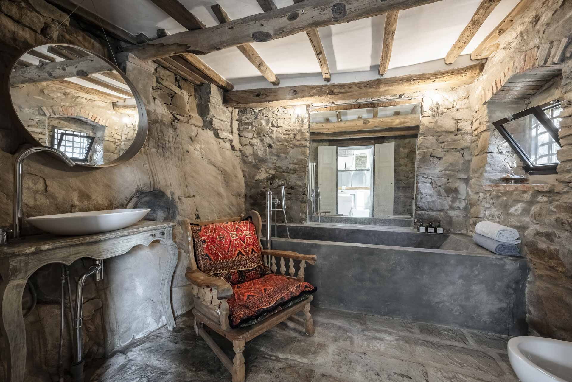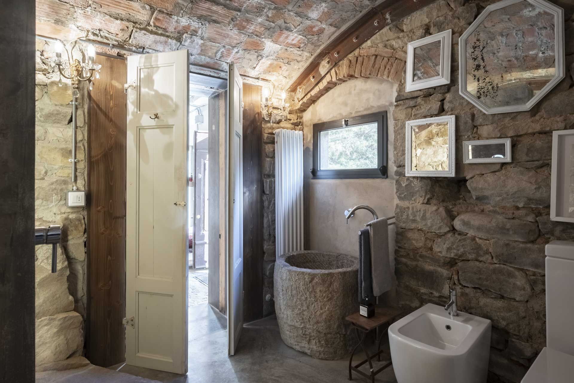 Spostandovi al secondo piano, troverete la suite padronale con tetto a capanna. Il pannello del letto divide la stanza, creando un'area guardaroba intima con una vasca e una doccia in resina. Il lavandino, ottenuto da un vecchio mortaio in pietra (pietra serena), poggia contro un tronco di quercia. Adiacente alla suite c'è una camera matrimoniale con tetto a capanna doppio e un bagno in 'sabbia bianca' - uno spazio splendido nei colori della resina e della sabbia con una grande doccia e una vista mozzafiato sul fiume. Questa camera si collega alla camera 'Ritrecine', arredata con due letti singoli, ideale per una coppia con bambini.