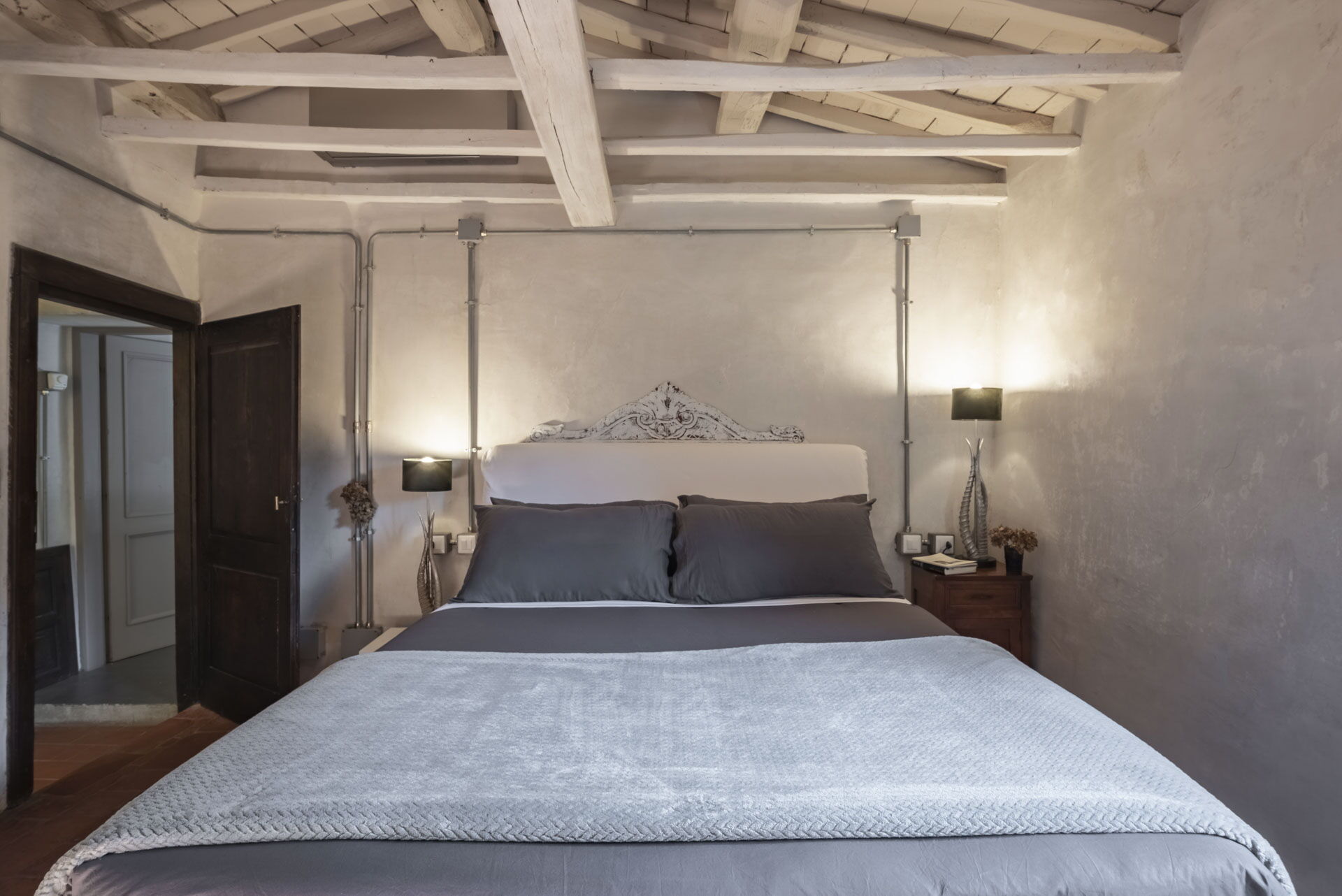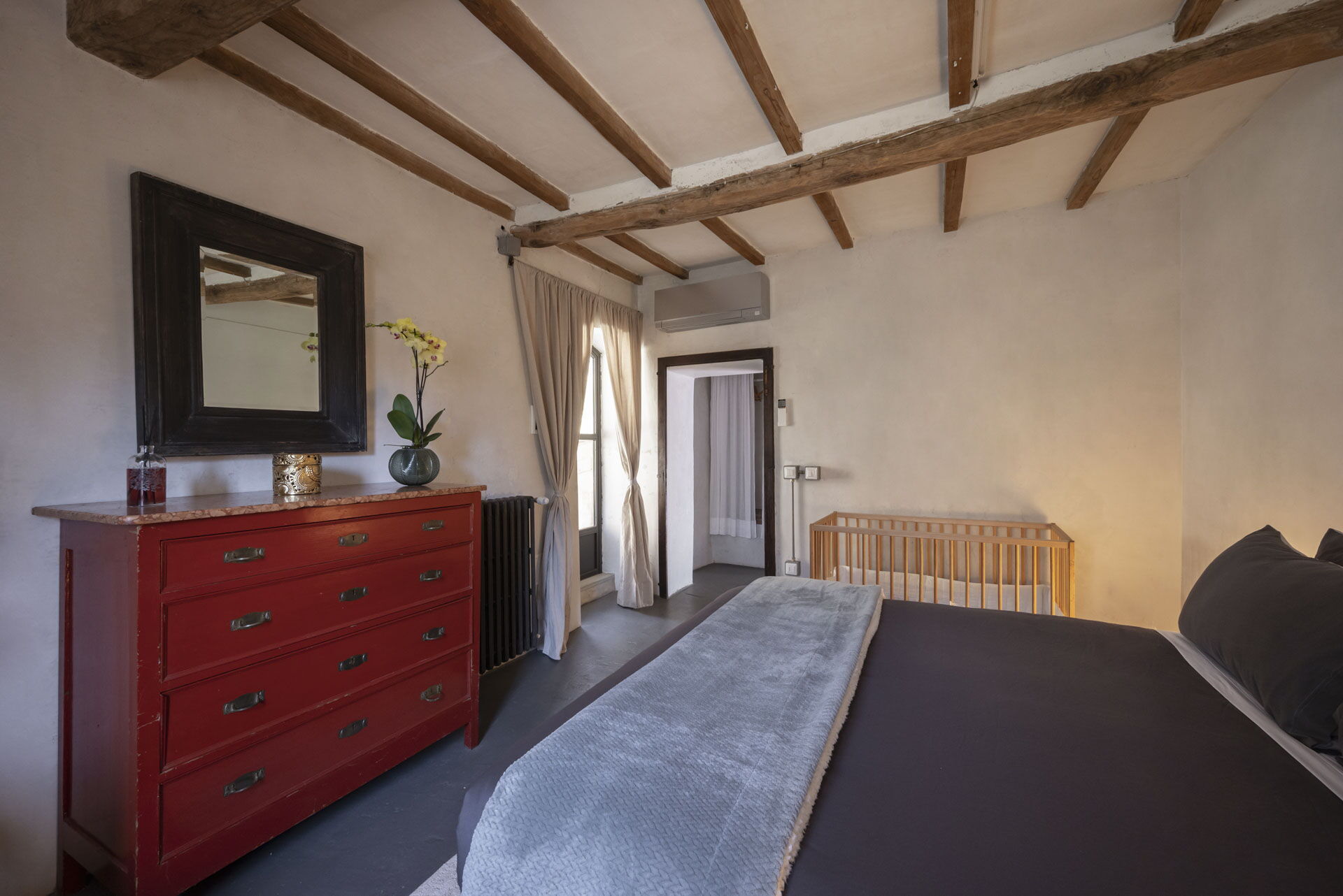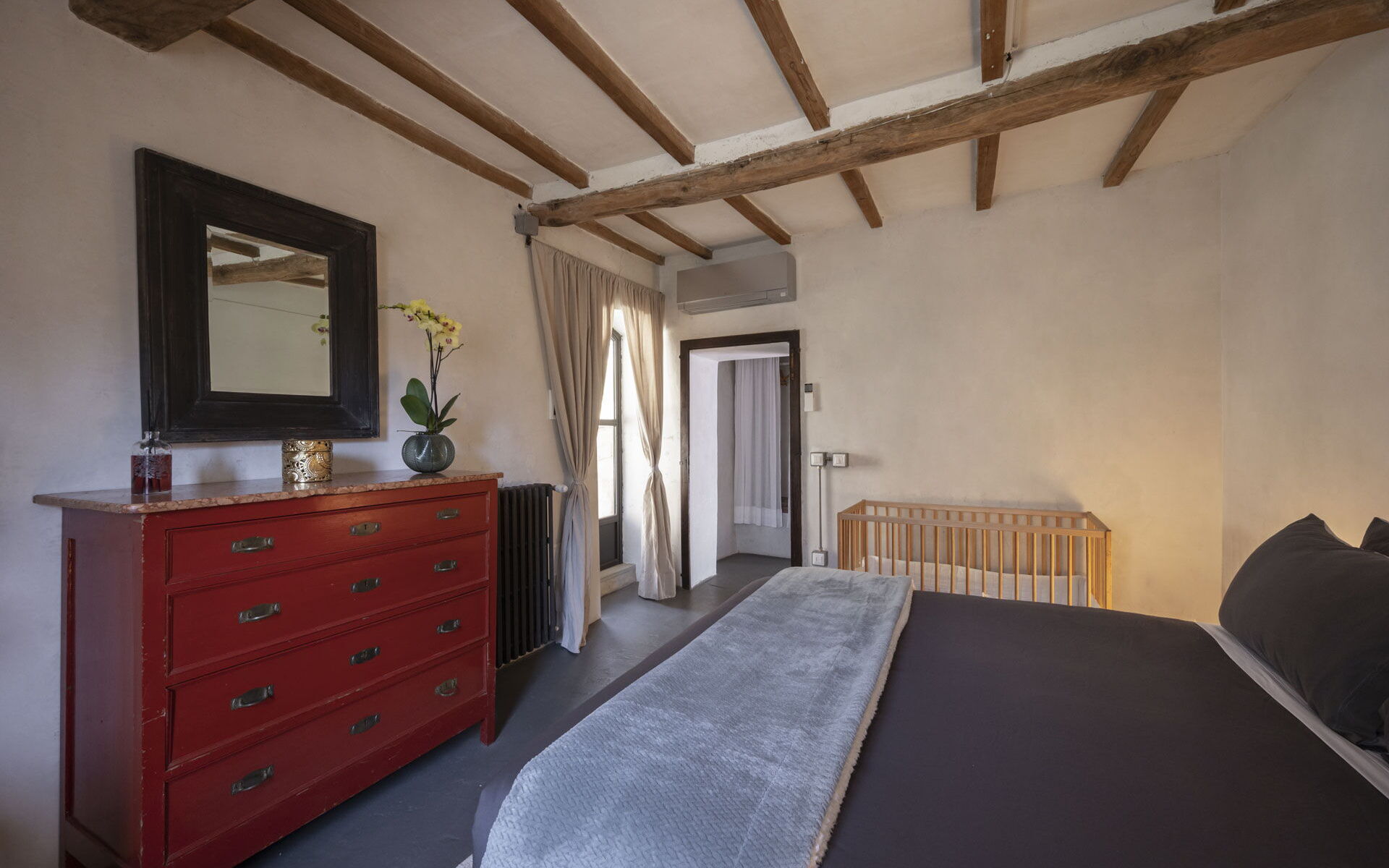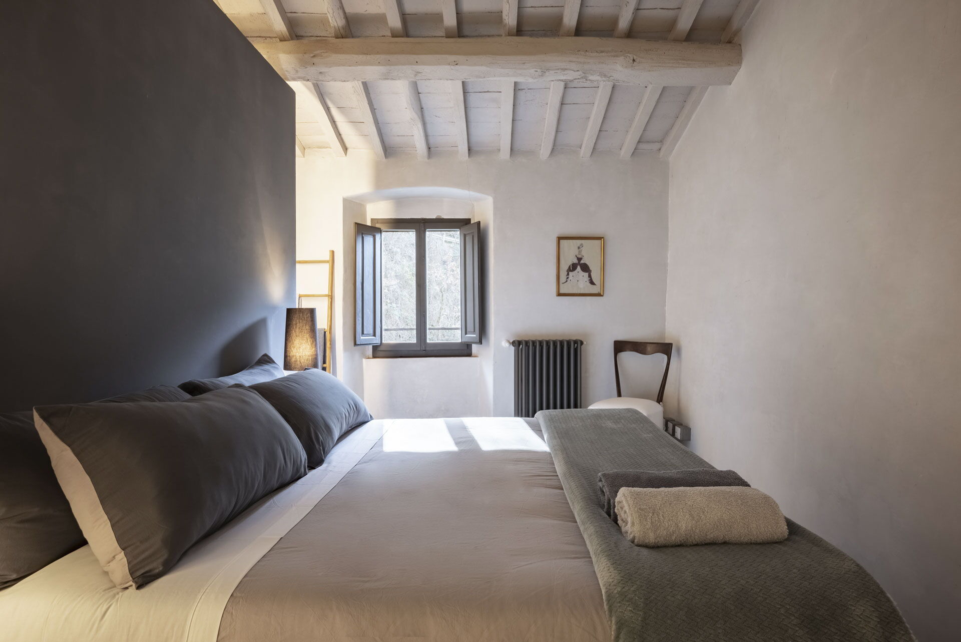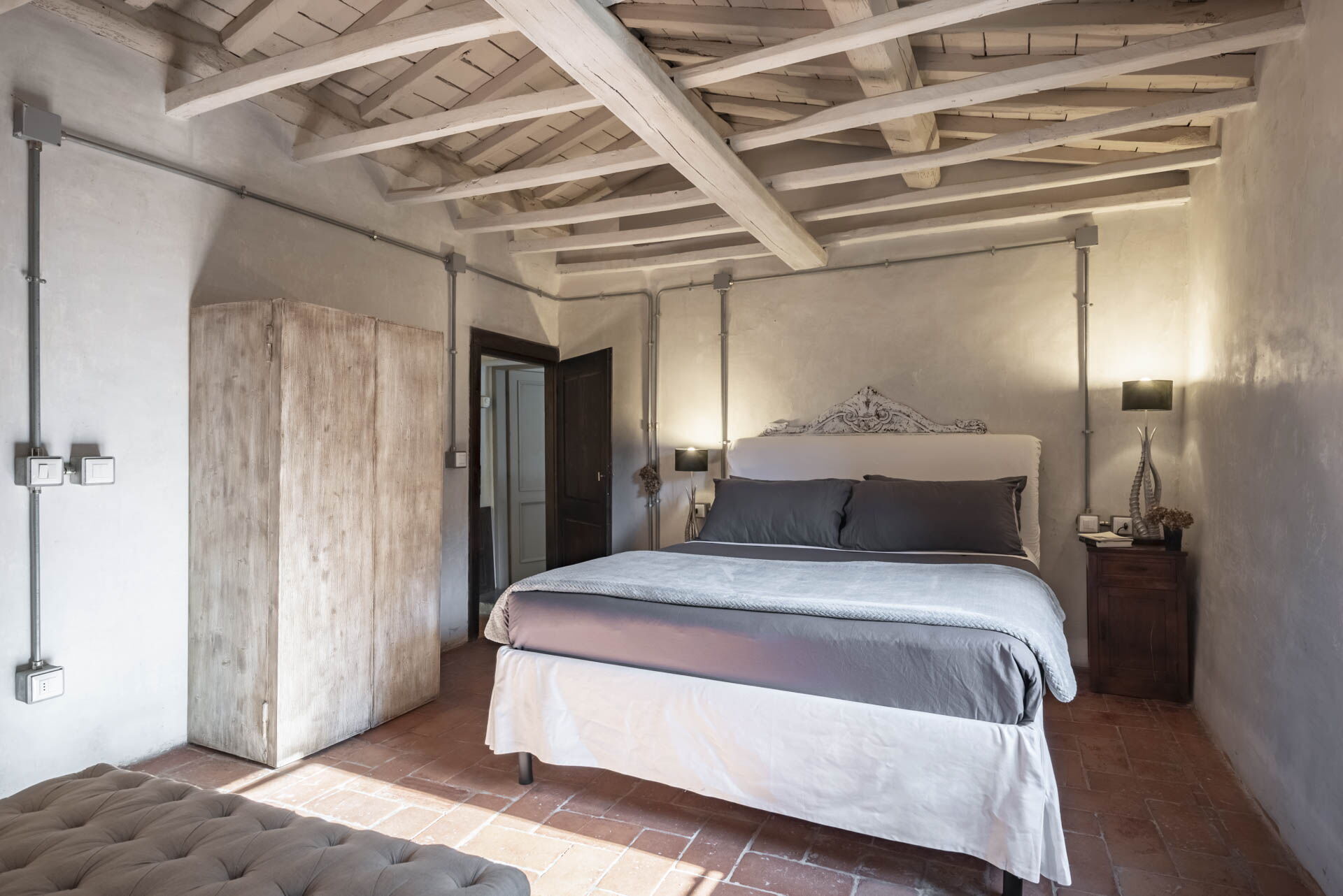 Spostandovi al secondo piano, troverete la suite padronale con tetto a capanna. Il pannello del letto divide la stanza, creando un'area guardaroba intima con una vasca e una doccia in resina. Il lavandino, ottenuto da un vecchio mortaio in pietra (pietra serena), poggia contro un tronco di quercia. Adiacente alla suite c'è una camera matrimoniale con tetto a capanna doppio e un bagno in 'sabbia bianca' - uno spazio splendido nei colori della resina e della sabbia con una grande doccia e una vista mozzafiato sul fiume. Questa camera si collega alla camera 'Ritrecine', arredata con due letti singoli, ideale per una coppia con bambini.