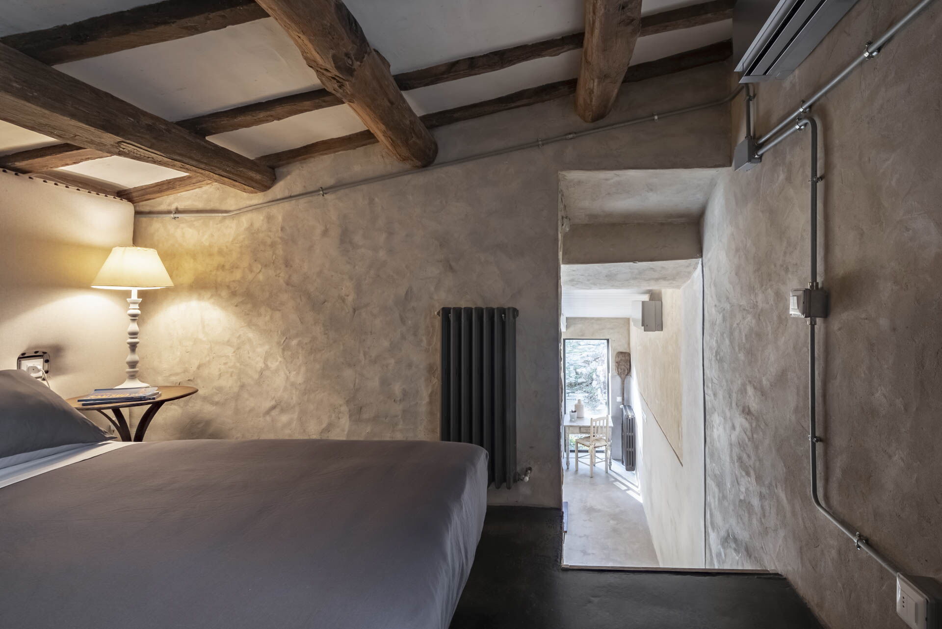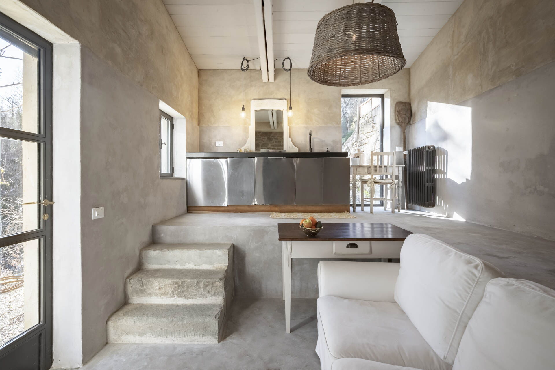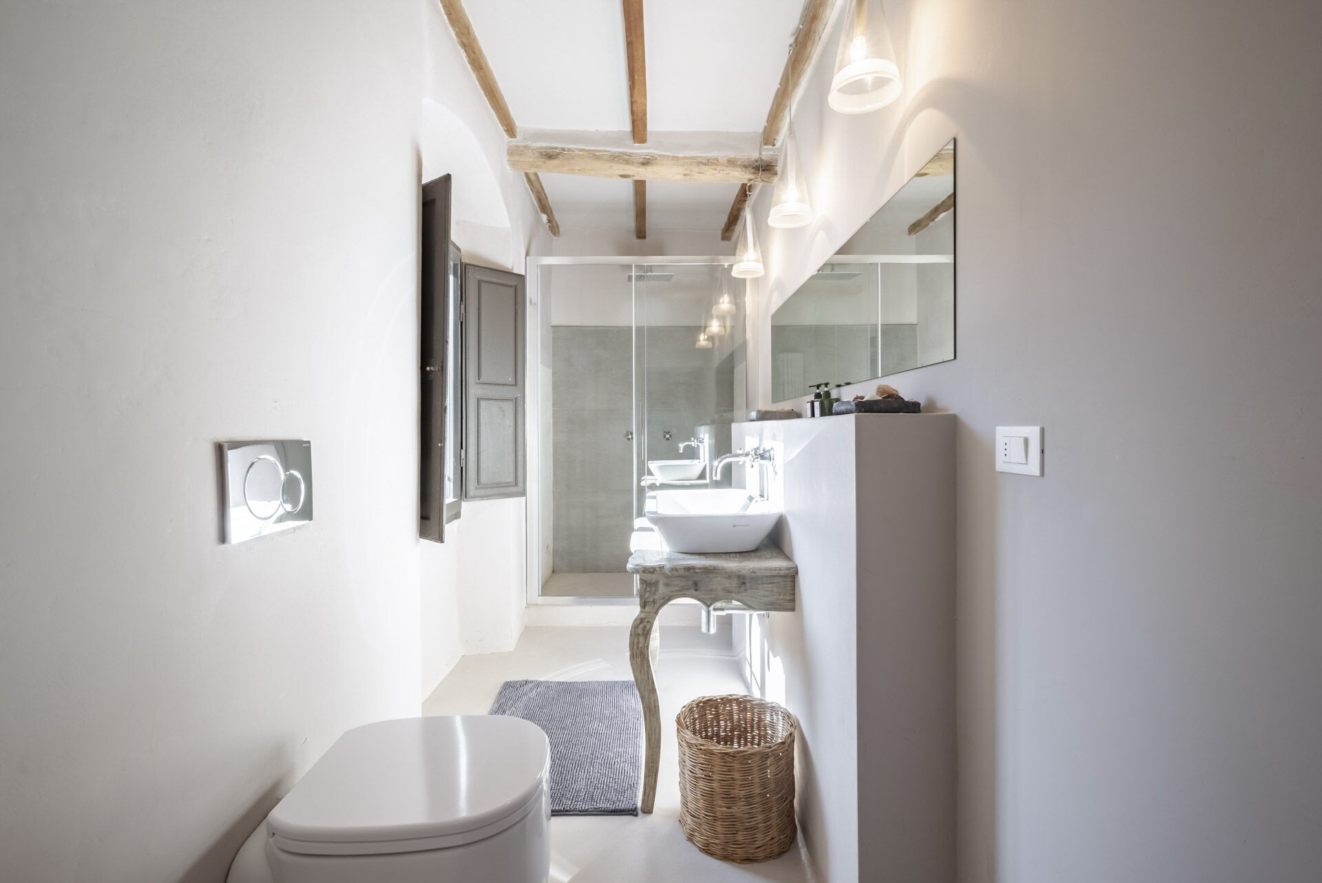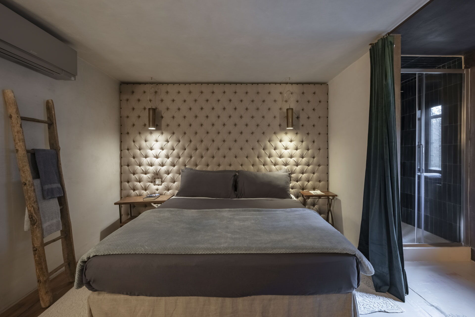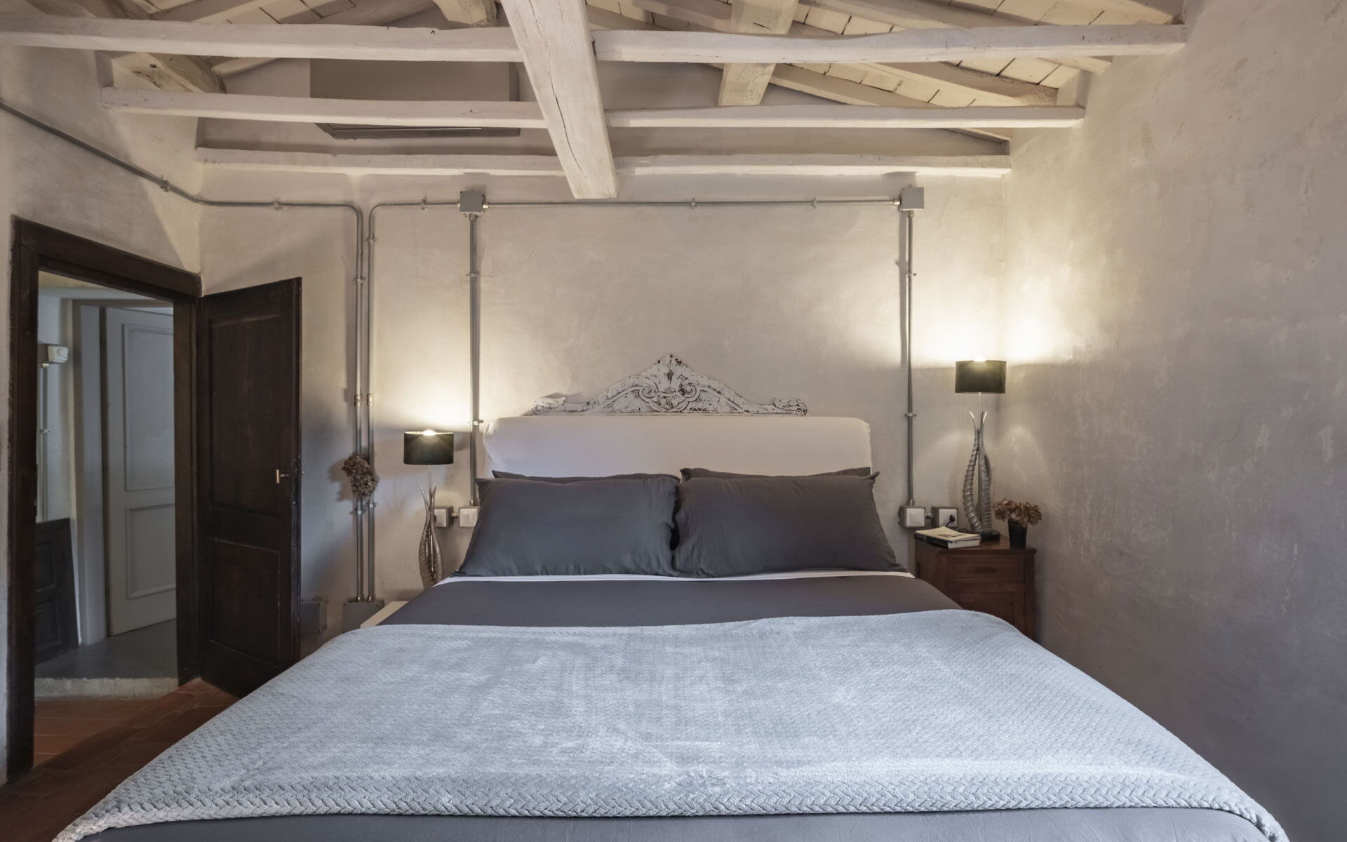 Spostandovi al secondo piano, troverete la suite padronale con tetto a capanna. Il pannello del letto divide la stanza, creando un'area guardaroba intima con una vasca e una doccia in resina. Il lavandino, ottenuto da un vecchio mortaio in pietra (pietra serena), poggia contro un tronco di quercia. Adiacente alla suite c'è una camera matrimoniale con tetto a capanna doppio e un bagno in 'sabbia bianca' - uno spazio splendido nei colori della resina e della sabbia con una grande doccia e una vista mozzafiato sul fiume. Questa camera si collega alla camera 'Ritrecine', arredata con due letti singoli, ideale per una coppia con bambini.