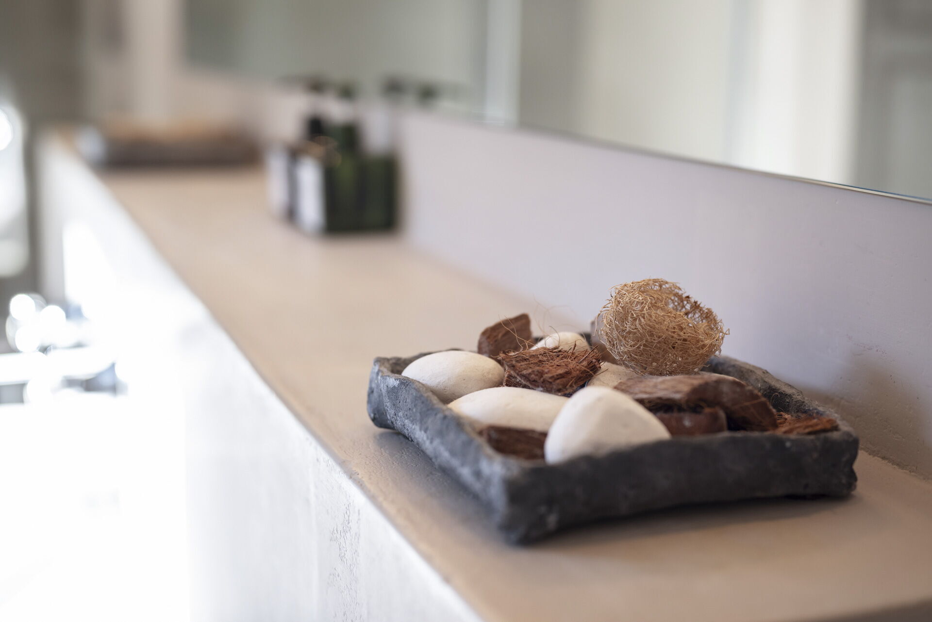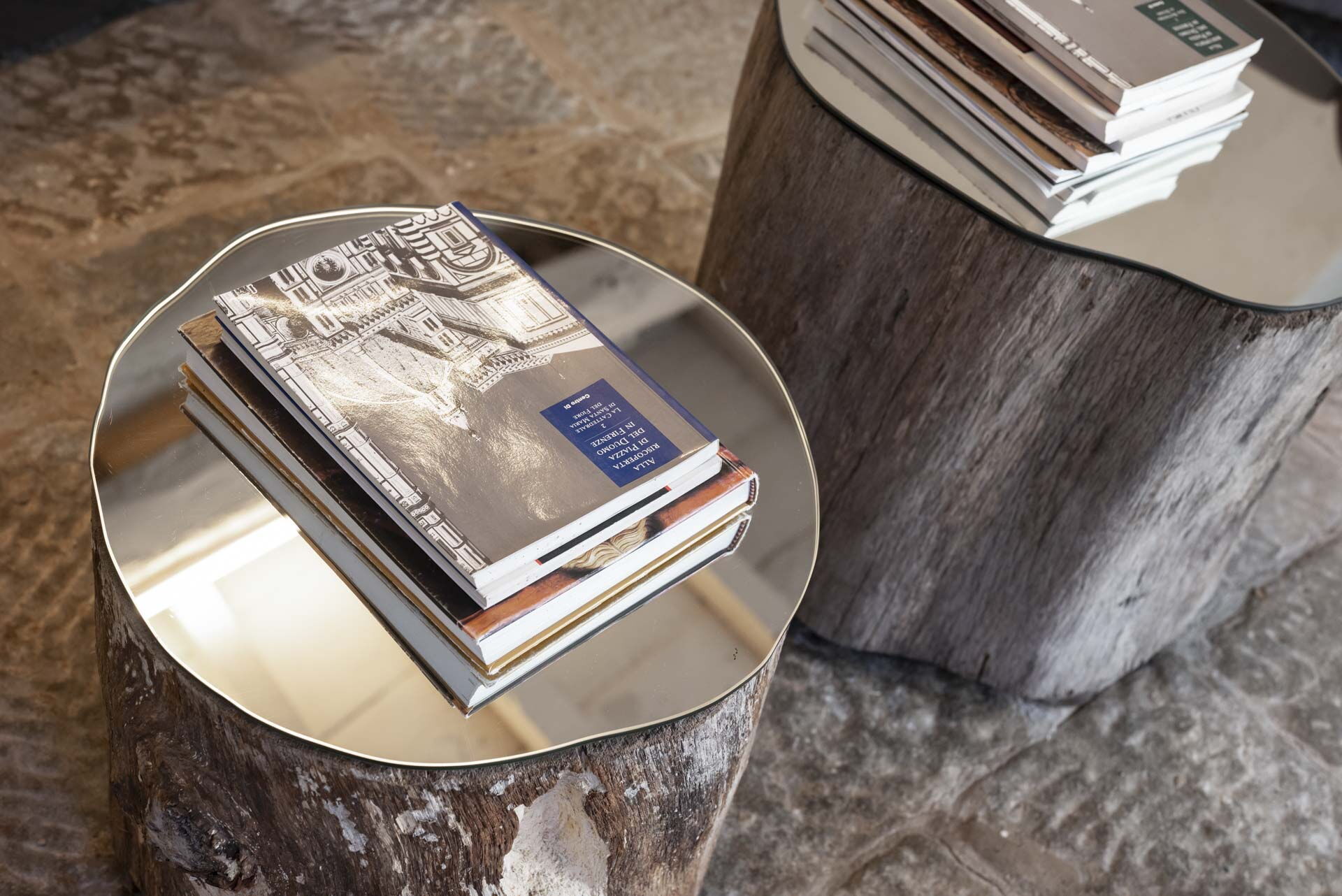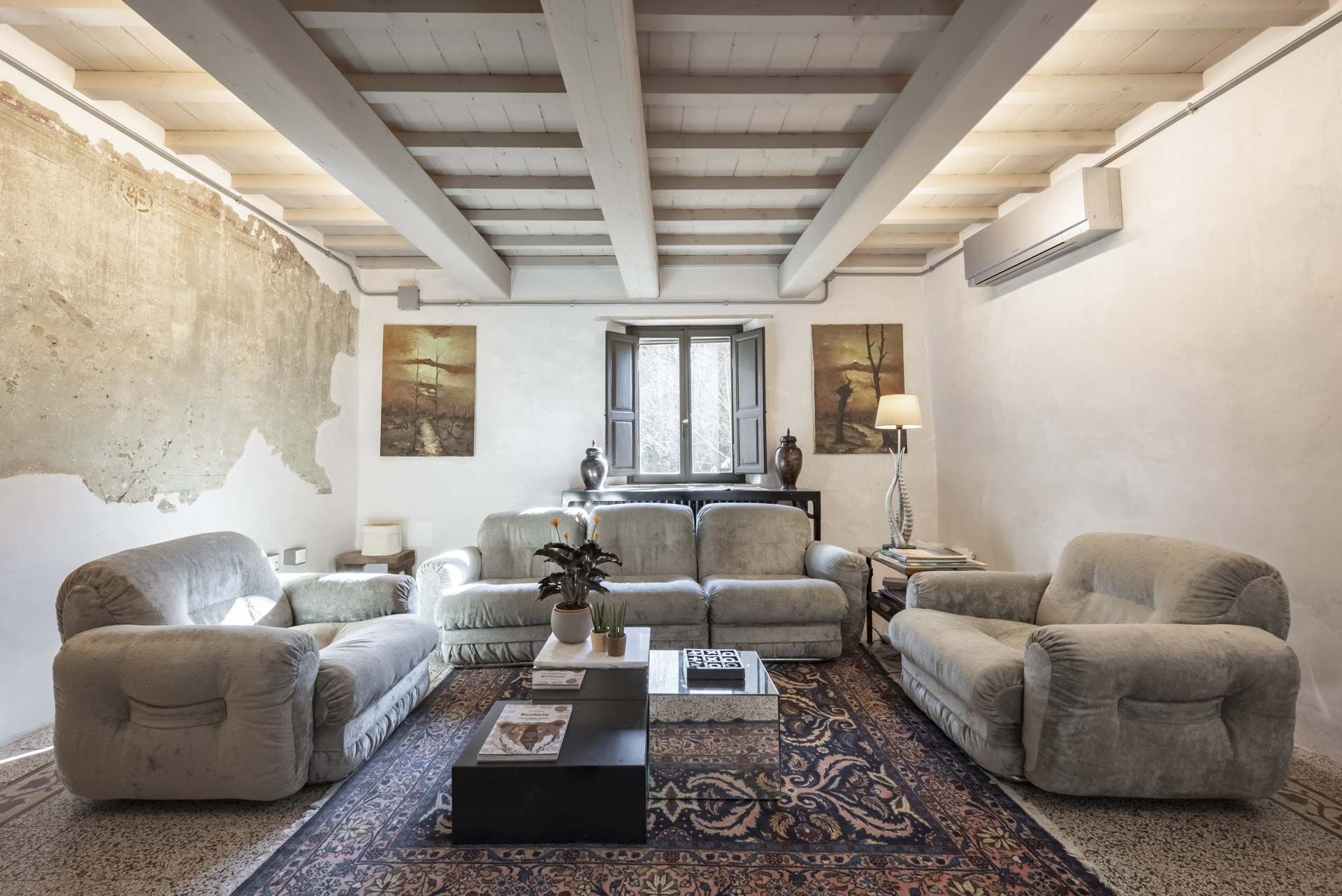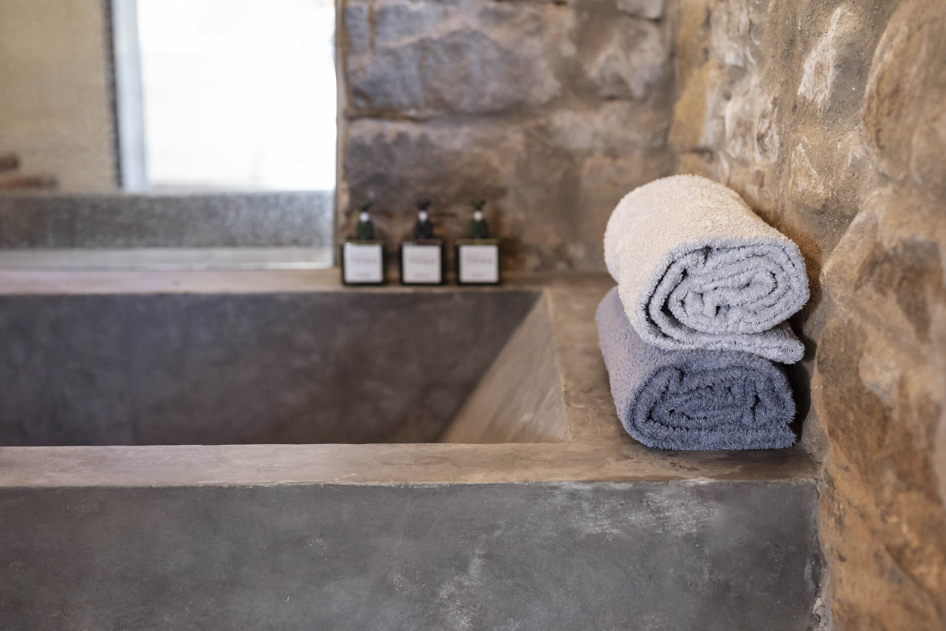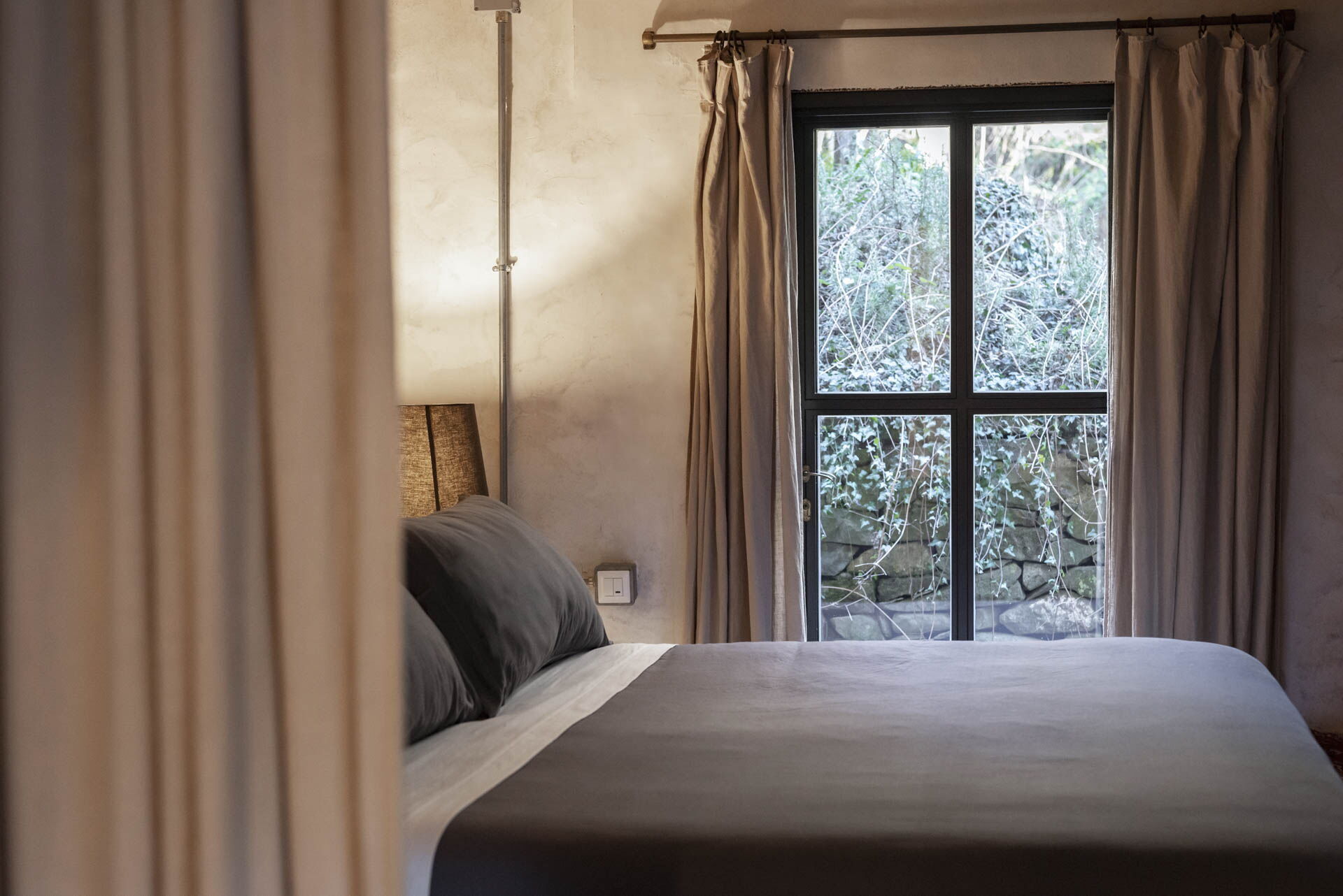 Spostandovi al secondo piano, troverete la suite padronale con tetto a capanna. Il pannello del letto divide la stanza, creando un'area guardaroba intima con una vasca e una doccia in resina. Il lavandino, ottenuto da un vecchio mortaio in pietra (pietra serena), poggia contro un tronco di quercia. Adiacente alla suite c'è una camera matrimoniale con tetto a capanna doppio e un bagno in 'sabbia bianca' - uno spazio splendido nei colori della resina e della sabbia con una grande doccia e una vista mozzafiato sul fiume. Questa camera si collega alla camera 'Ritrecine', arredata con due letti singoli, ideale per una coppia con bambini.
