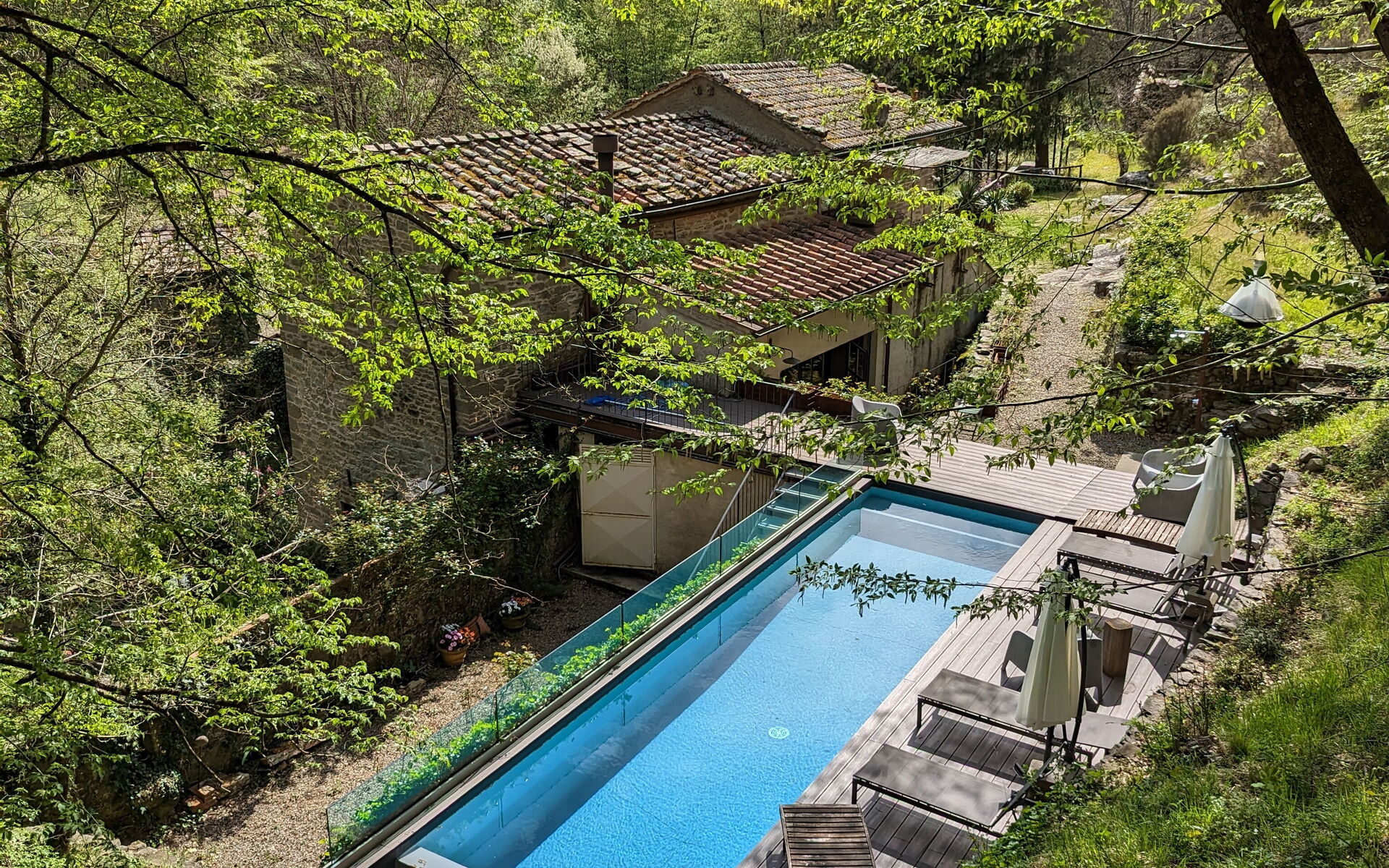Nel retro dell'edificio, seguendo il sentiero delle rose bianche, scoprirete la nostra piscina a idrolisi - la 'vasca nera' - derivata dal vecchio stagno del mulino. Uno dei piaceri più tranquilli è fare una passeggiata lungo il fiume per godersi la bellezza di questo luogo incantevole e incontaminato, che a volte può sembrare surreale.