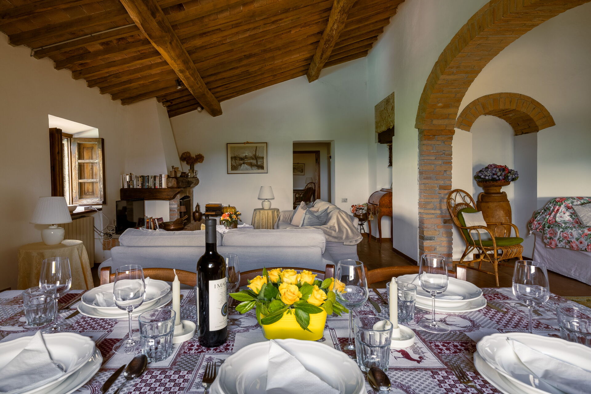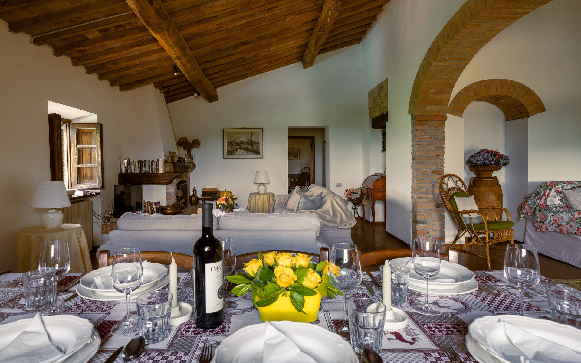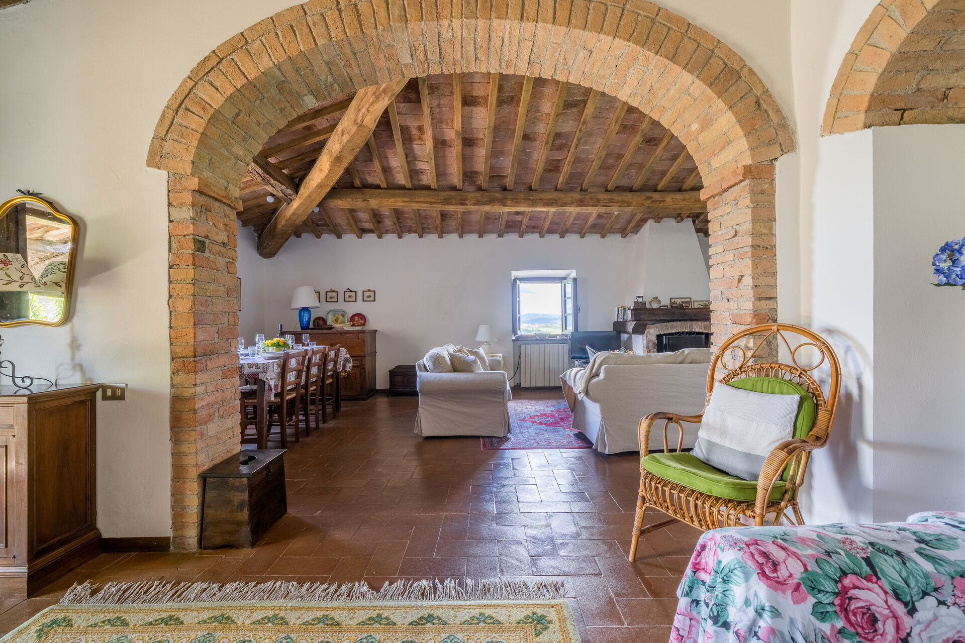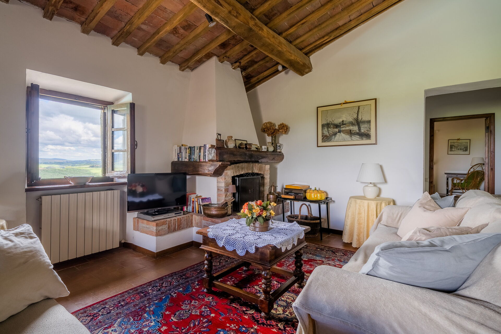 Soggiorno: caminetto, tavolo da pranzo, divano letto matrimoniale, internet WIFI, televisione, uscita sul balcone.