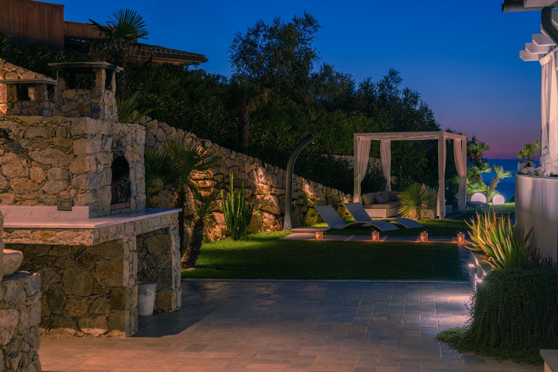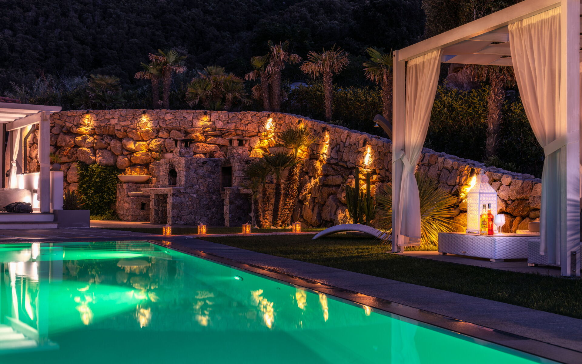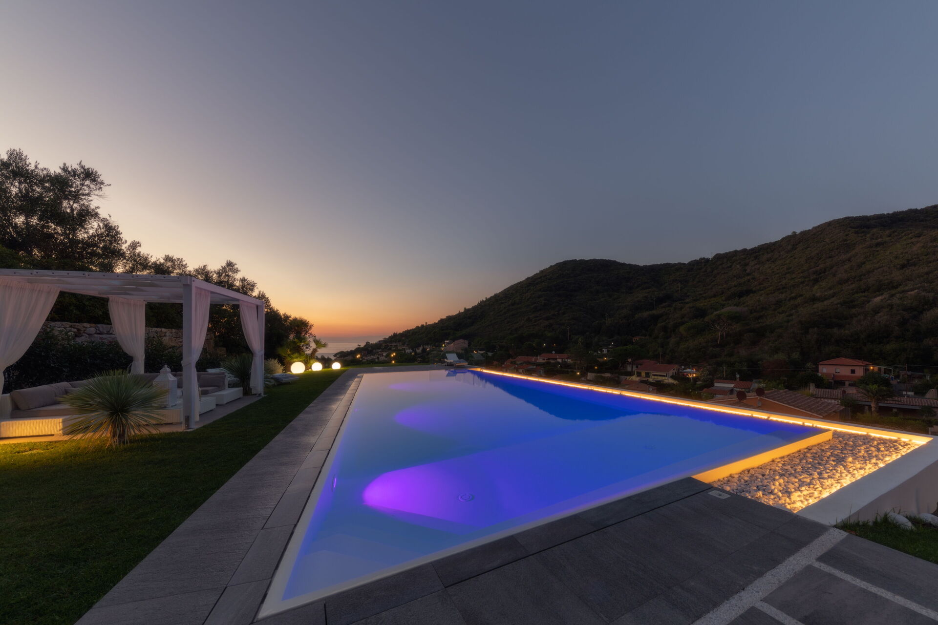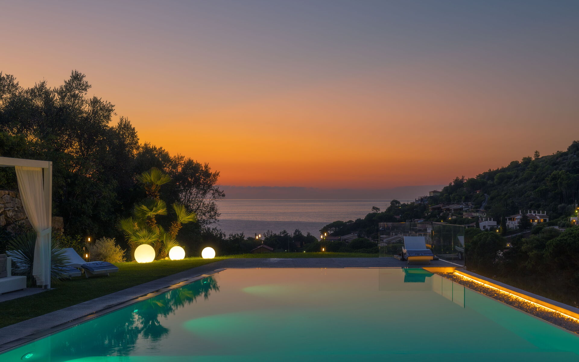 Un curatissimo giardino circonda la struttura, anch'esso frutto di uno studio attento ad ogni particolare. Dal giardino potrete apprezzare lo scenario mozzafiato della natura circostante e del panorama della baia marittima , qui troverete una bellissima piscina a sfioro con acqua salata (13m x 5,5m, profondità minima 0,50 mt - profondità massima 1,5 mt - aperta da aprile ad ottobre) completa getti idromassaggio, doccia esterna e cromoterapia.