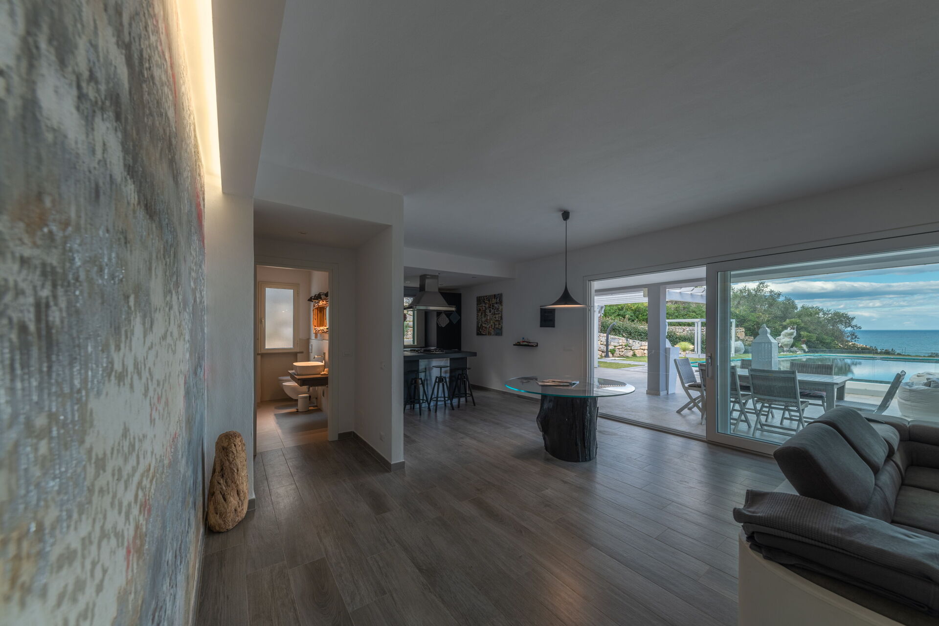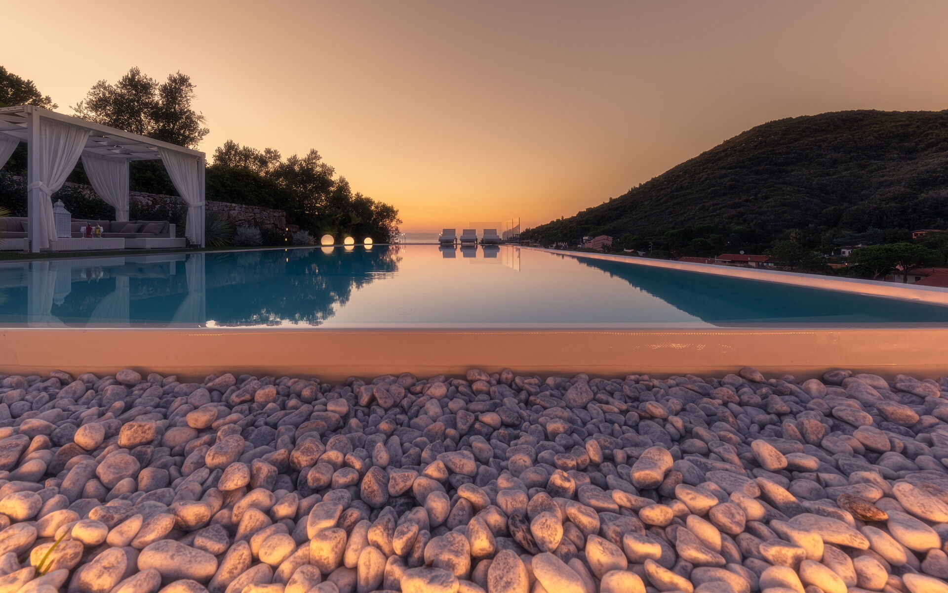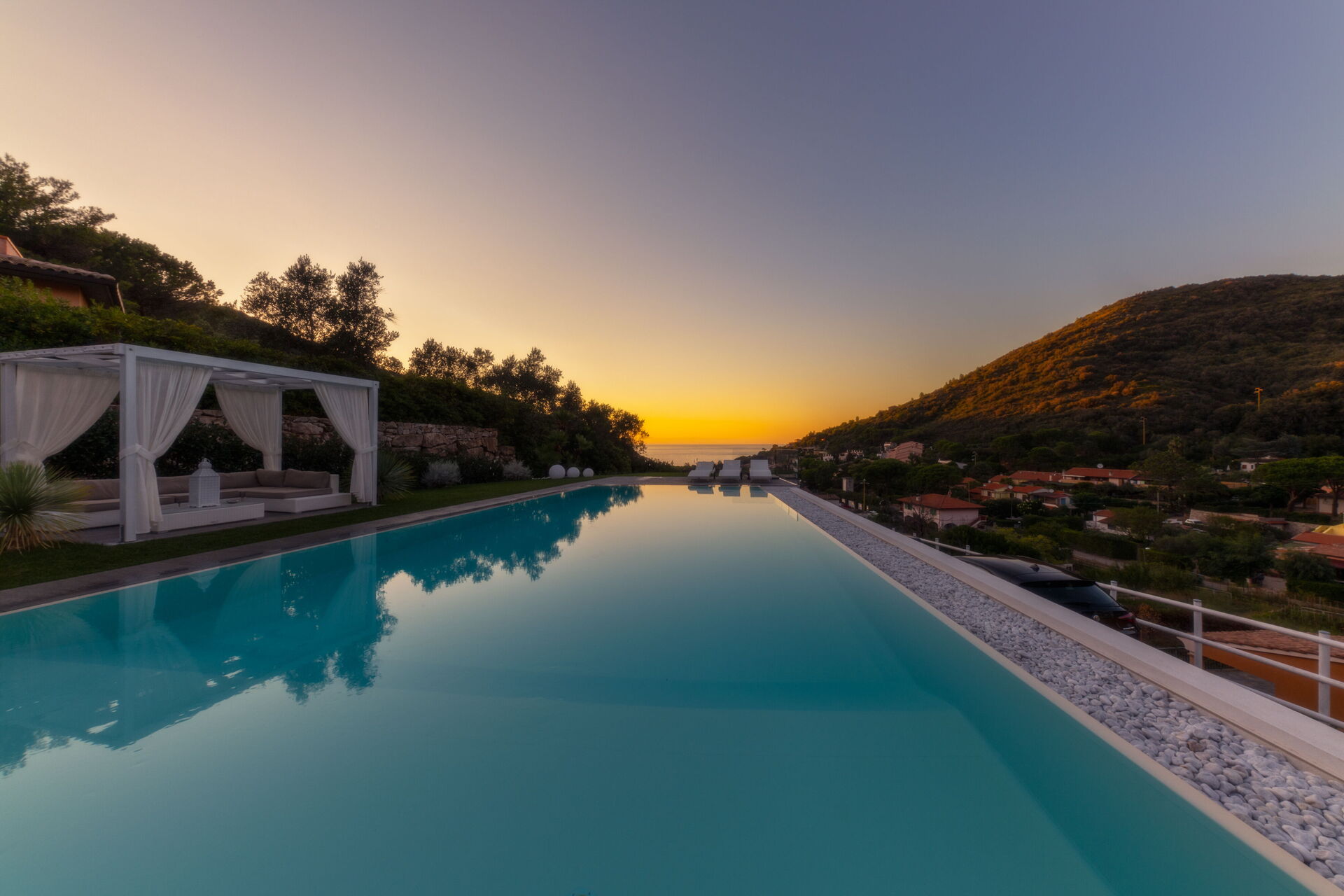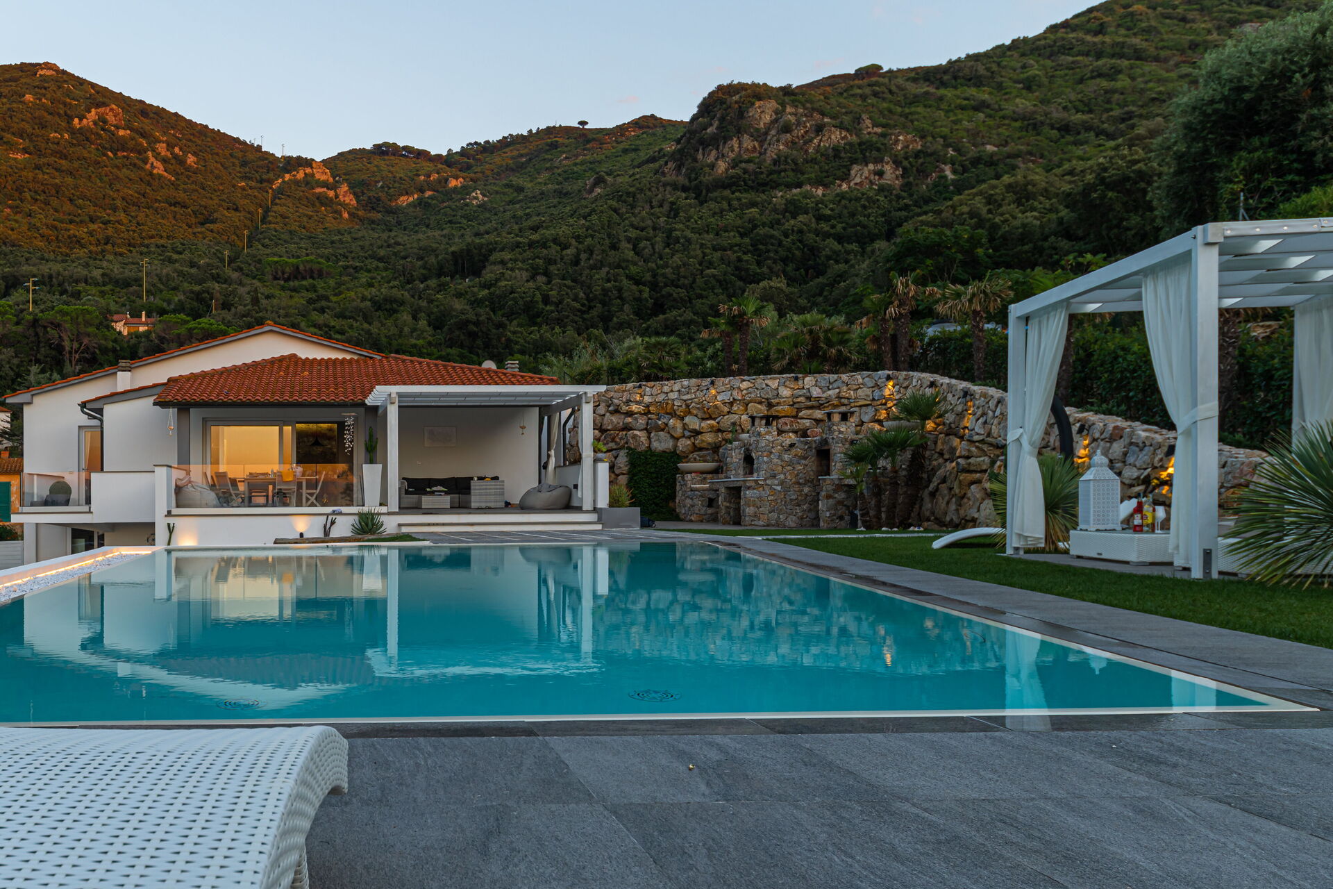 Un curatissimo giardino circonda la struttura, anch'esso frutto di uno studio attento ad ogni particolare. Dal giardino potrete apprezzare lo scenario mozzafiato della natura circostante e del panorama della baia marittima , qui troverete una bellissima piscina a sfioro con acqua salata (13m x 5,5m, profondità minima 0,50 mt - profondità massima 1,5 mt - aperta da aprile ad ottobre) completa getti idromassaggio, doccia esterna e cromoterapia.