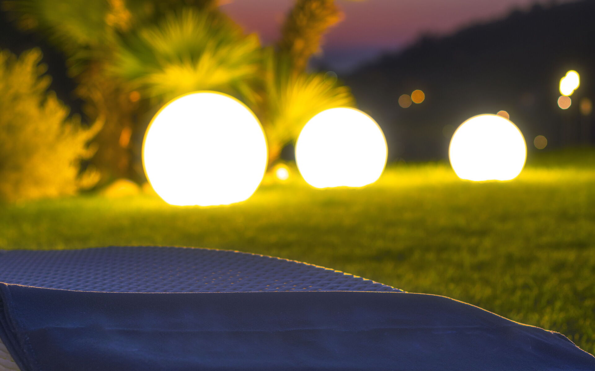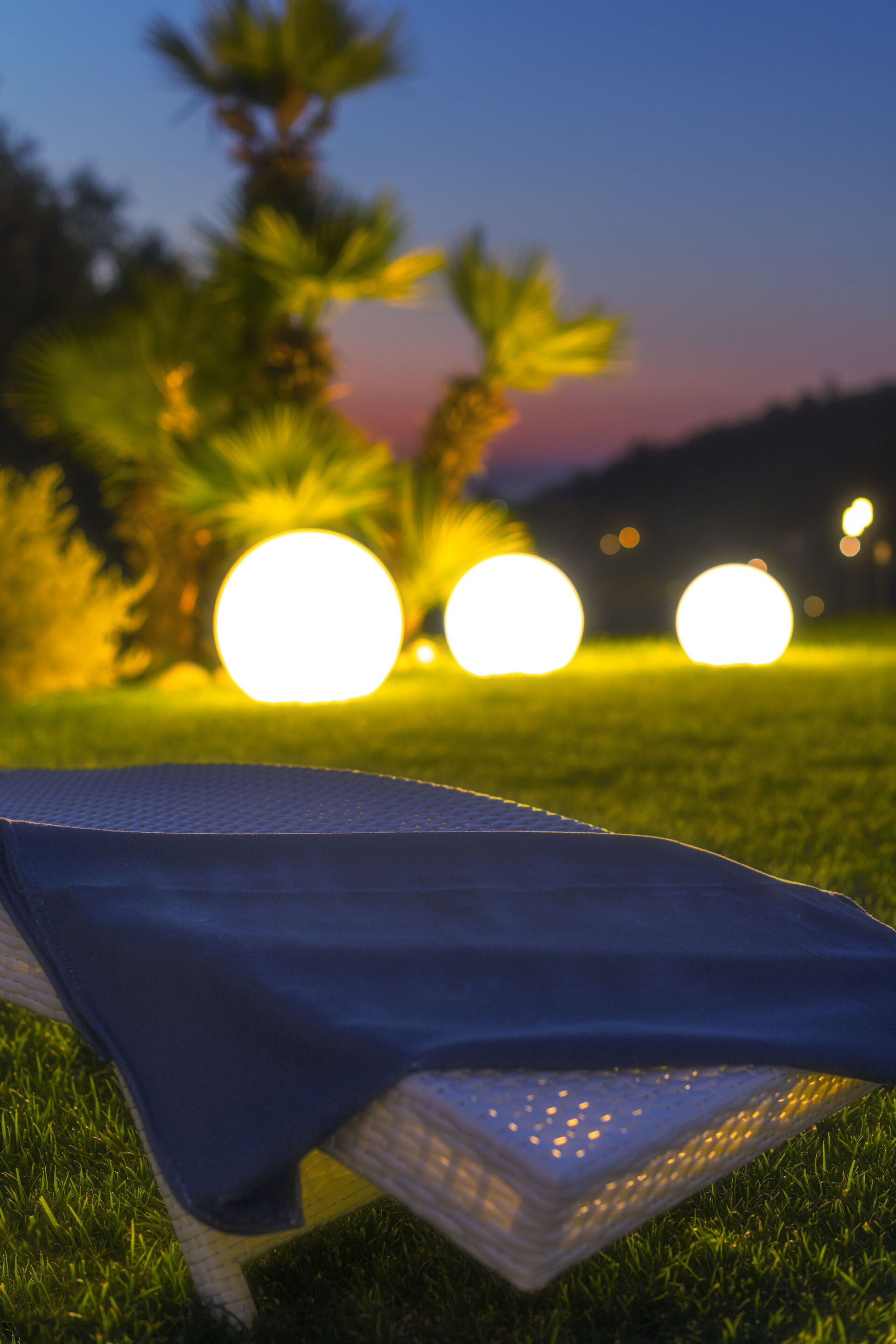 Il giardino che circonda la piscina è attrezzato con divani , lettini prendisole e pouf , decorato con da piante grasse e palme .