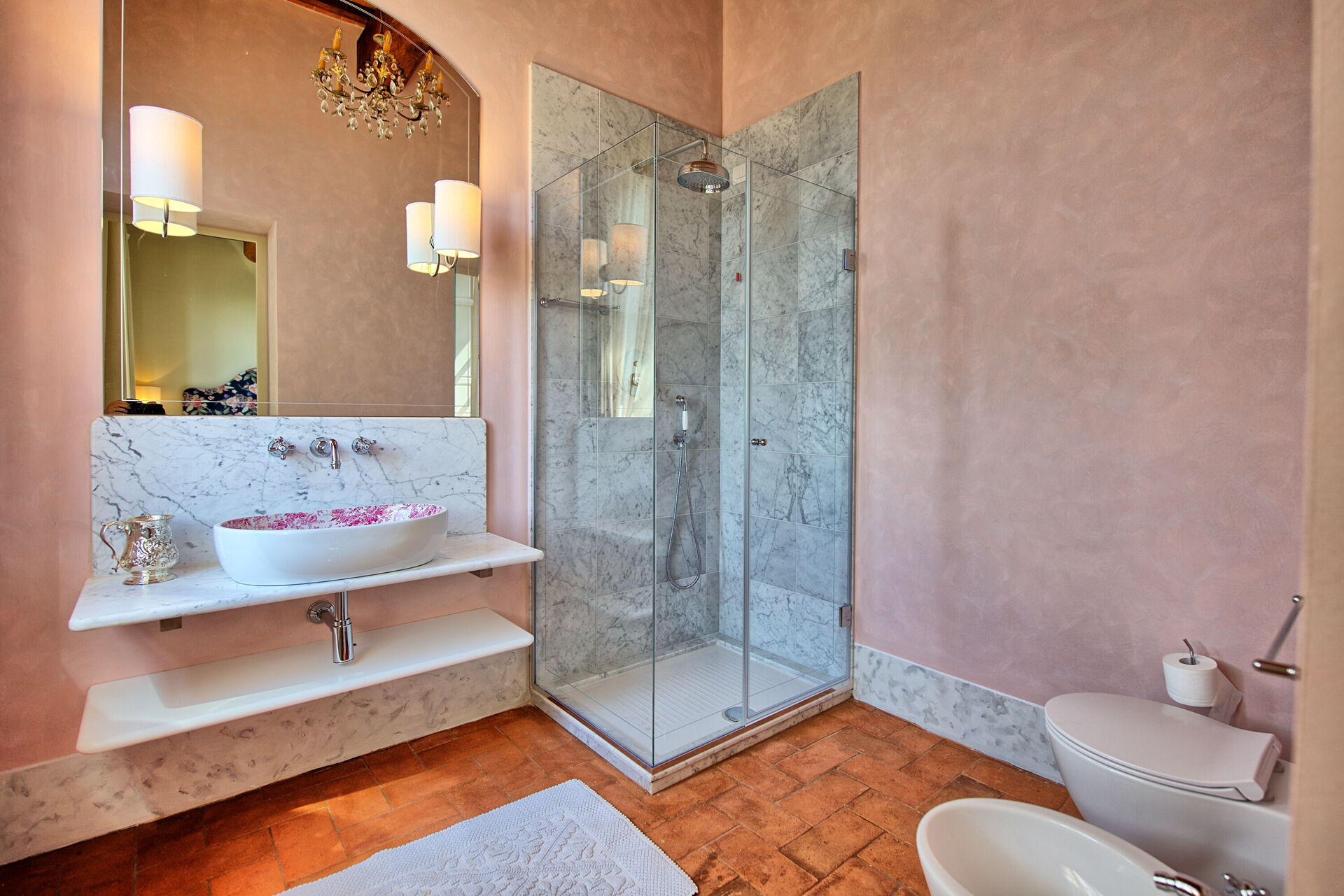 Primo piano: camera matrimoniale con bagno privato con doccia, camera con 2 letti singoli (larghezza 130 cm e unibili su richiesta per creare un grande letto matrimoniale) e bagno privato con doccia.
