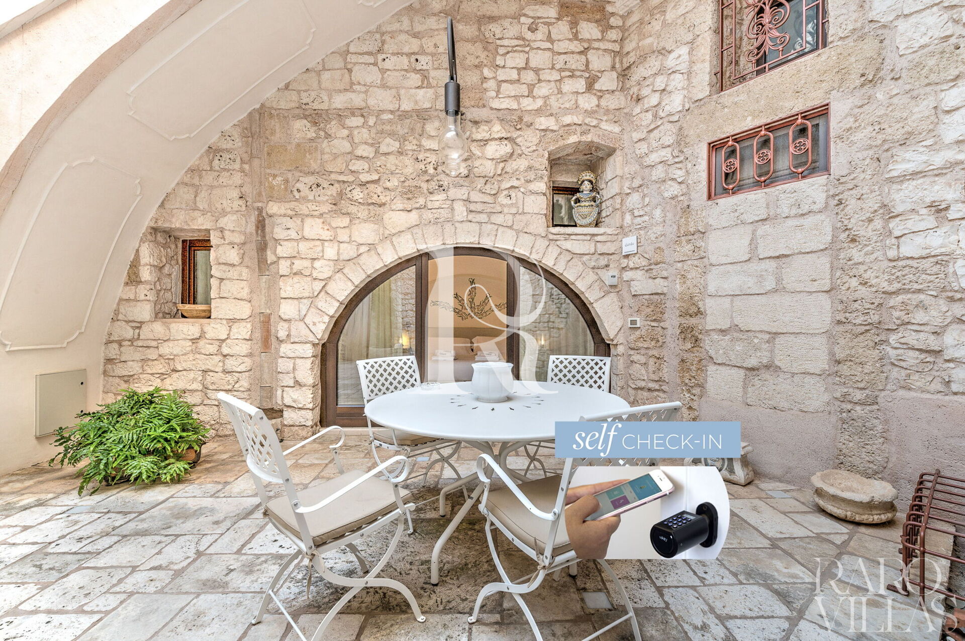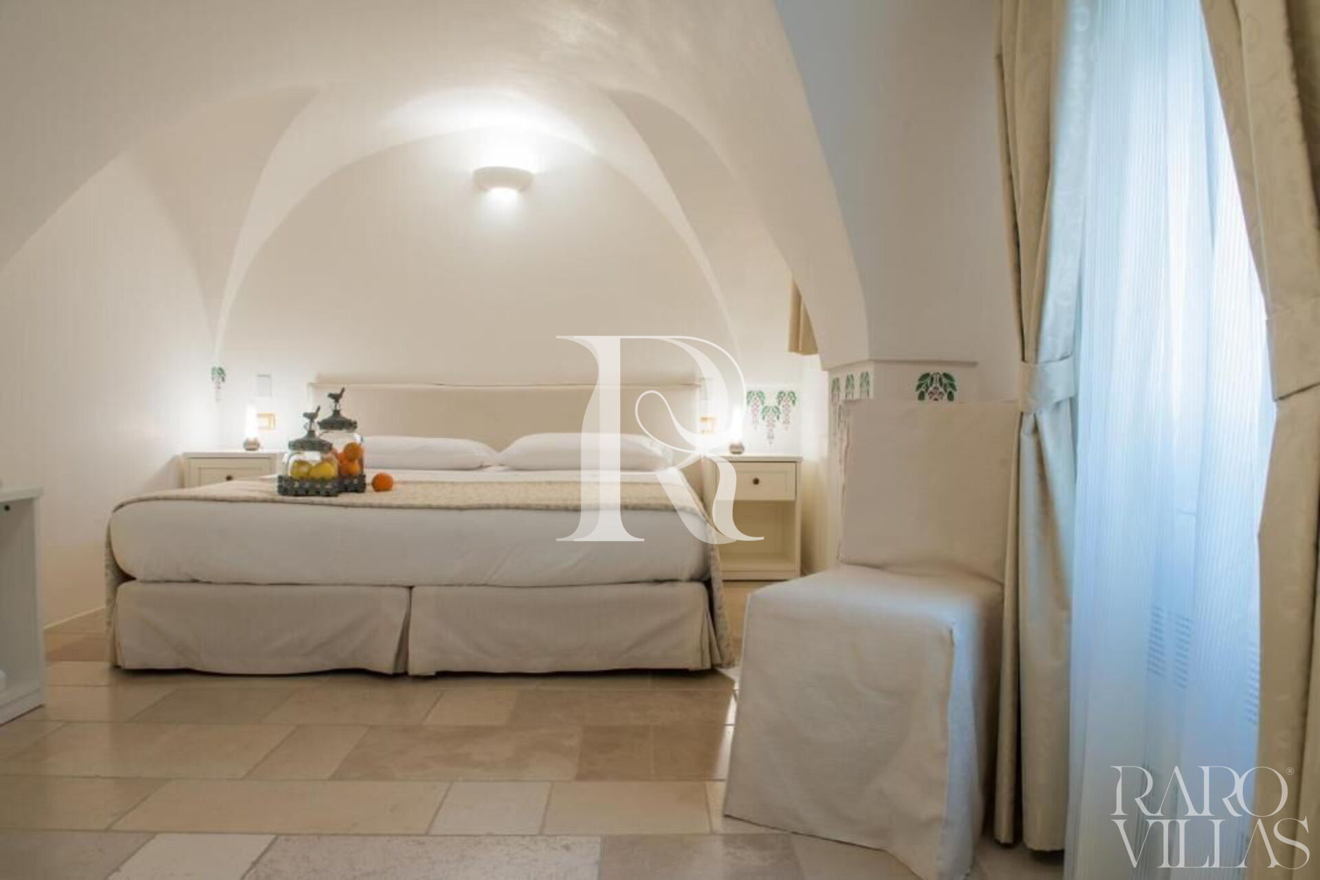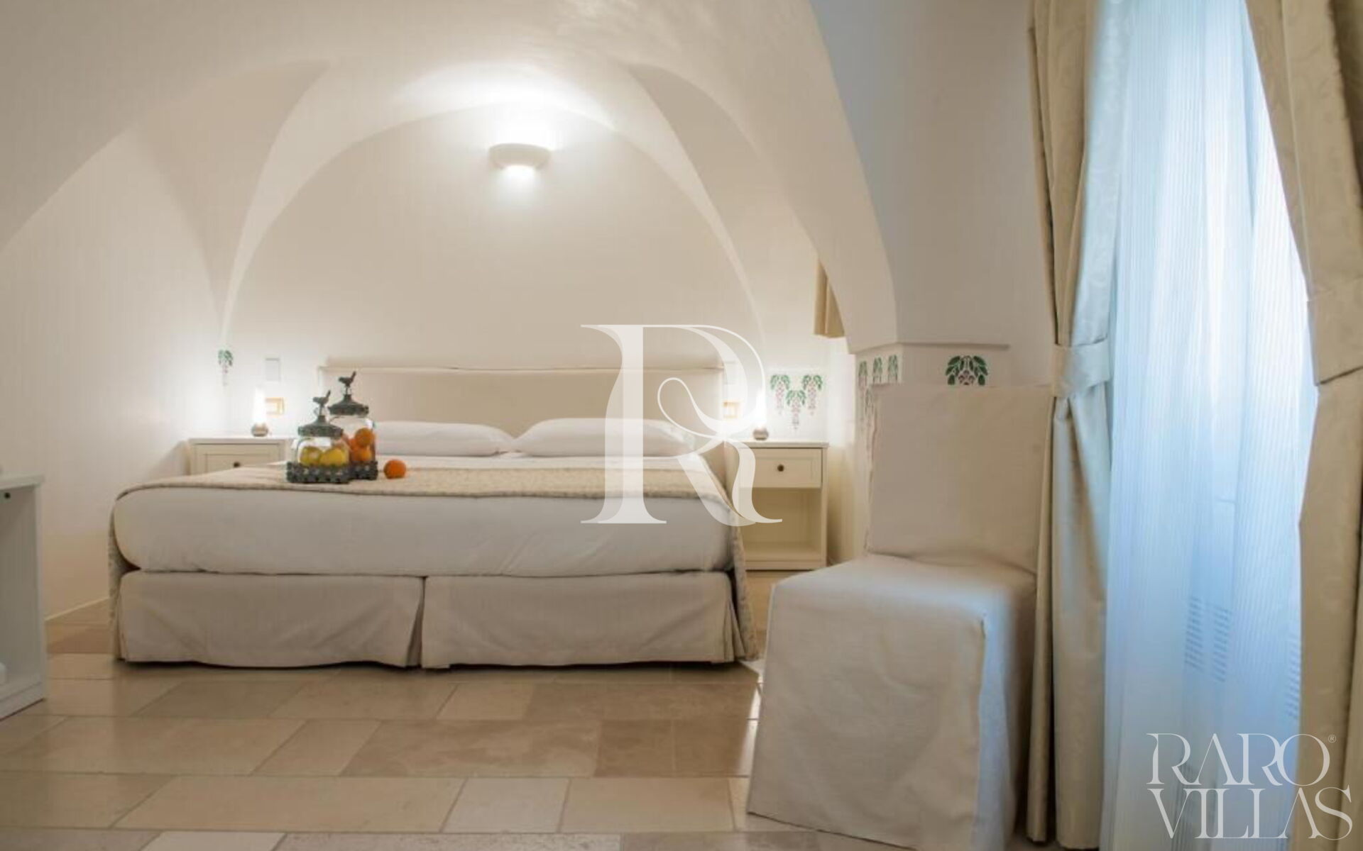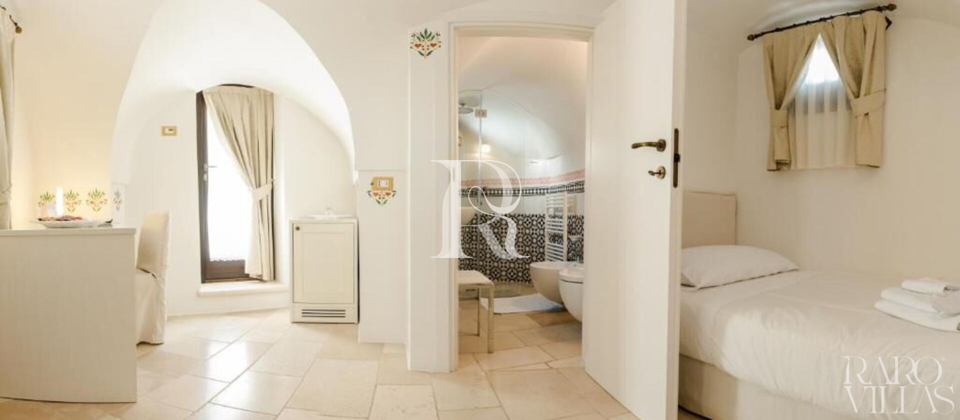 The high vaulted ceilings and the beautiful stone and light marble granite floors give the rooms an ancient and elegant air.