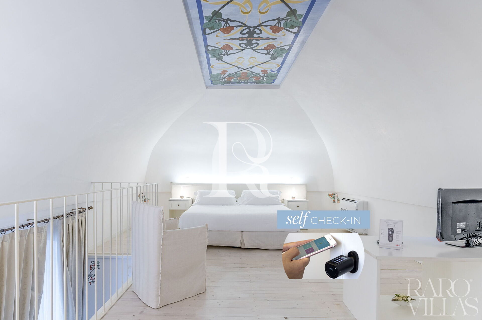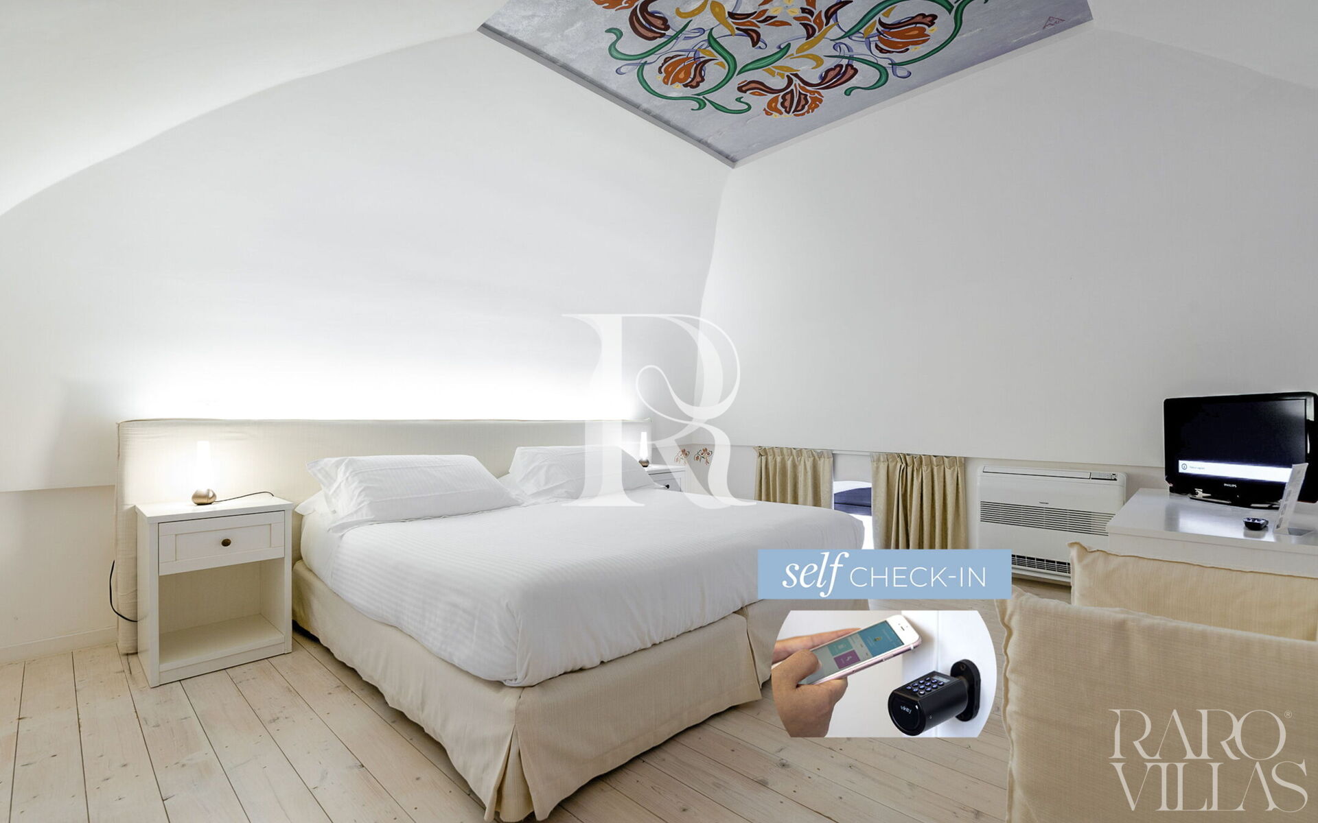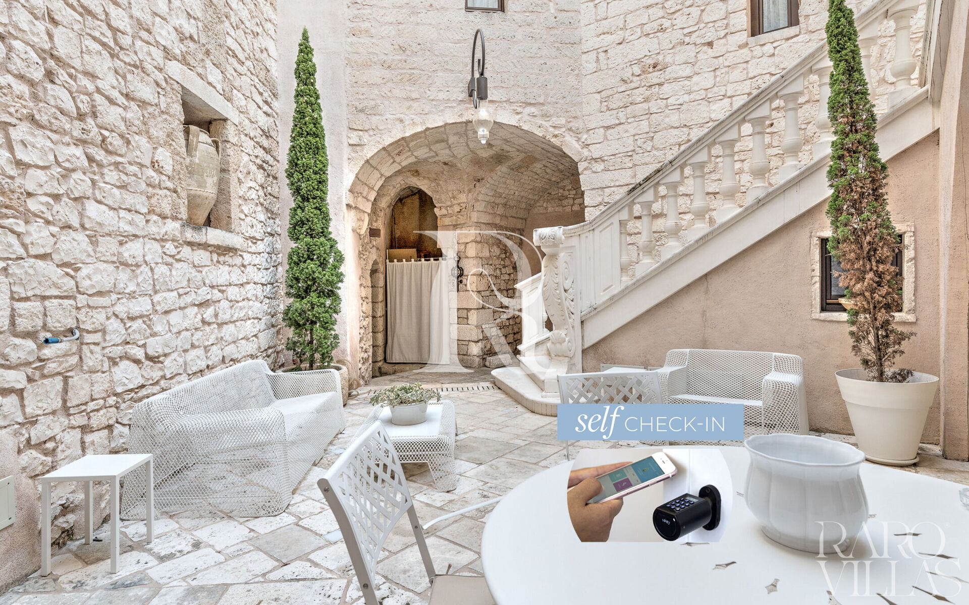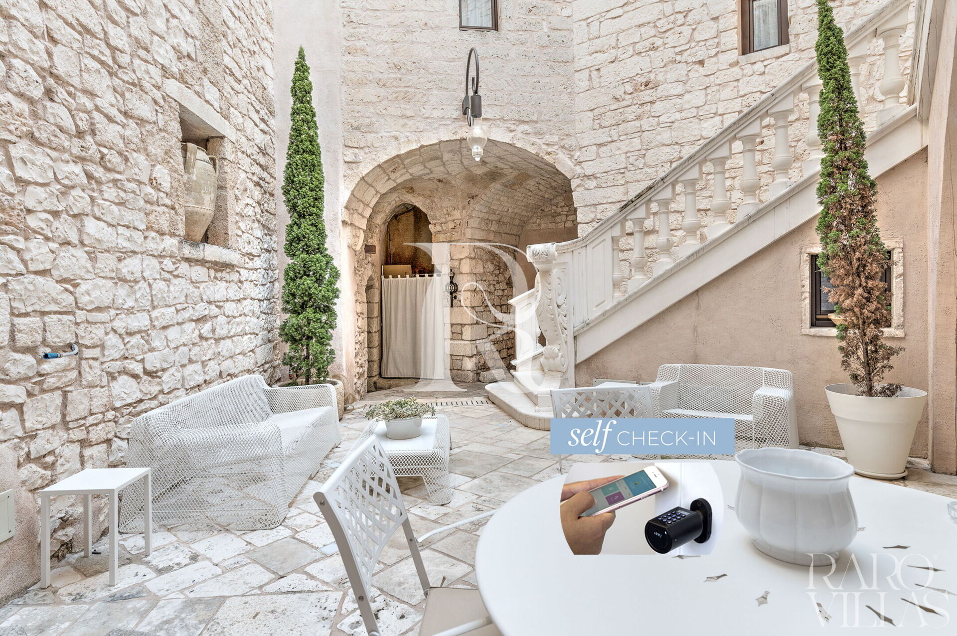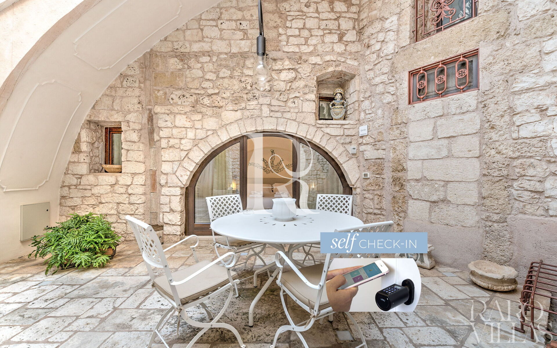 The high vaulted ceilings and the beautiful stone and light marble granite floors give the rooms an ancient and elegant air.