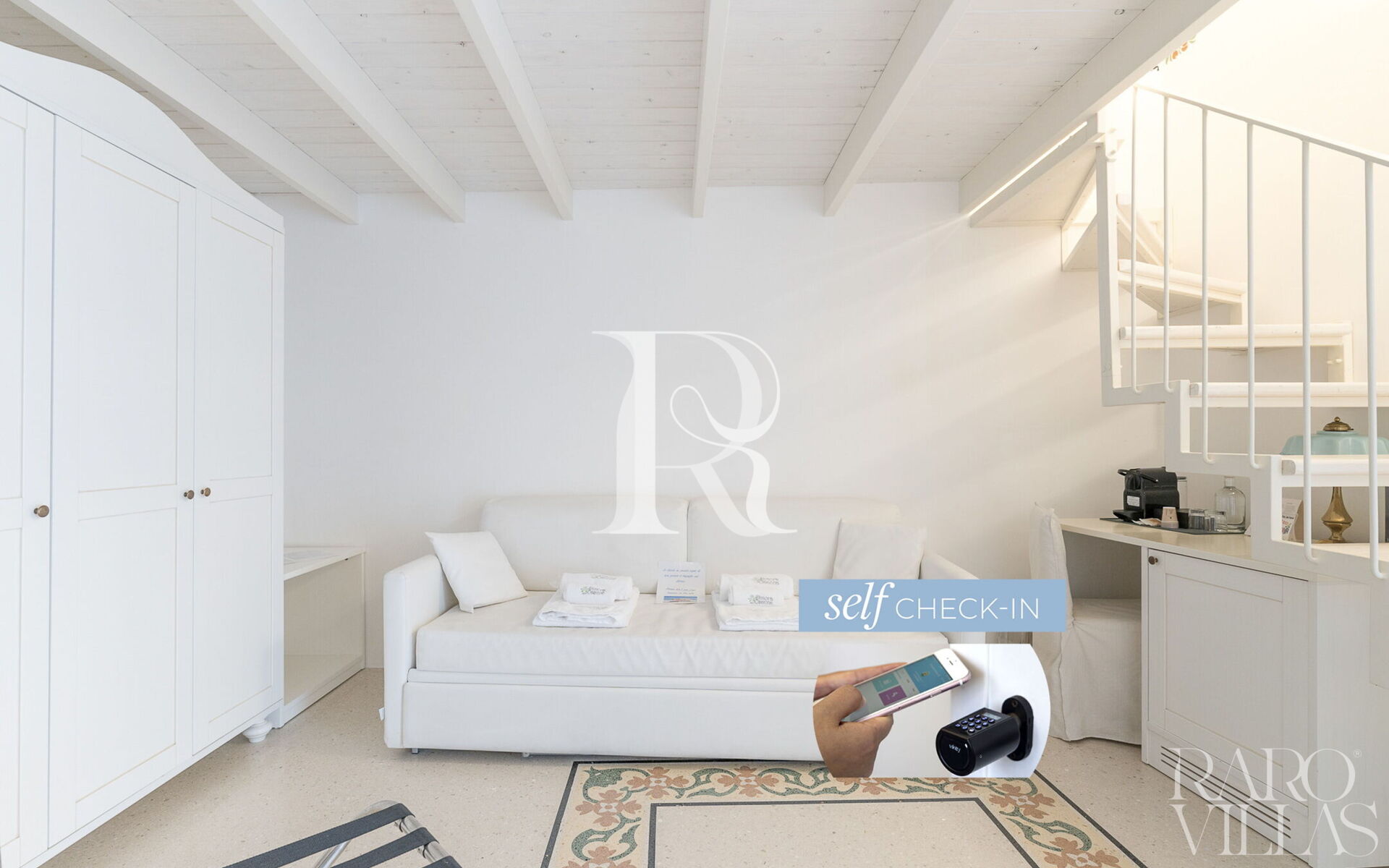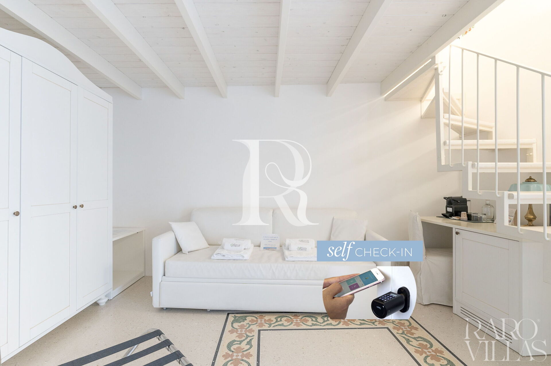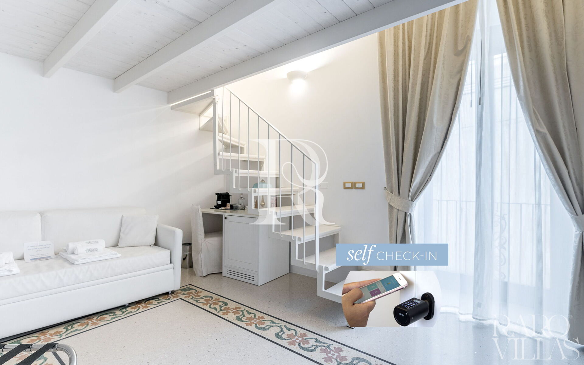 Rooms with mezzanine have access to the sleeping area with stairs.