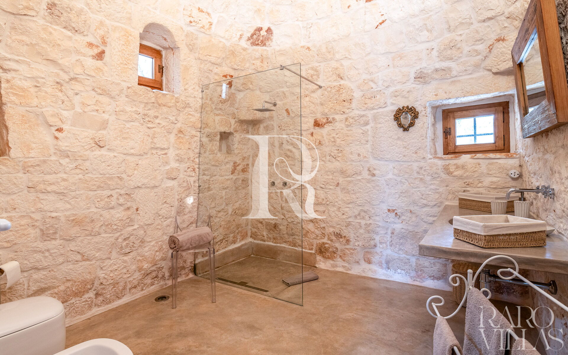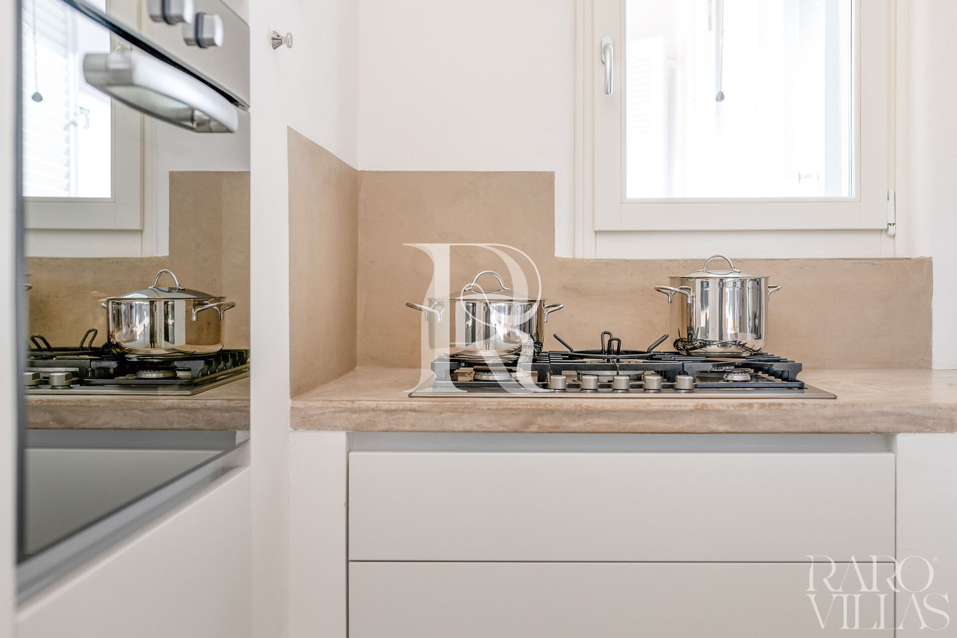 The living area houses a modern open kitchen with a large ribbon window, which offers a unique view of the trullo cones.