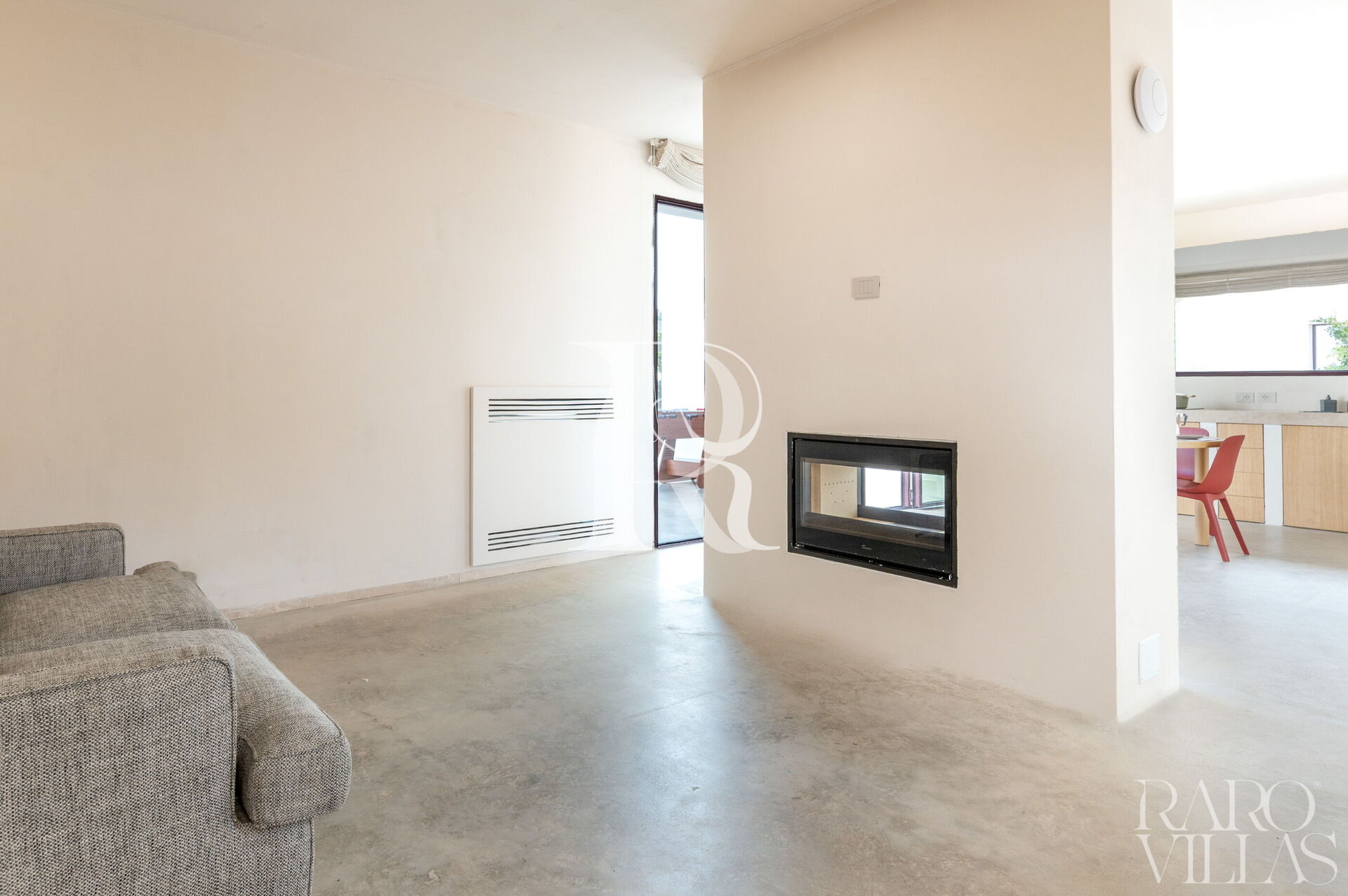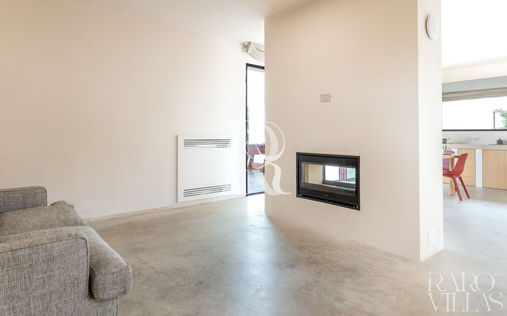 Living Area (Living & Kitchen): A welcoming open-space environment with a working fireplace, a double sofa bed for extra guests, and a dining area. The kitchen is Full Electric, equipped with an induction hob, oven, dishwasher, fridge-freezer, and dual coffee options (Nespresso capsule machine and filter coffee). The entire area is air-conditioned (with sensors to deactivate the system when doors or windows are open to support environmental sustainability) and offers direct access to the central courtyard