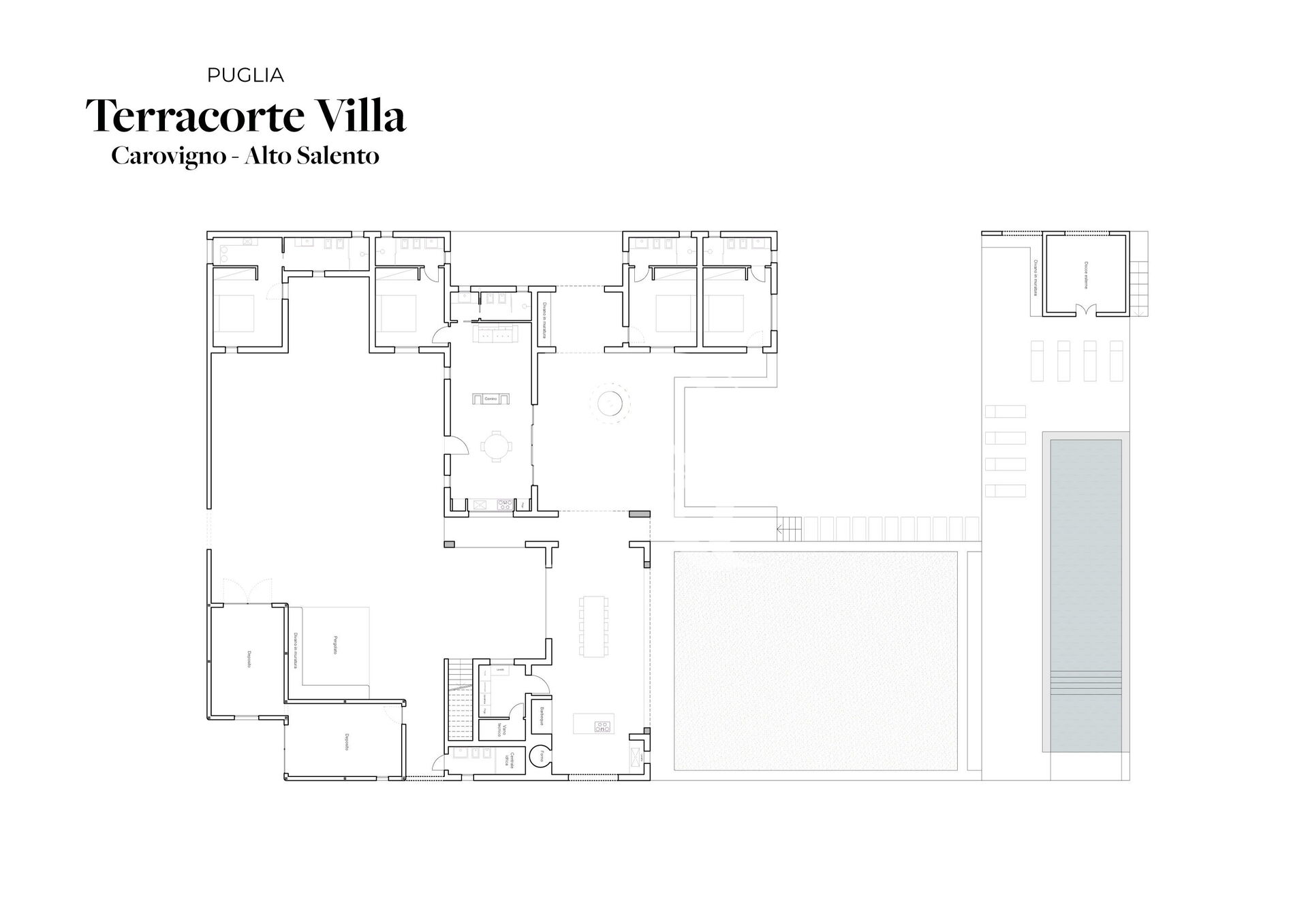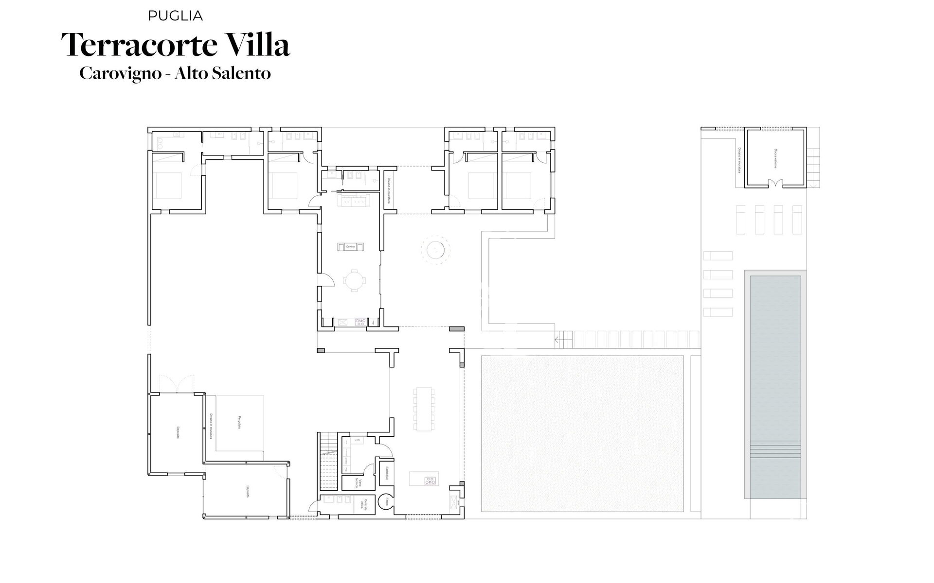The Terracorte Villa for rent accommodates up to 8 guests (with the possibility of 2 additional guests on a comfortable sofa bed). The villa features 4 elegant double bedrooms, each designed as an independent suite with its own en-suite bathroom and private access from the outside, offering the perfect balance of community and autonomy.