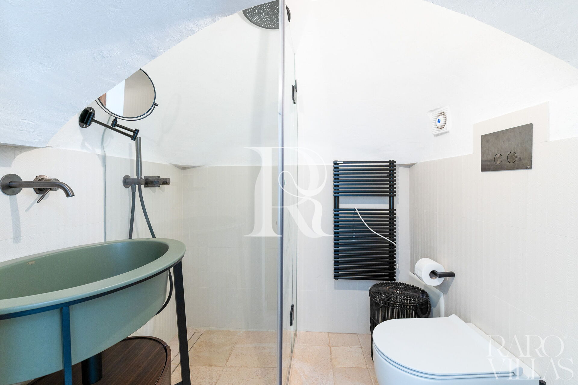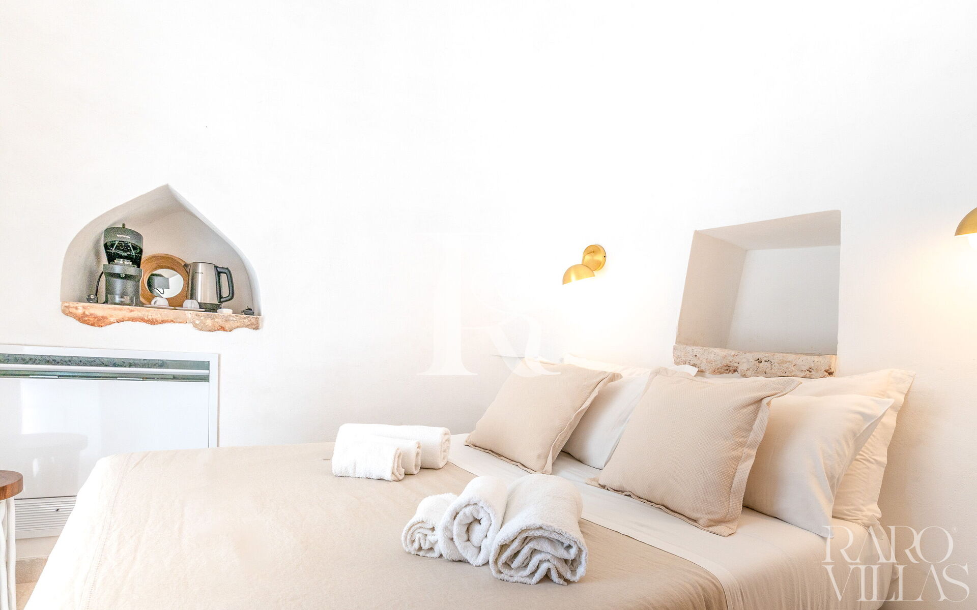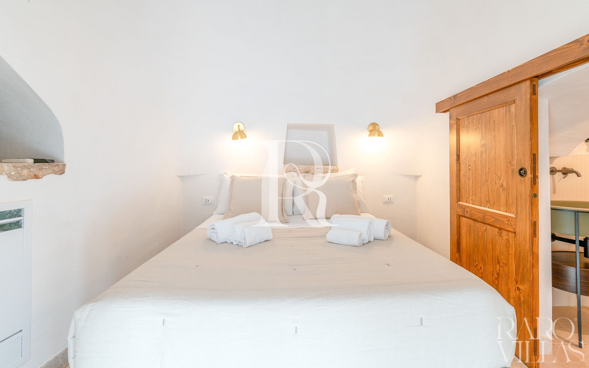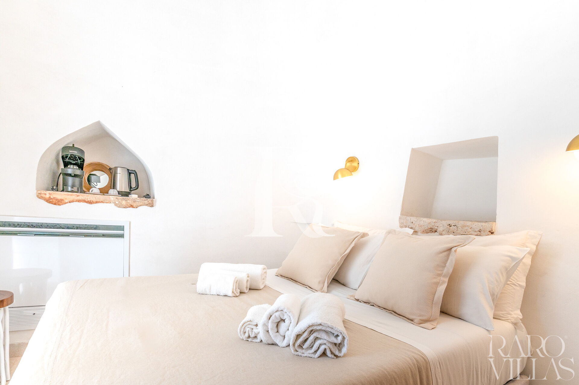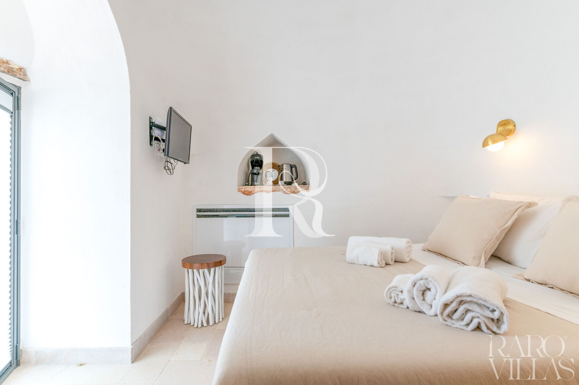 The Trullo Suite with consists of a single room with a french size bed and ensuite bathroom. It is fully equipped with a Nespresso Vertuo machine, tea kettle and a 24” smart TV.