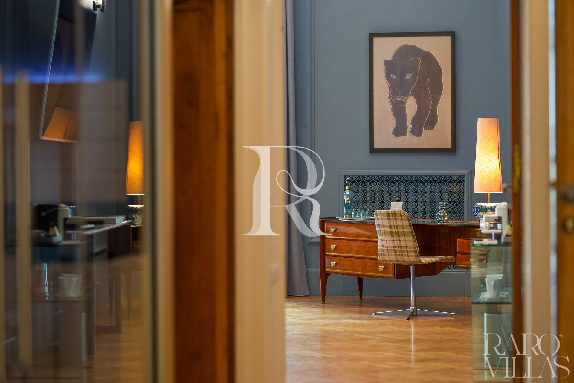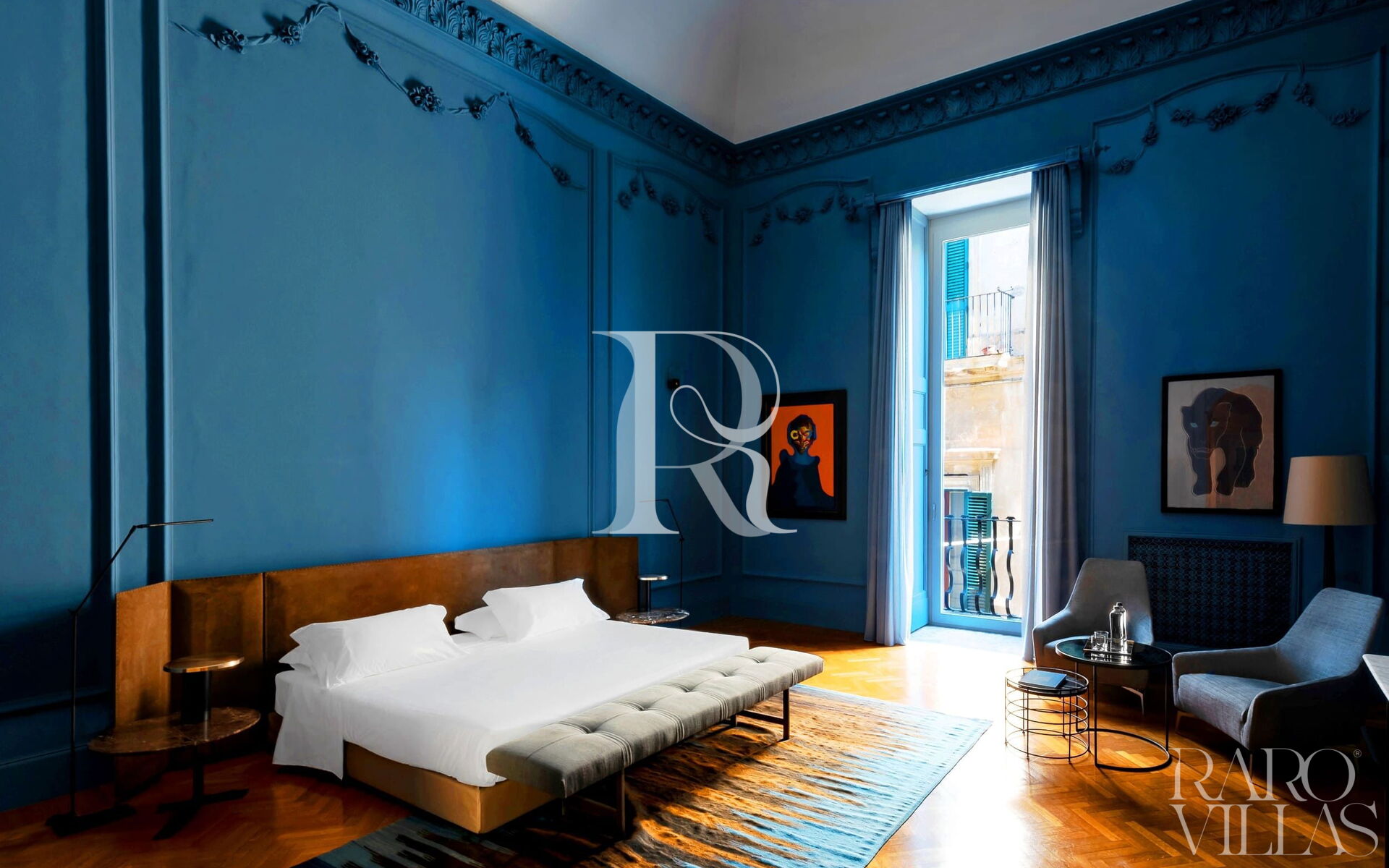 Elm wood doors, high ceilings and 18th century stuccoes create timeless elegance. The dominant color, an unusual and charming shade of blue, envelops the spaces, transforming the suite into a real movie set. Contemporary furniture and refined accessories give a touch of modernity and glamour.