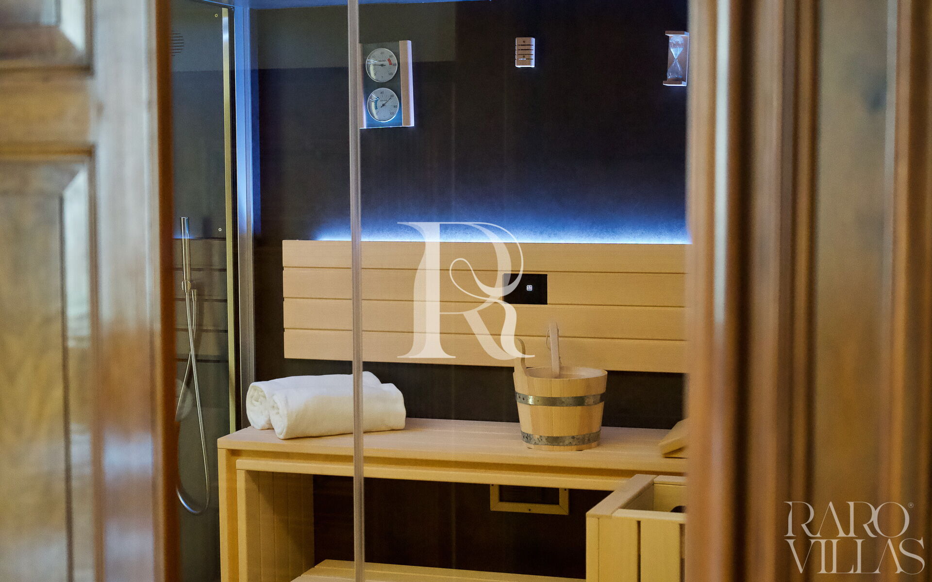 This luxury retreat boasts a spacious double room, enhanced by a private balcony offering stunning views. The bathroom, elegant and functional, is equipped with a modern shower and a double sink, while a chic private sauna cabin completes the experience, giving moments of pure relaxation.
