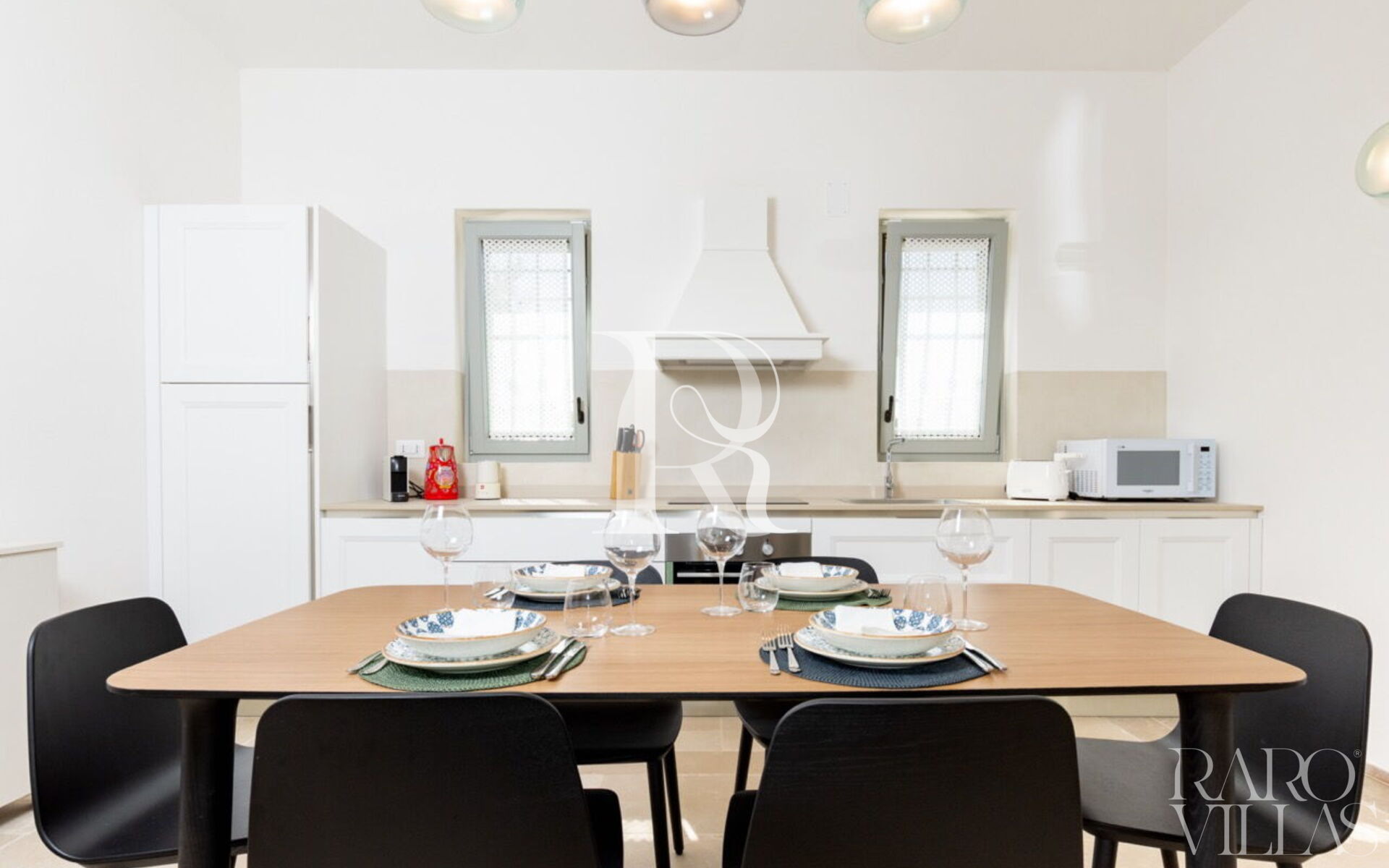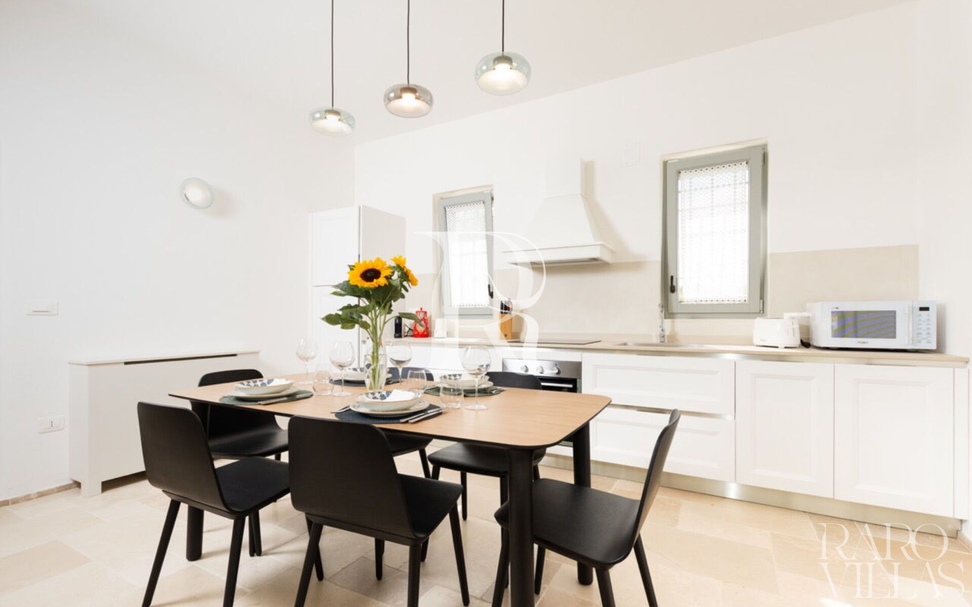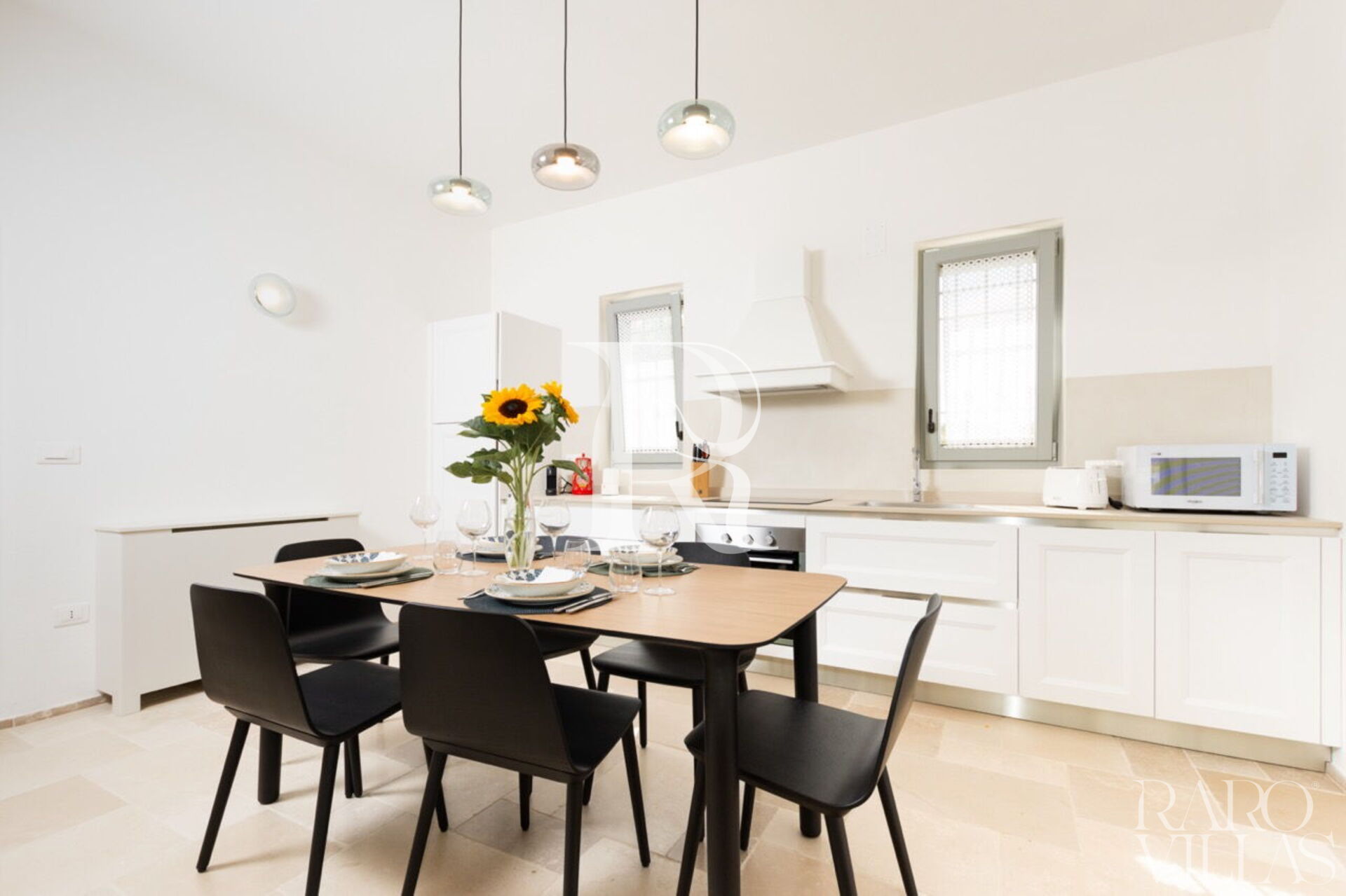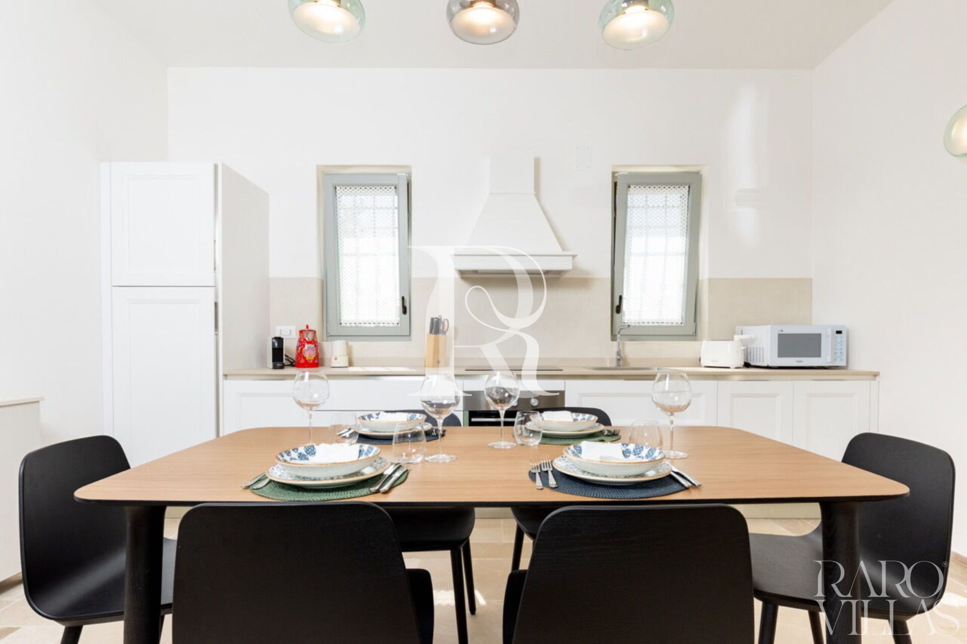 The villa for rent is made up of the historic 4-cone Trullo and the more modern extension and can accommodate up to 6 people, in three bedrooms (divided into two units). The entrance with a living area and well-equipped kitchen complete the Trullo for rent.