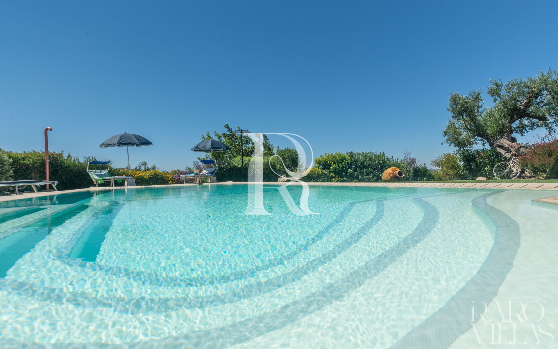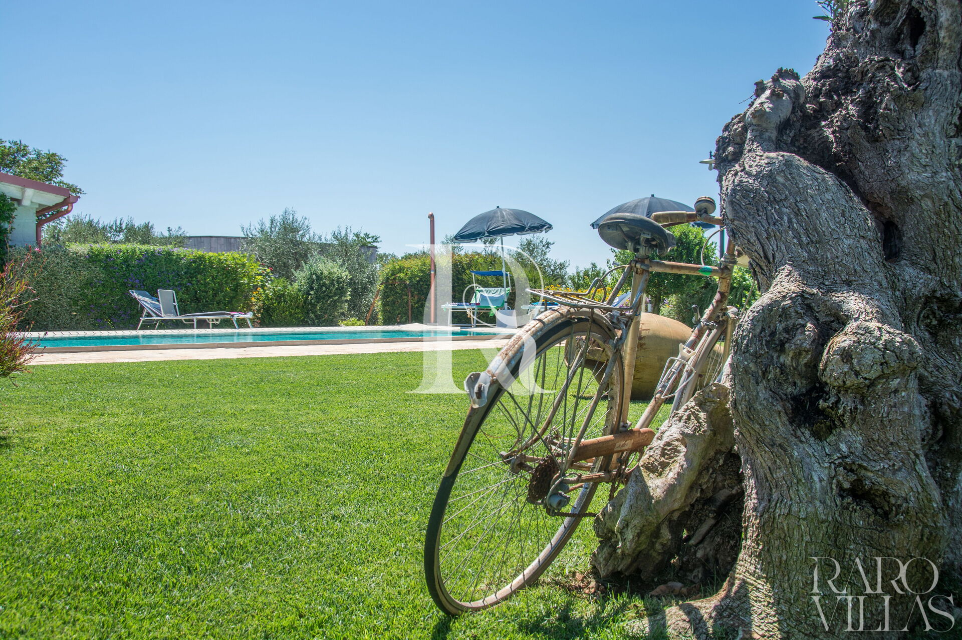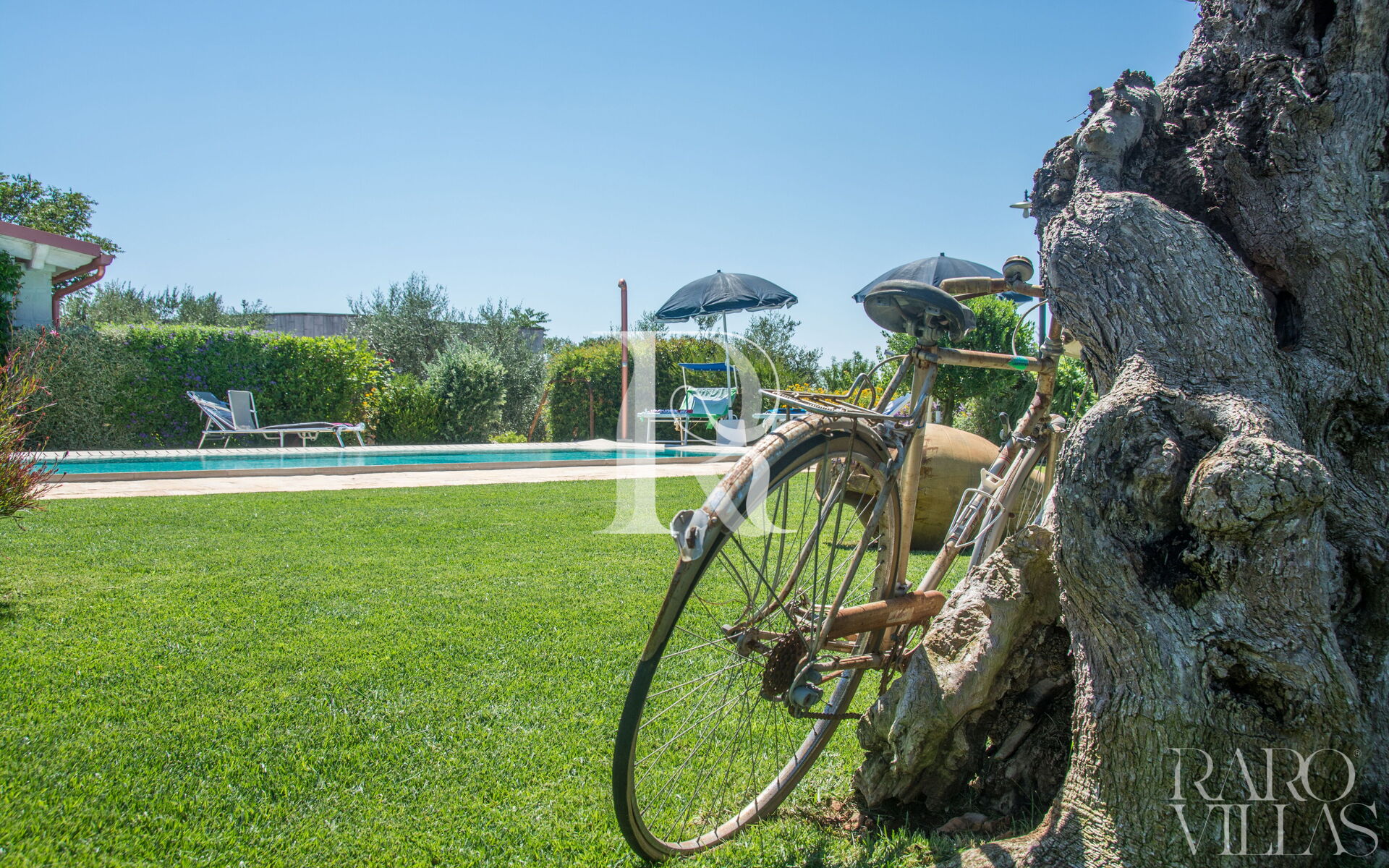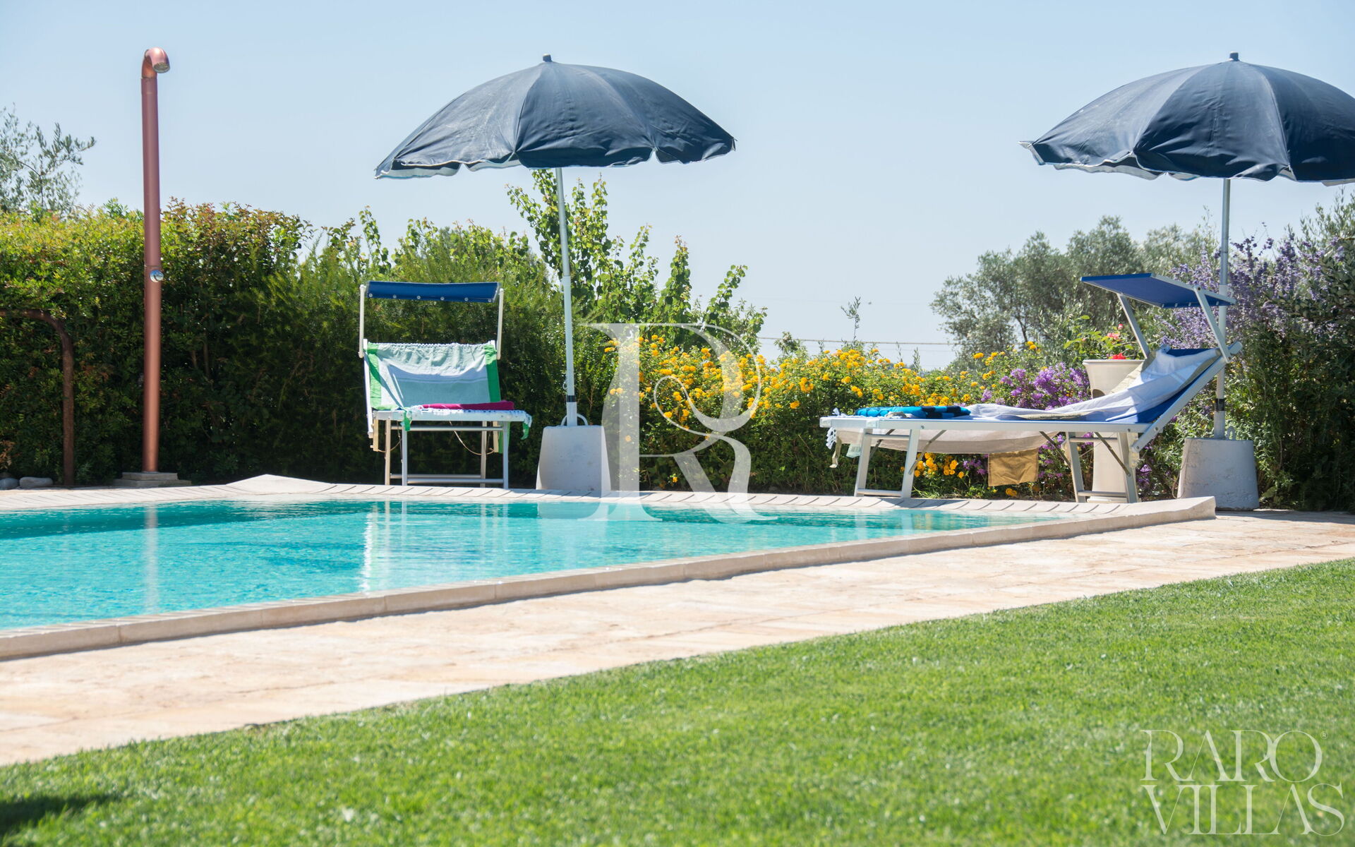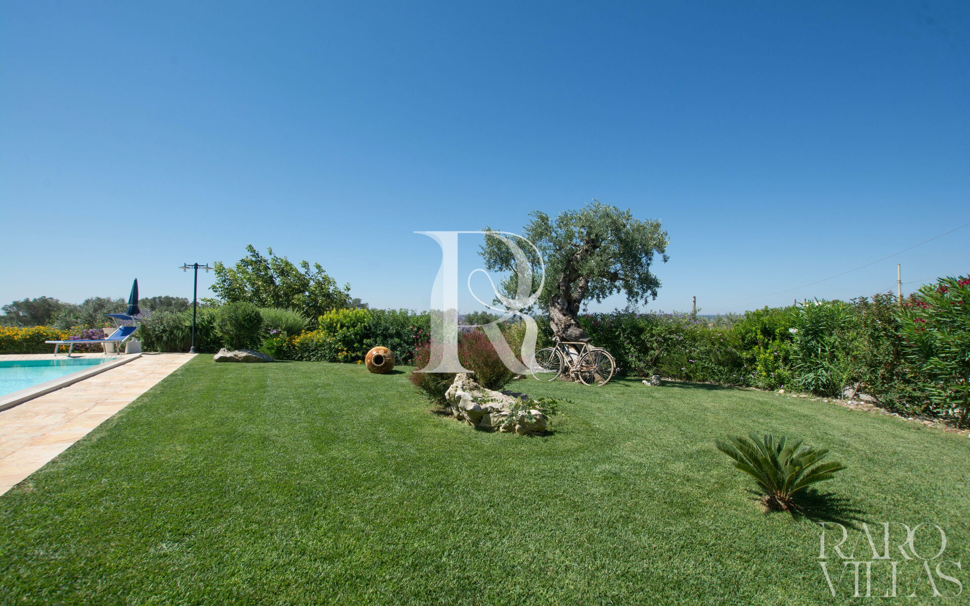 The pool area is surrounded by an English lawn and equipped with loungers where you can enjoy maximum relaxation.