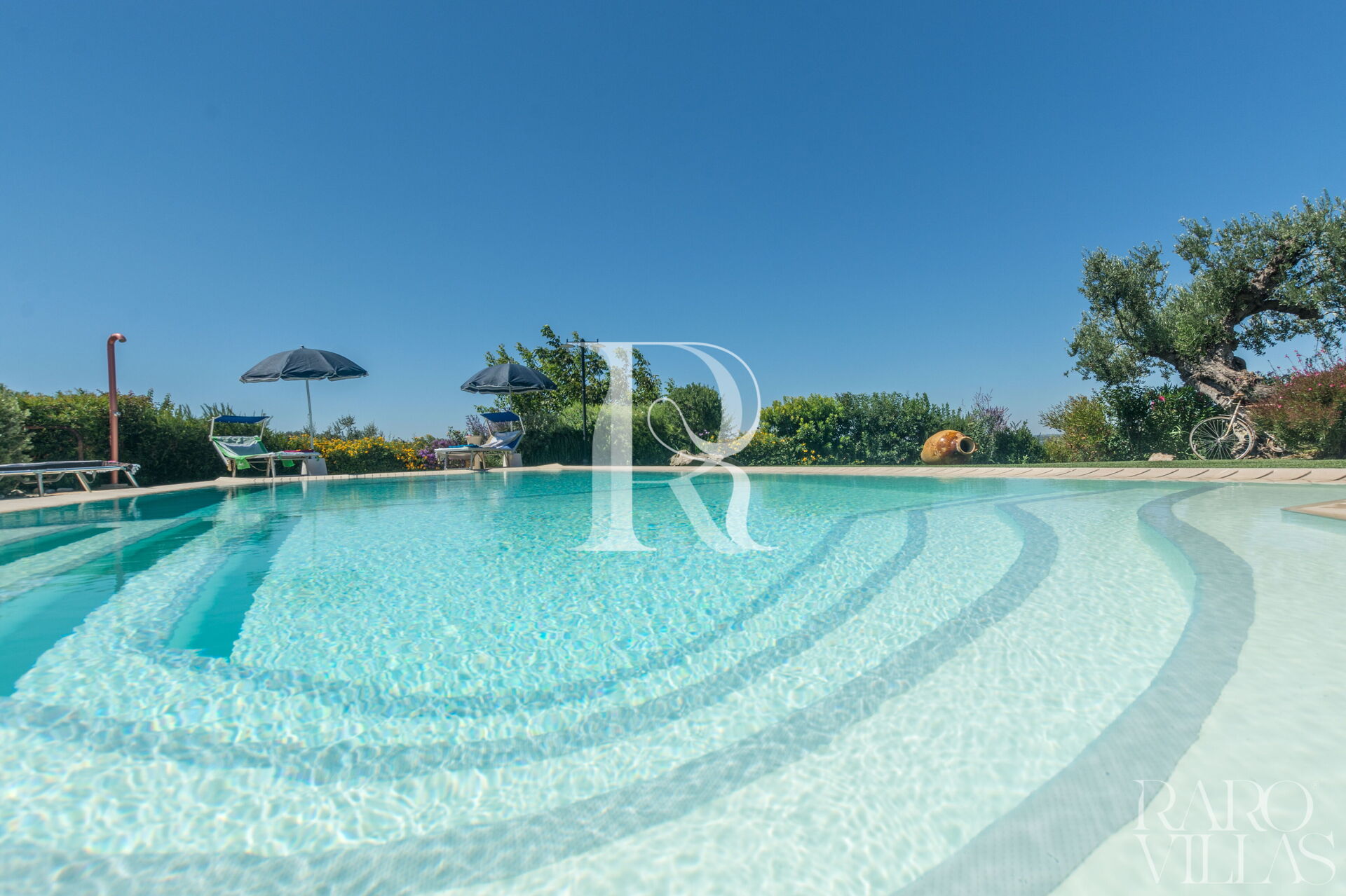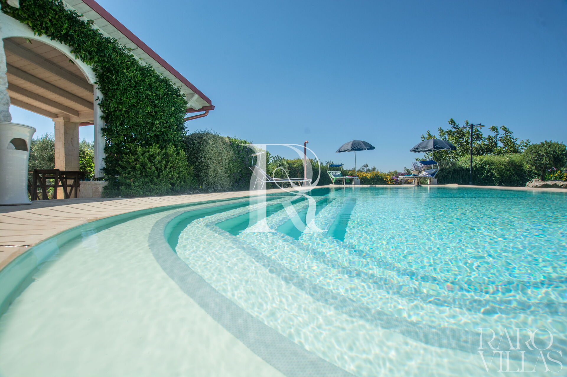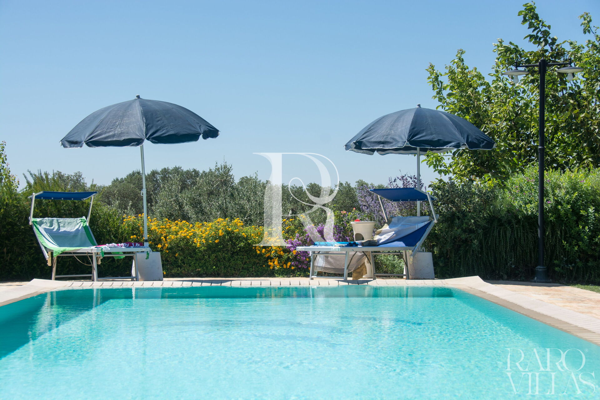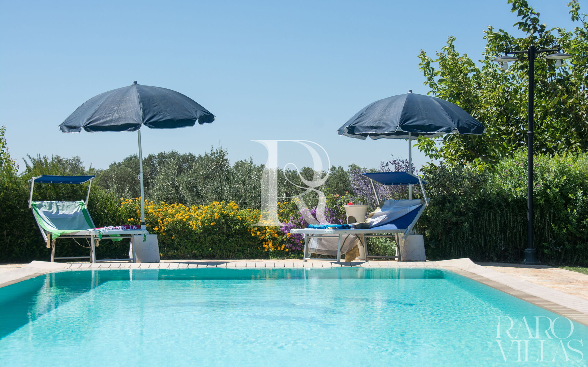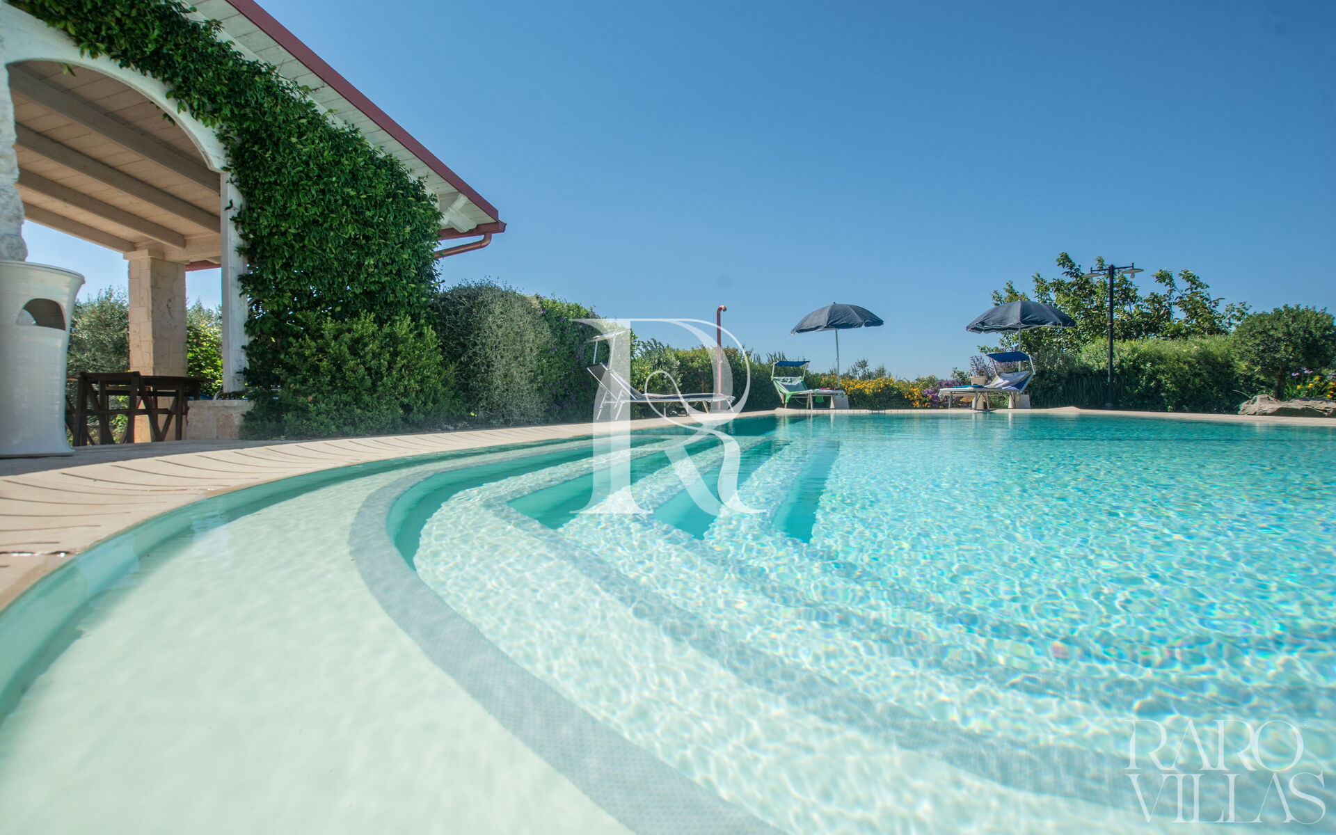 The pool area is surrounded by an English lawn and equipped with loungers where you can enjoy maximum relaxation.