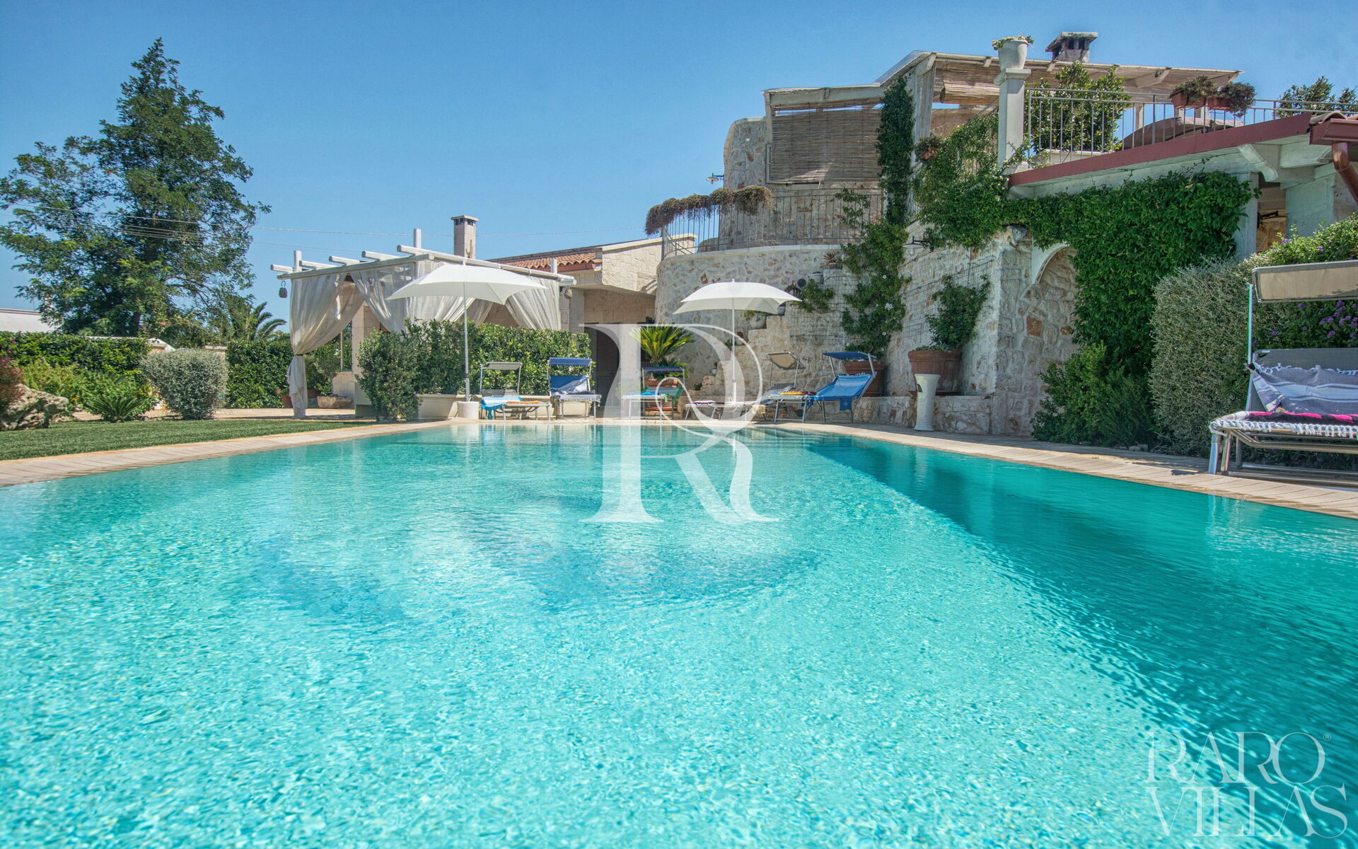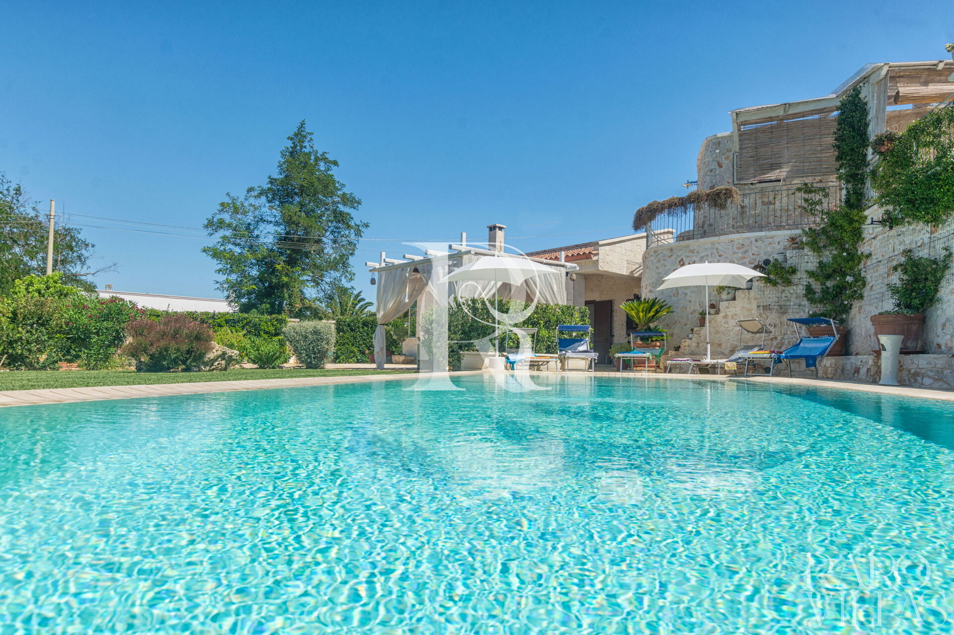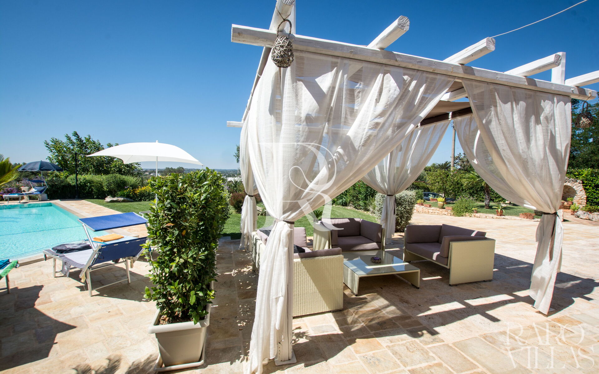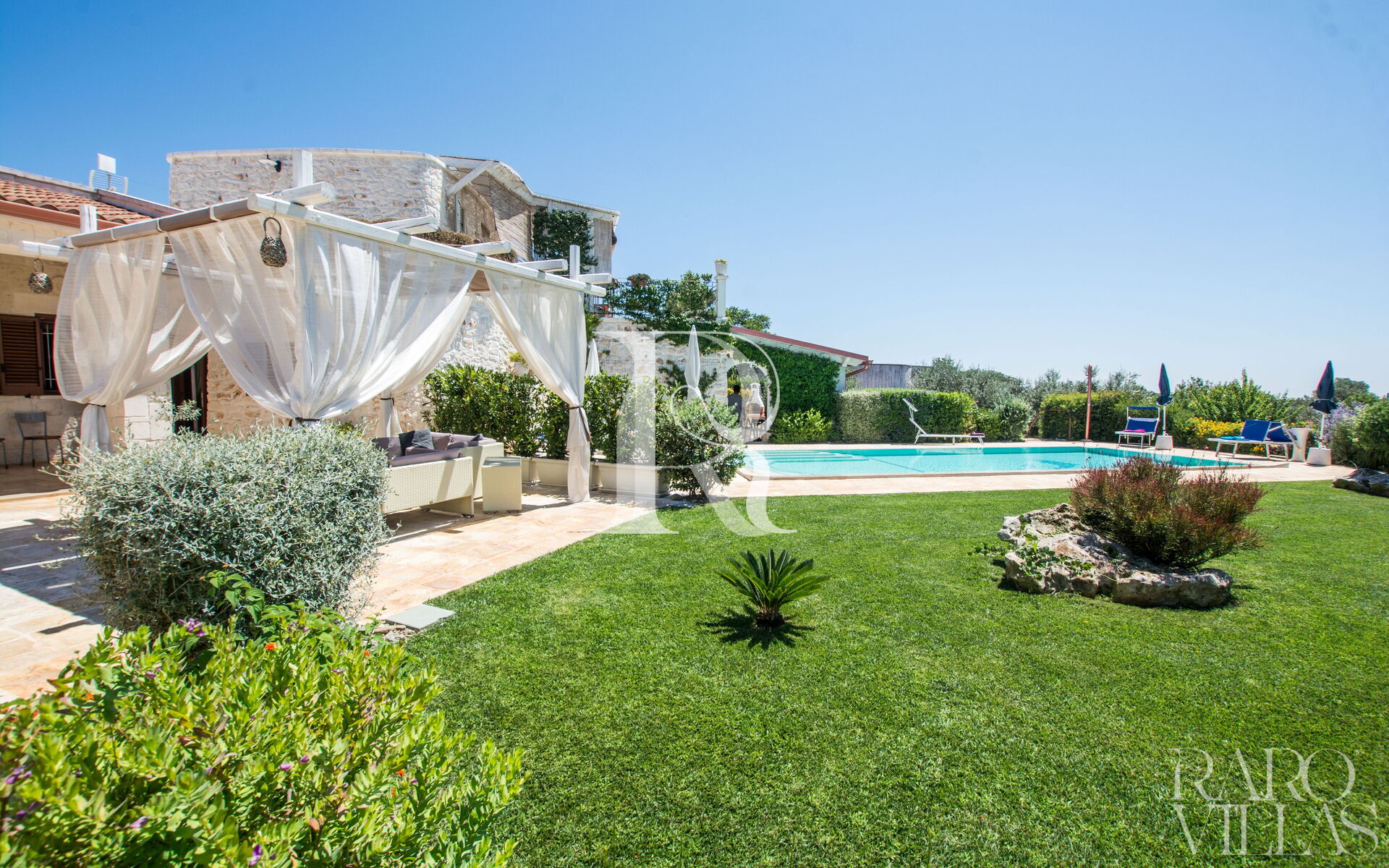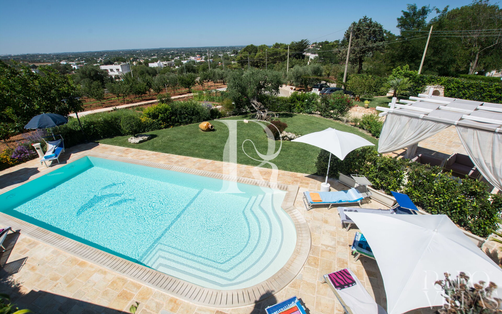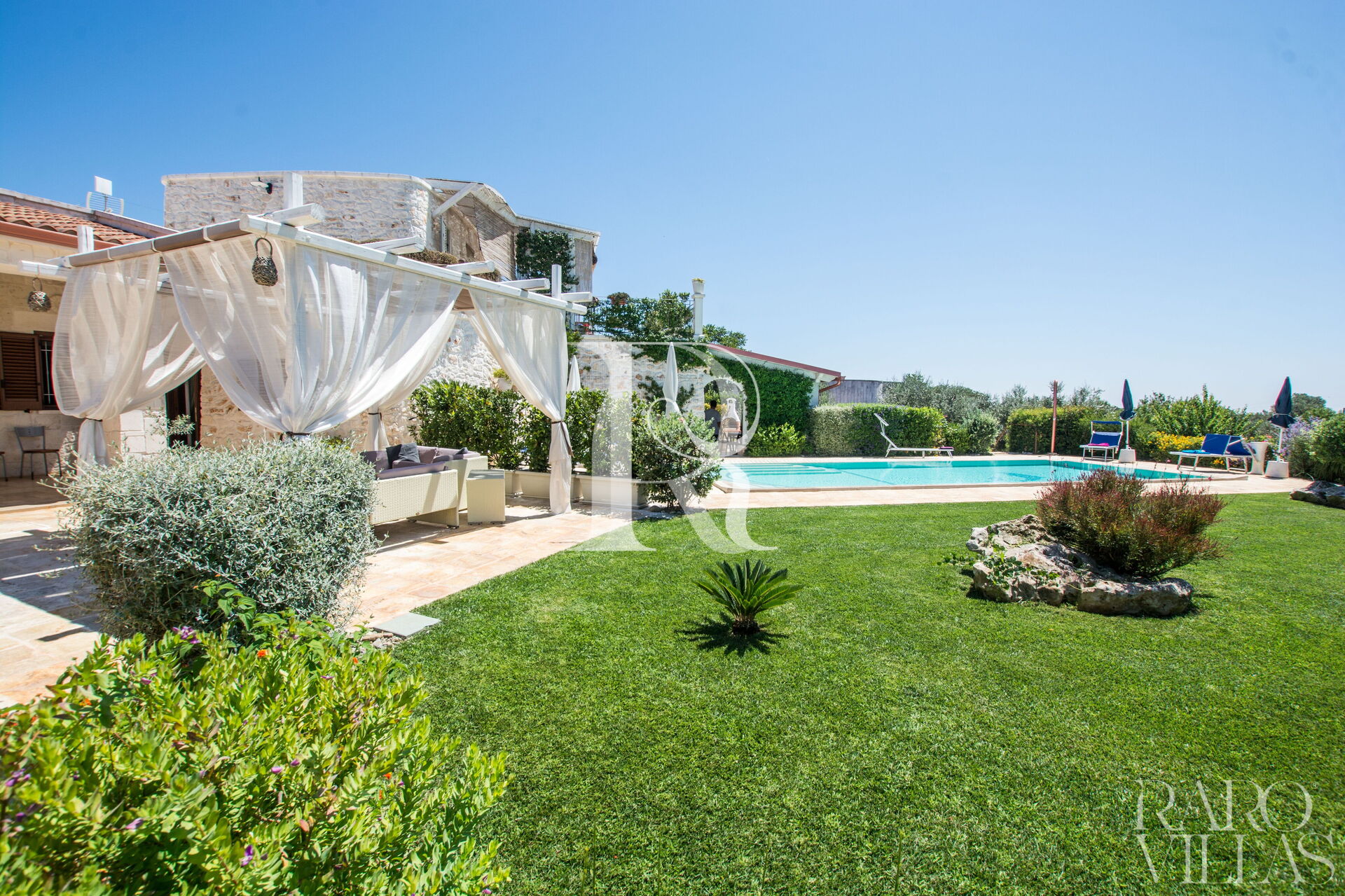 The pool area is surrounded by an English lawn and equipped with loungers where you can enjoy maximum relaxation.